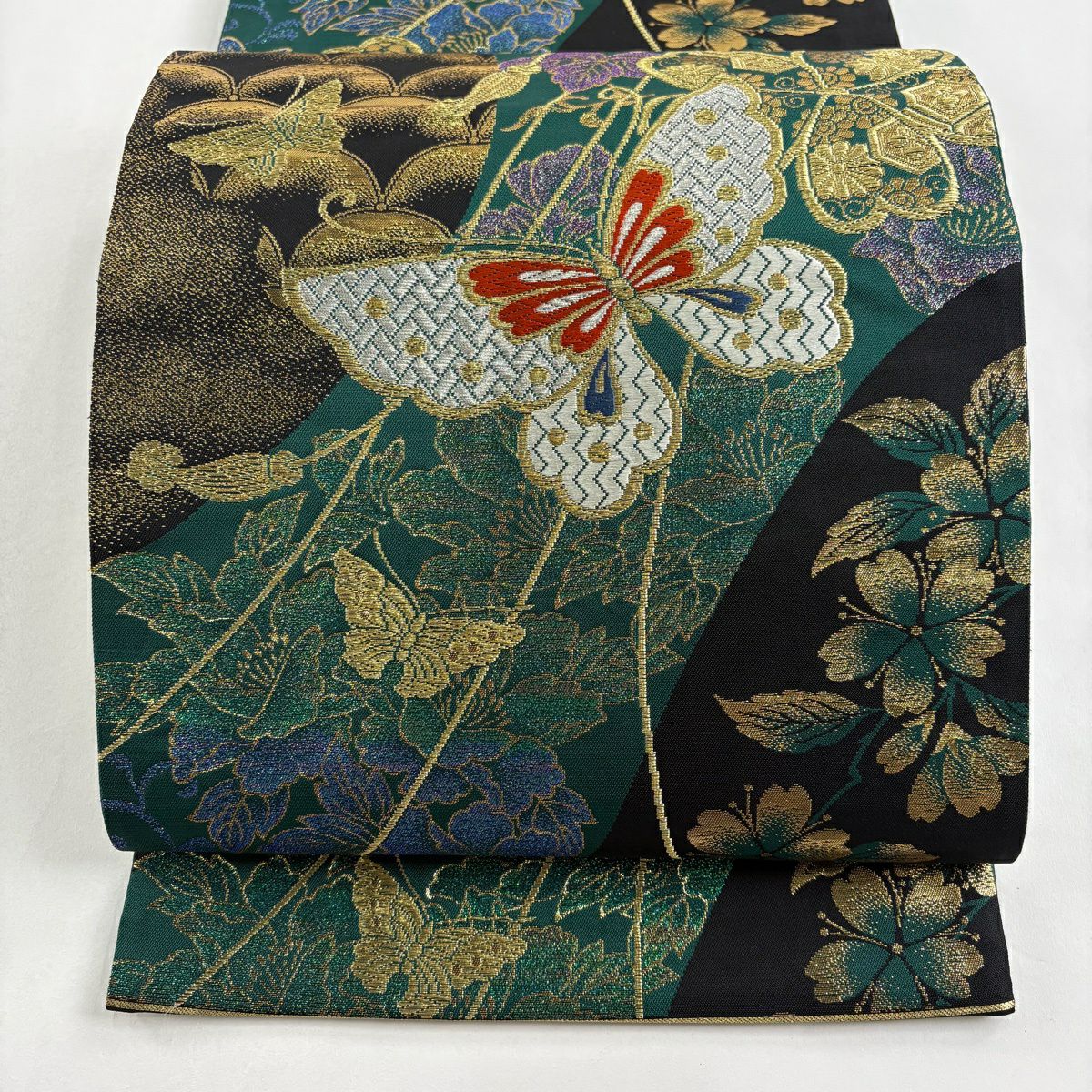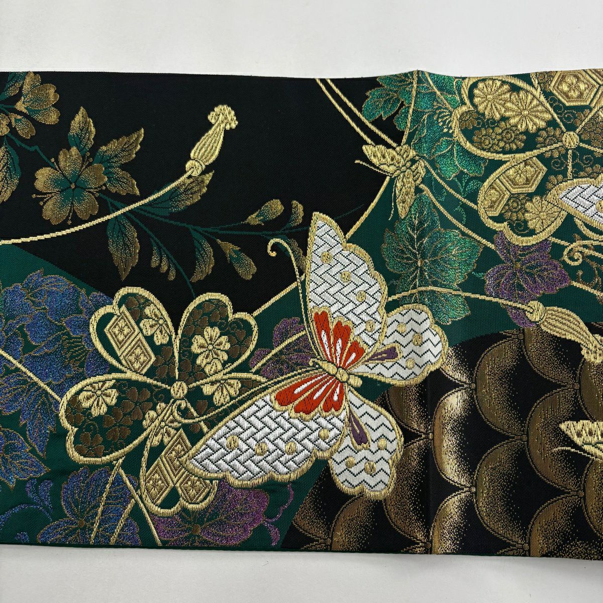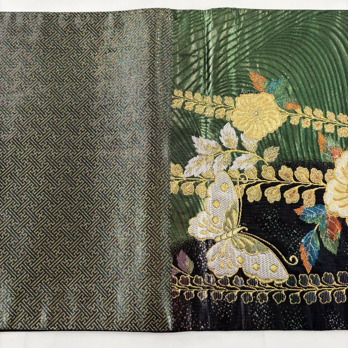 袋帯 秀品 草花 蝶 金糸 箔 緑 六通 正絹