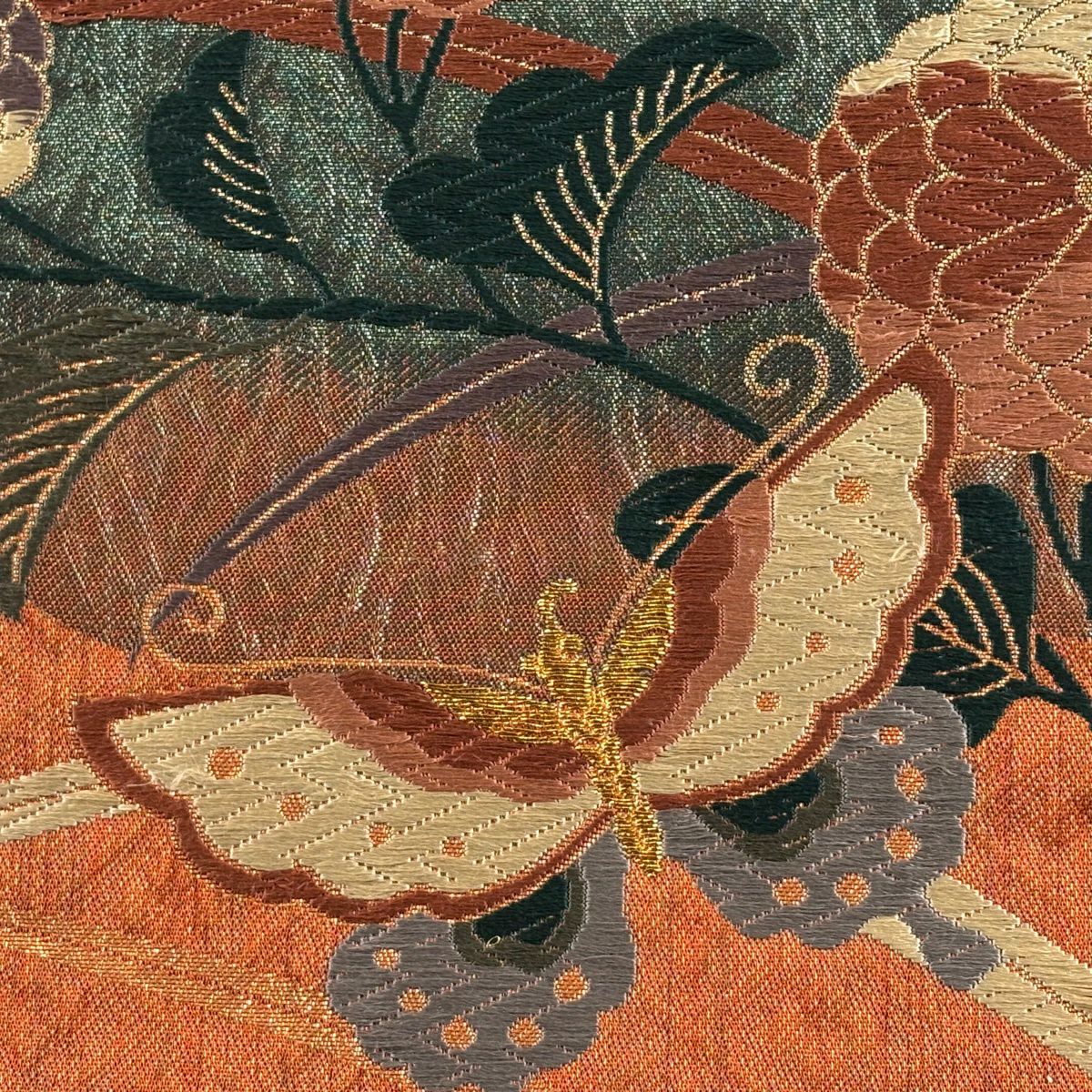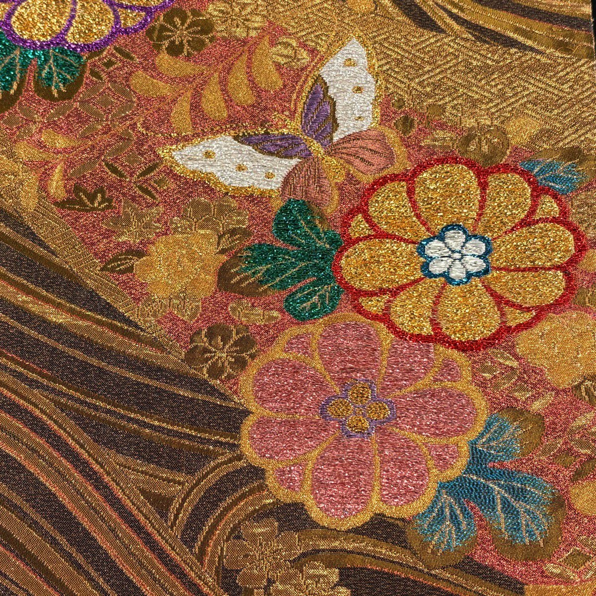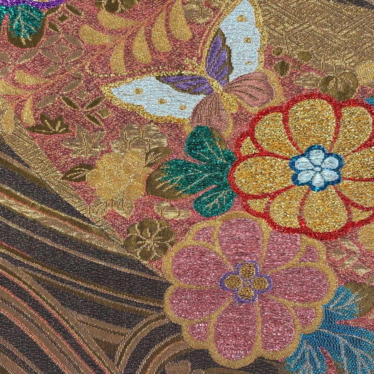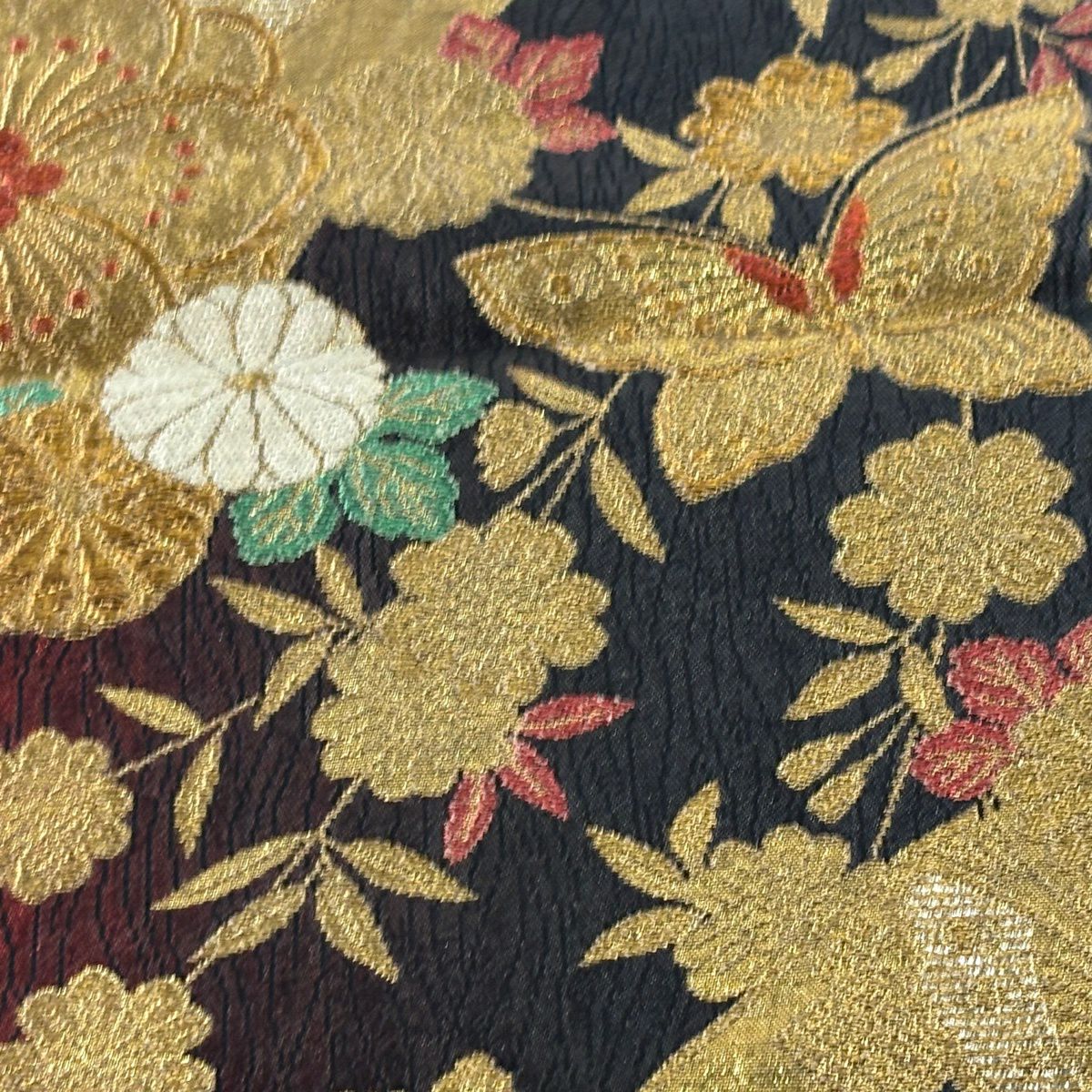 袋帯 秀品 蝶 菊 唐織 箔 赤茶 六通 正絹