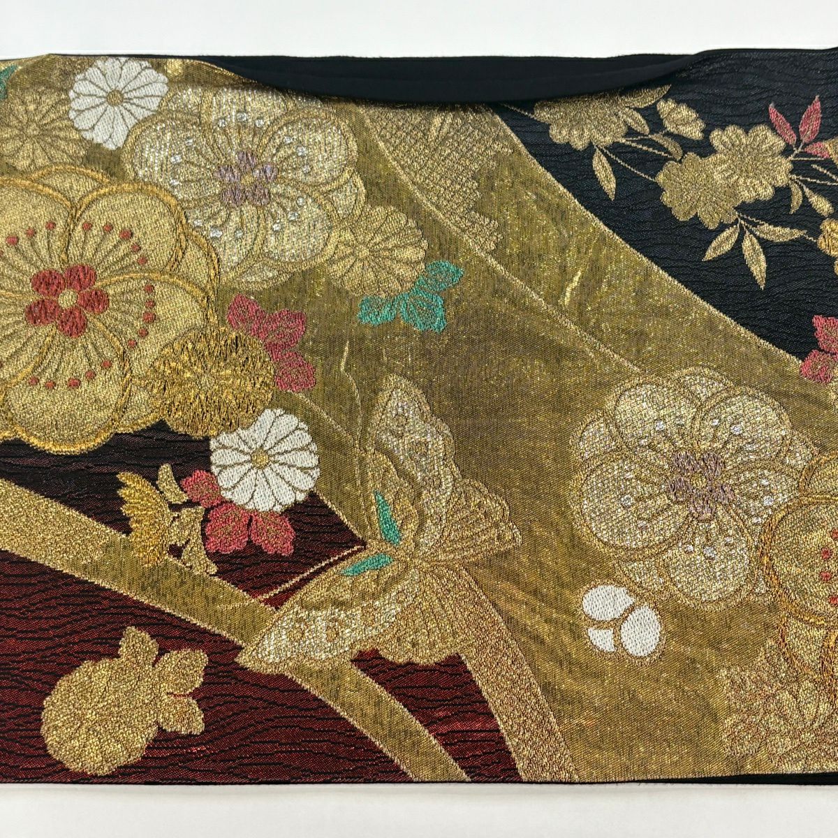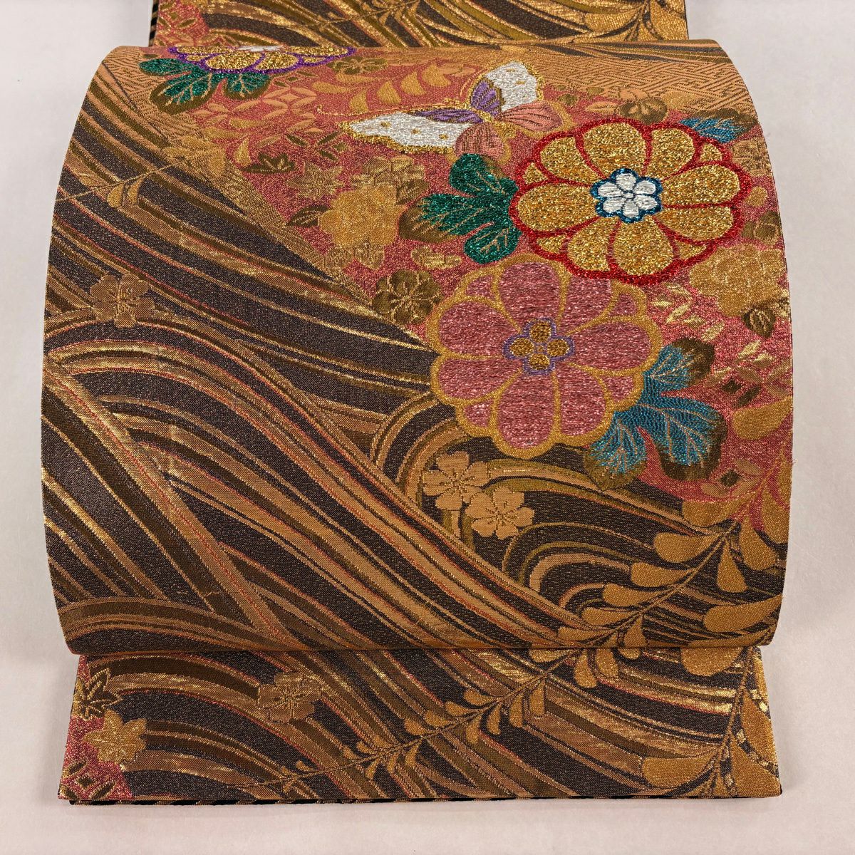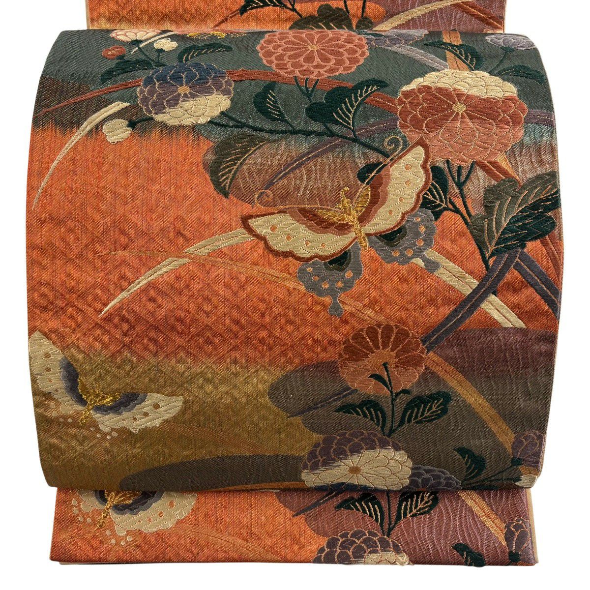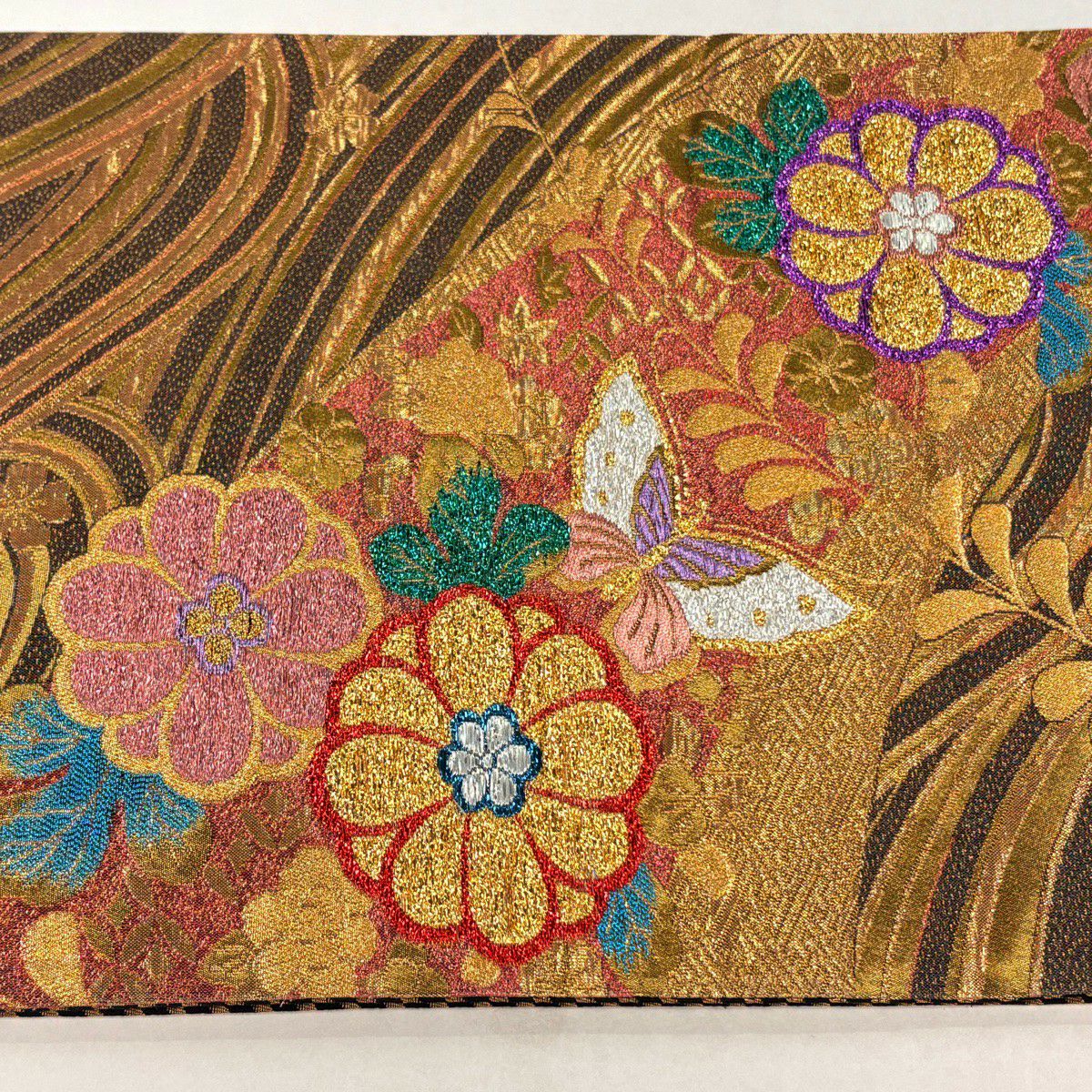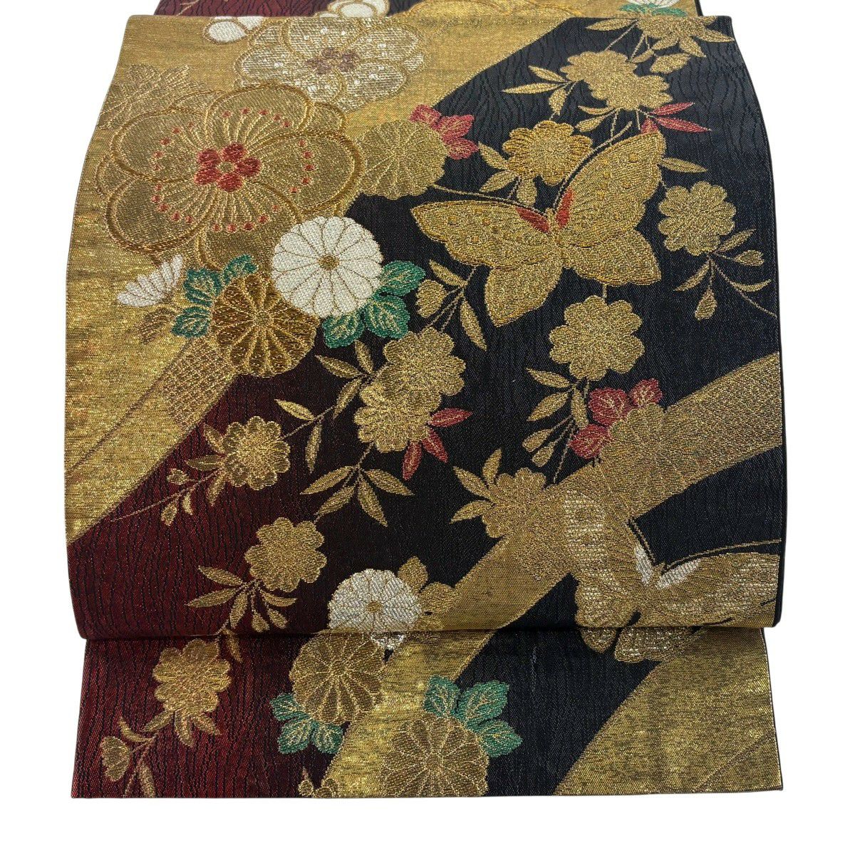 袋帯 秀品 蝶 菊 唐織 箔 赤茶 六通 正絹