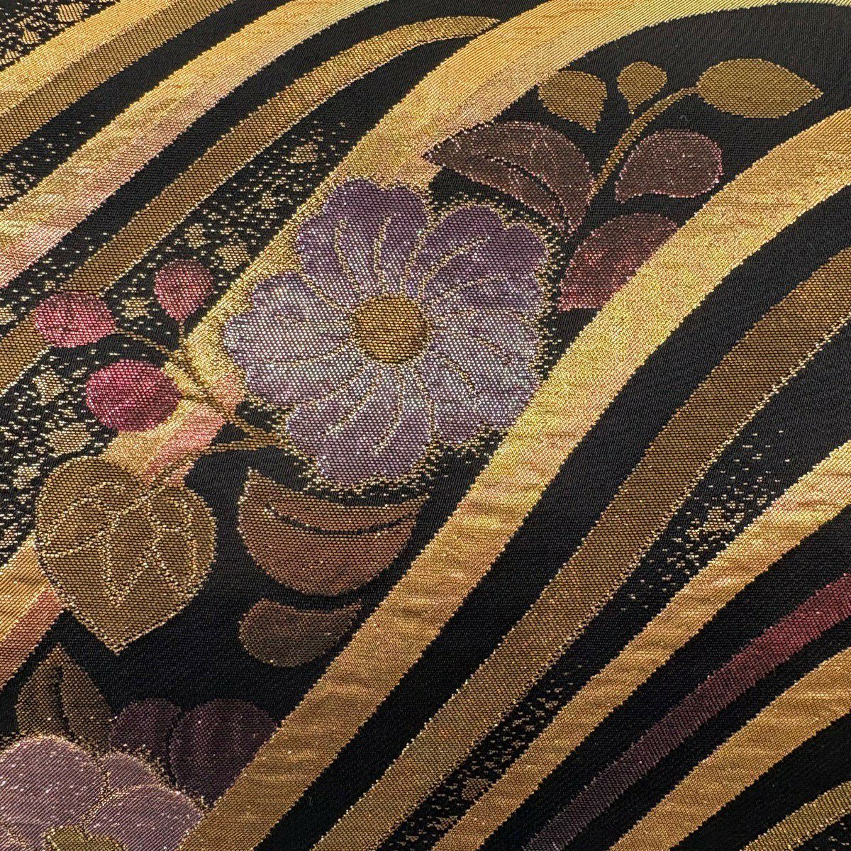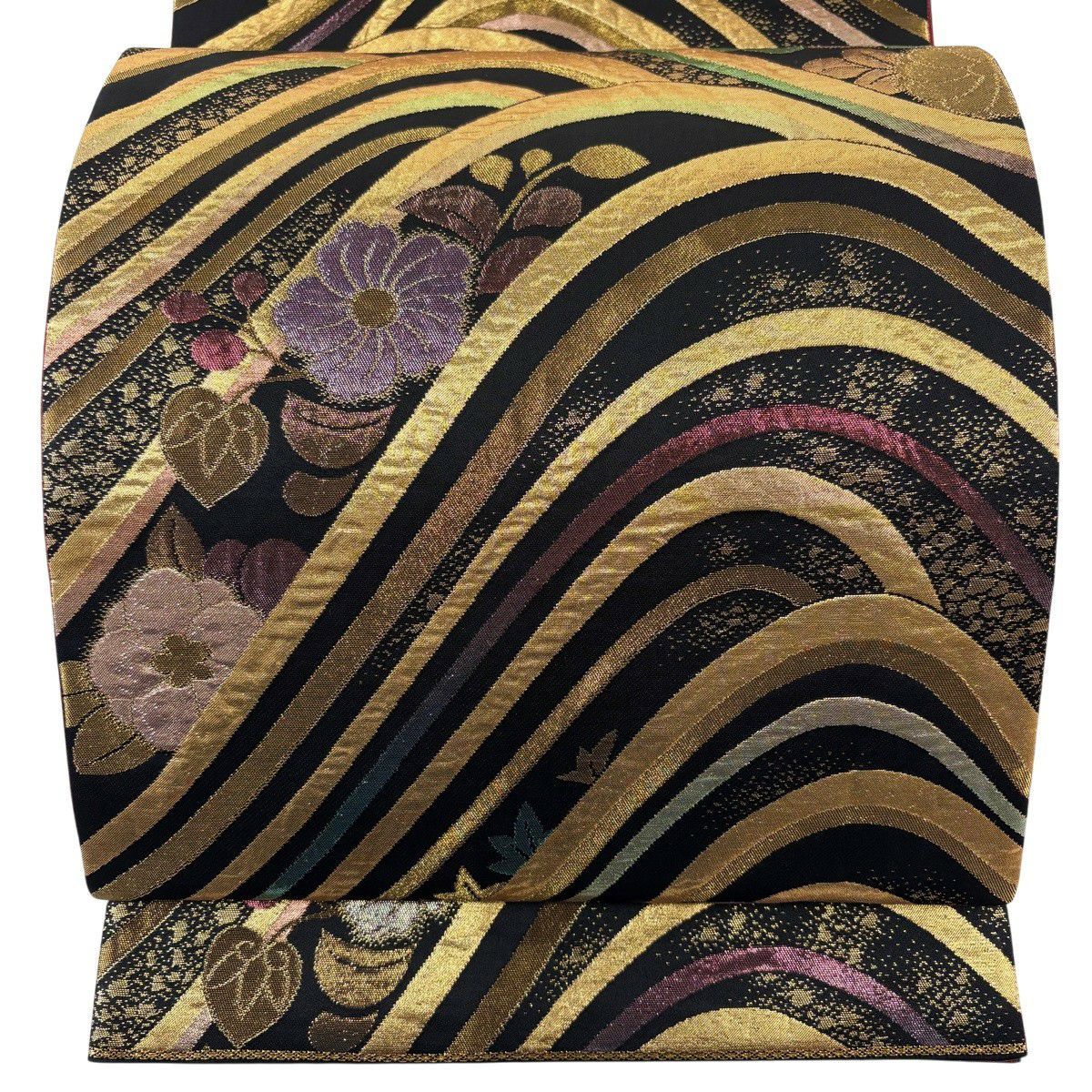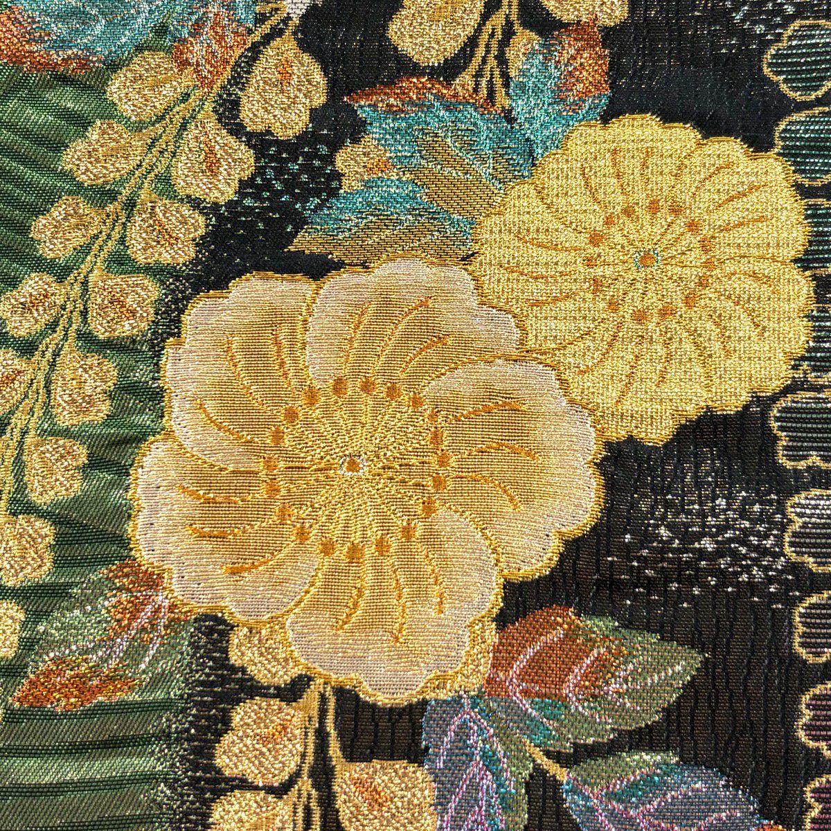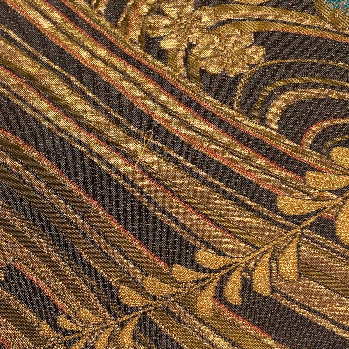 袋帯 秀品 草花 波 箔 金糸 黒 六通 正絹