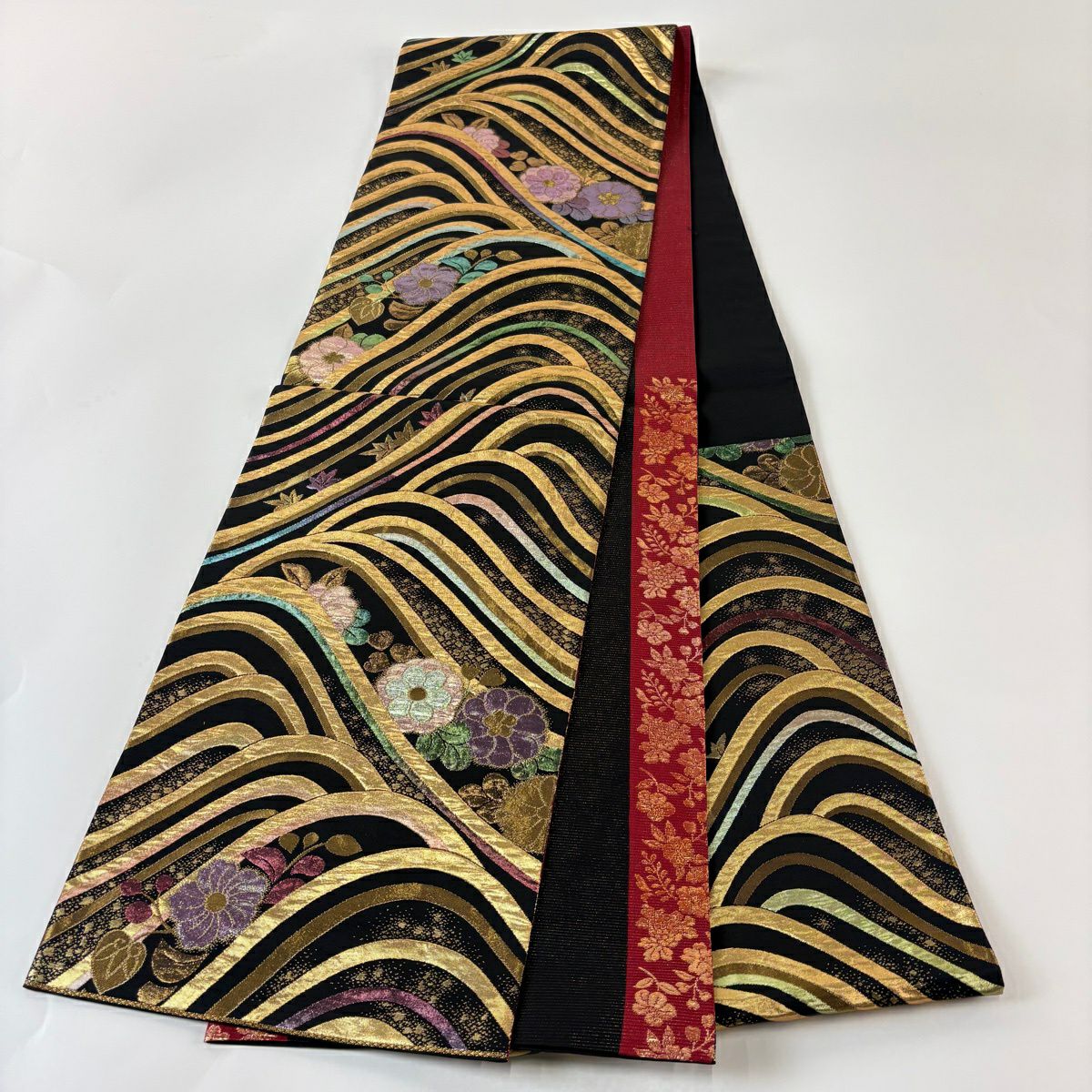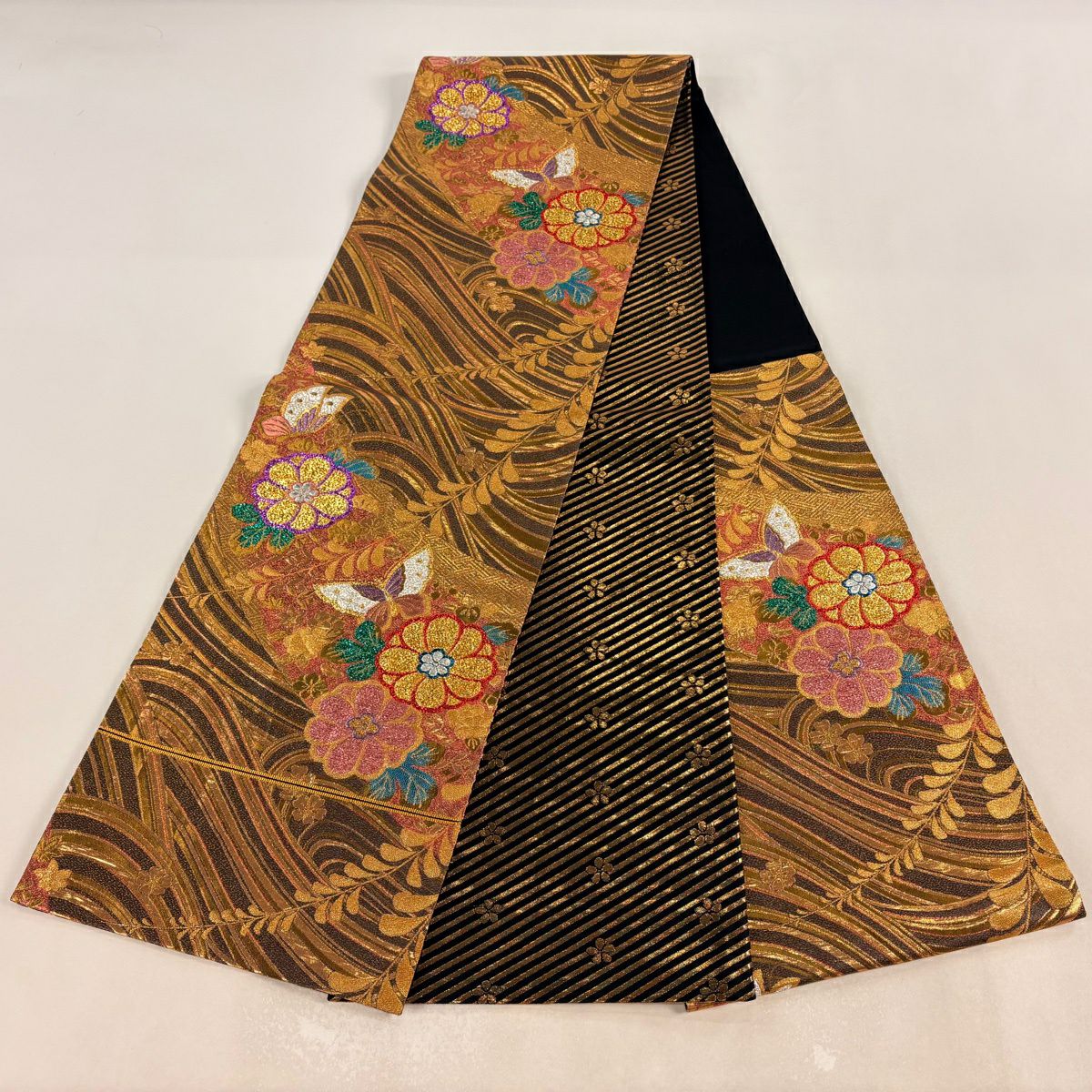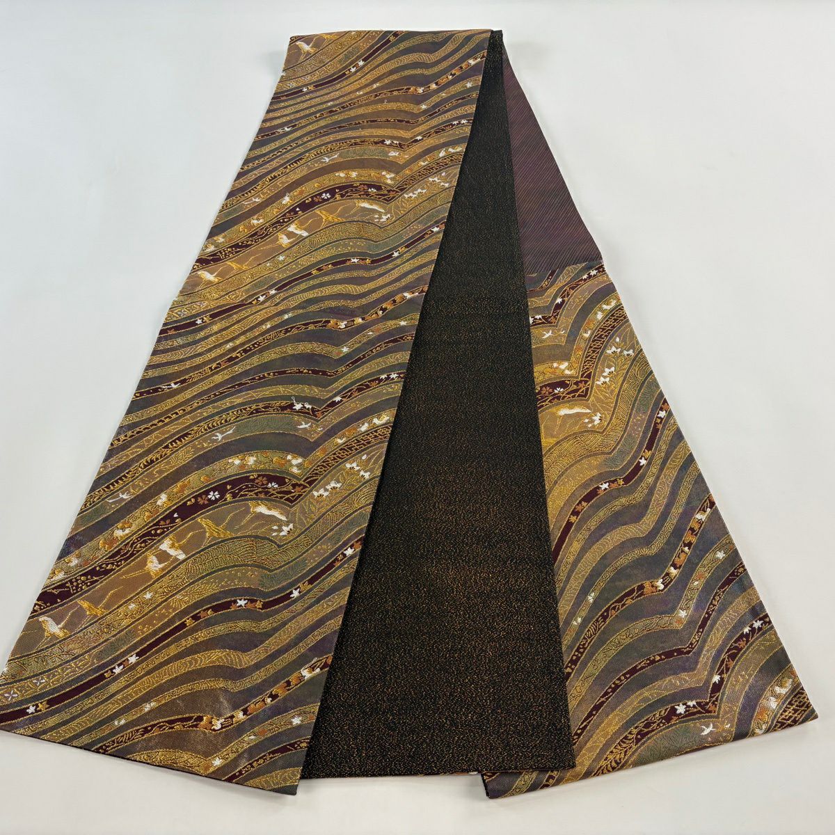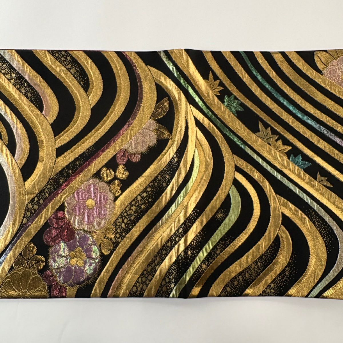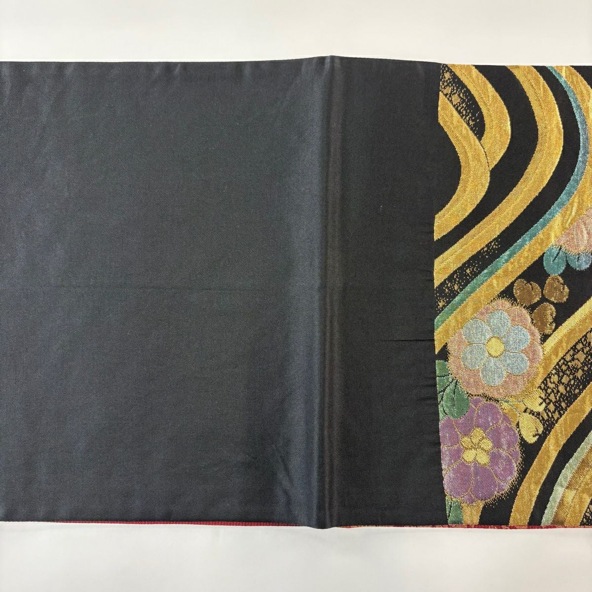 袋帯 秀品 草花 波 箔 金糸 黒 六通 正絹