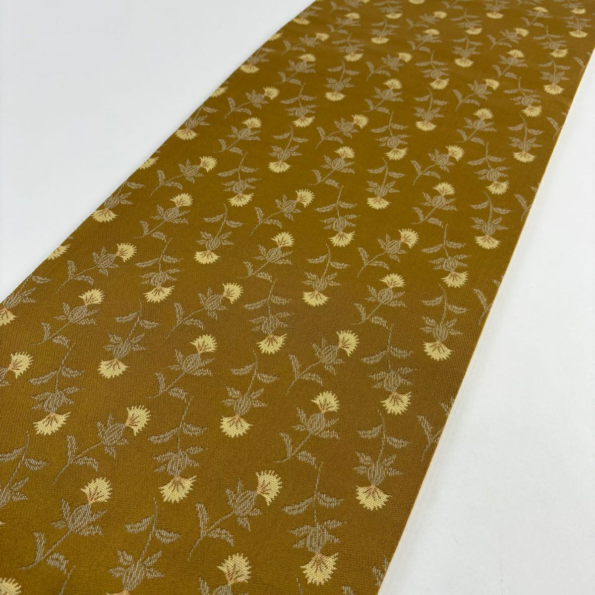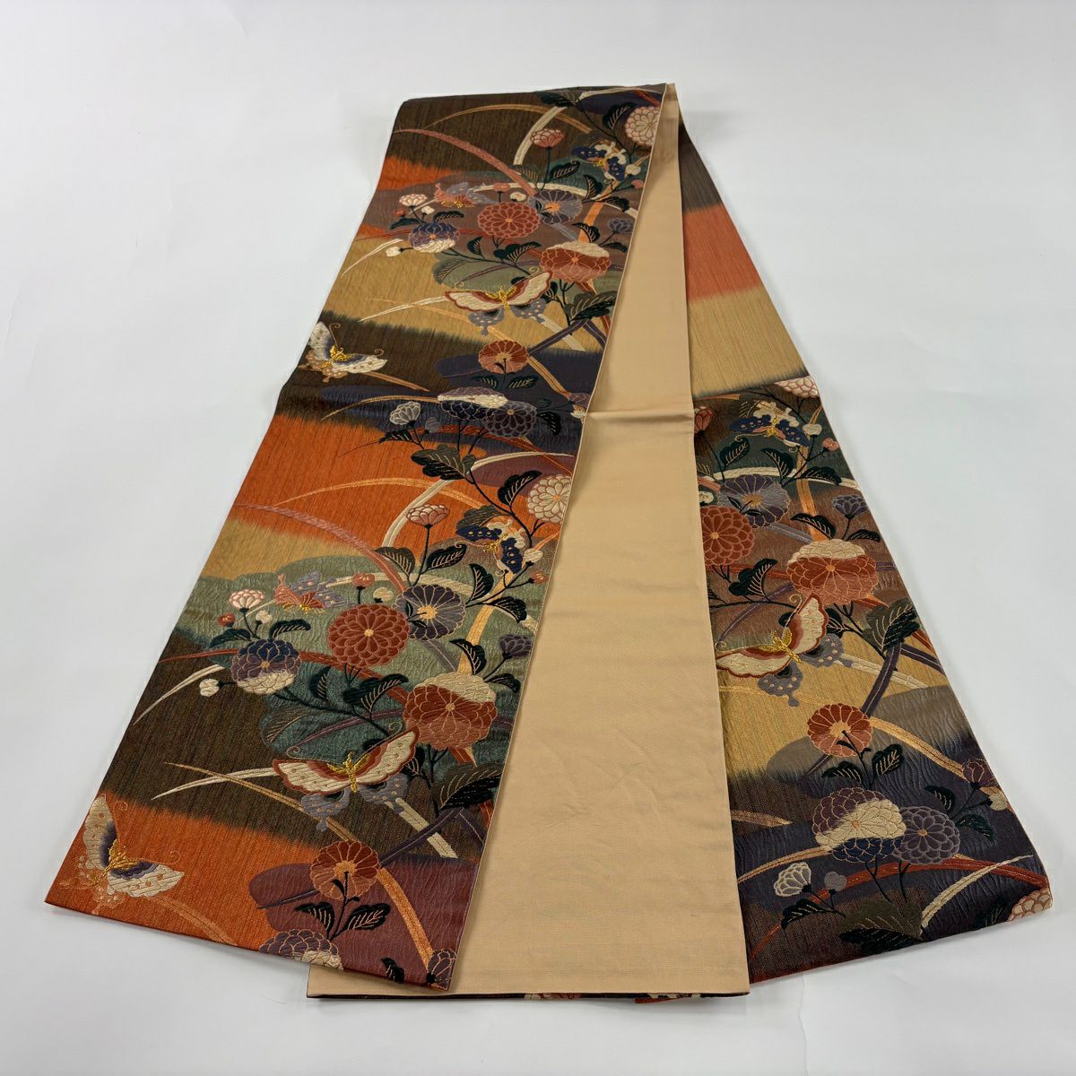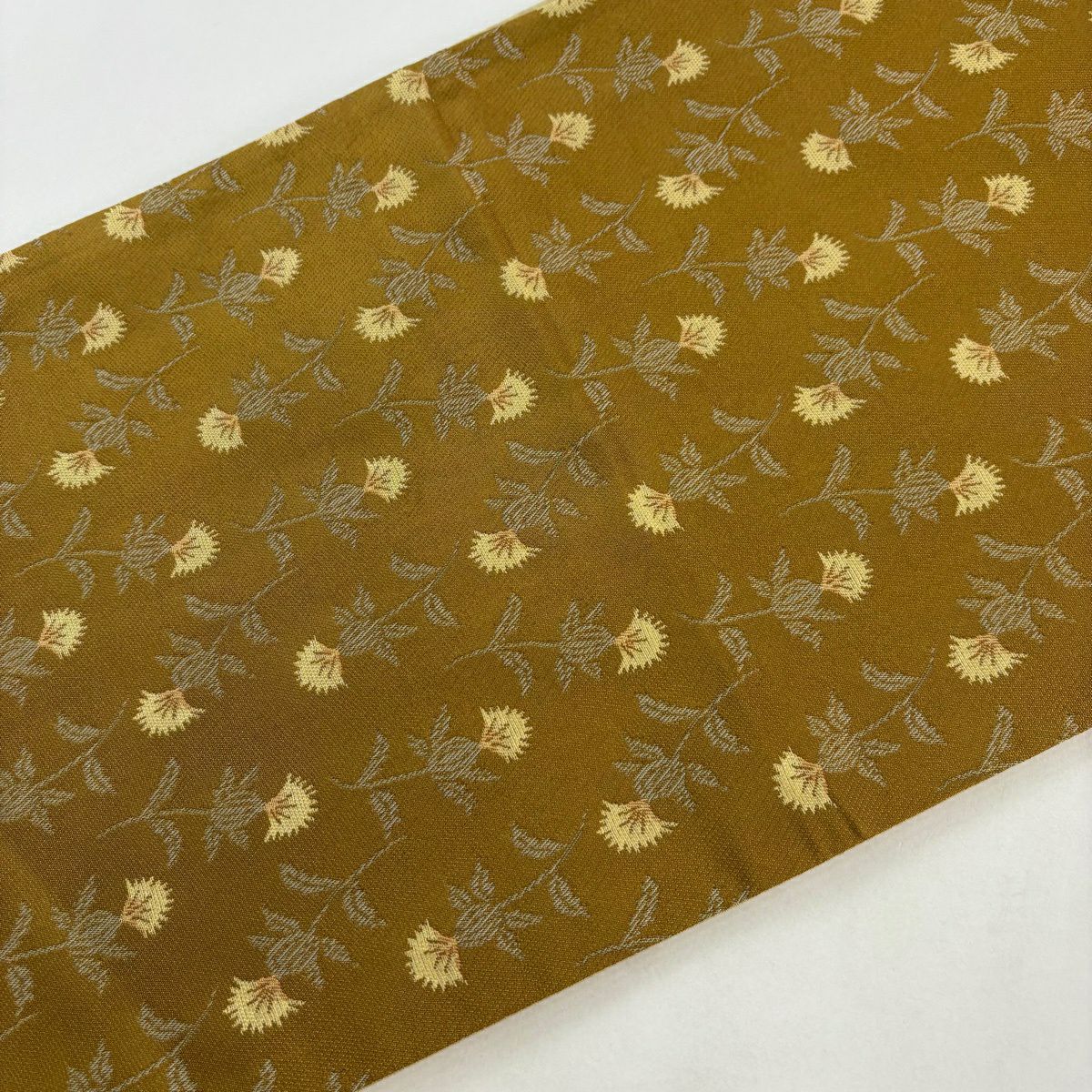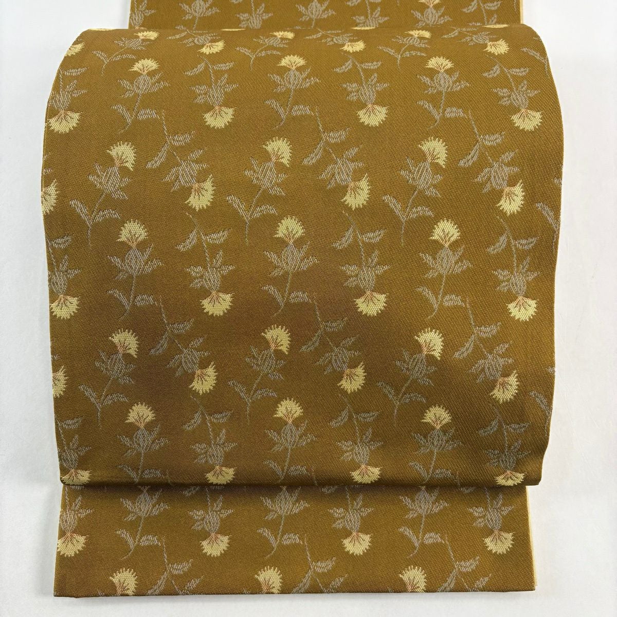【美品】 袋帯 秀品 草花 黄土色 全通 正絹