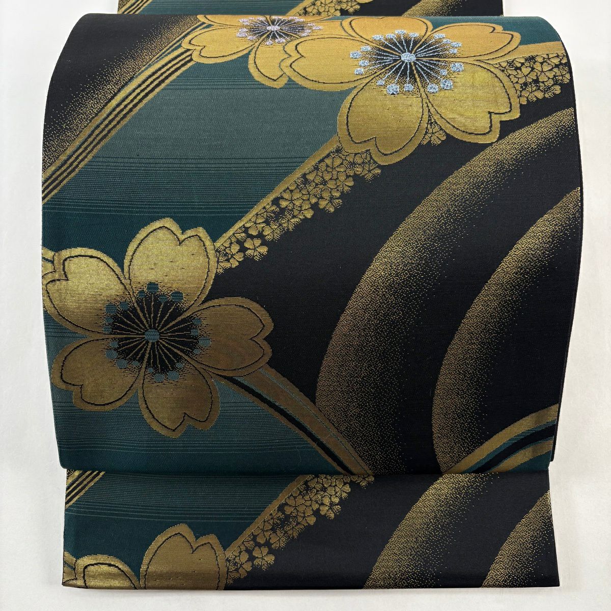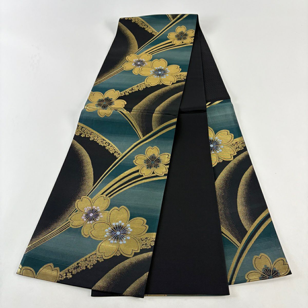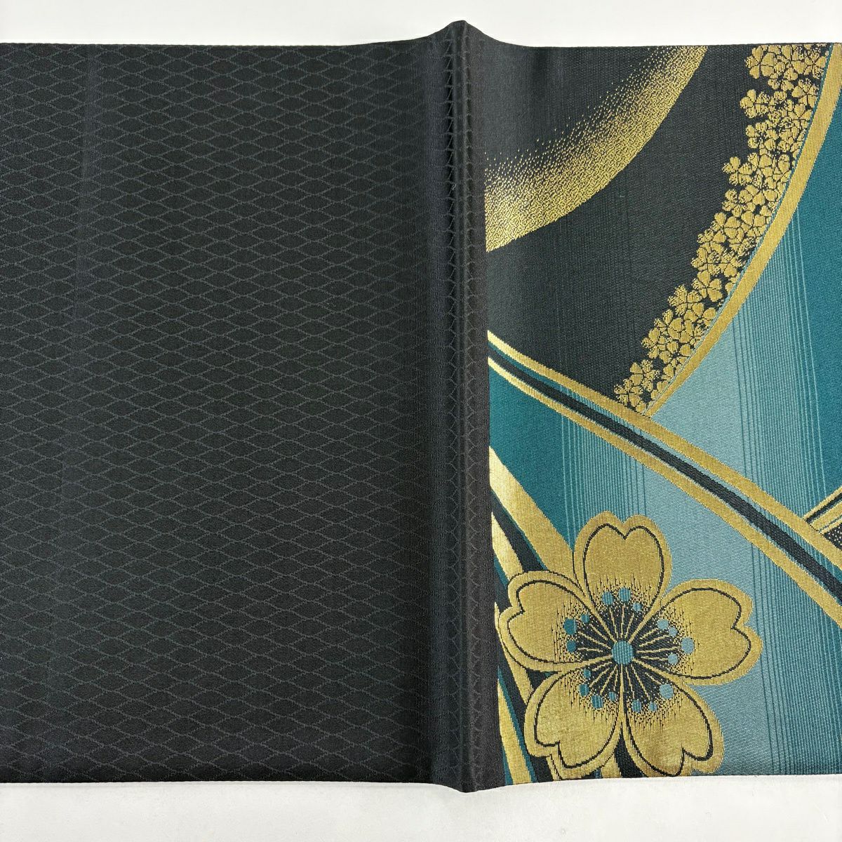 袋帯 秀品 桜 幾何学模様 箔 黒 六通 正絹