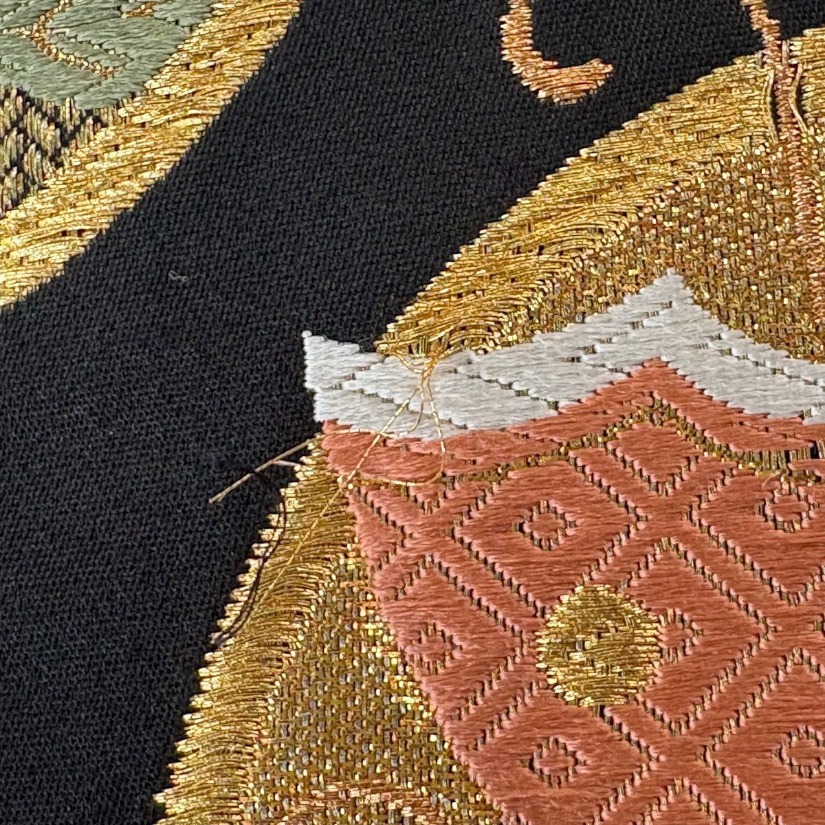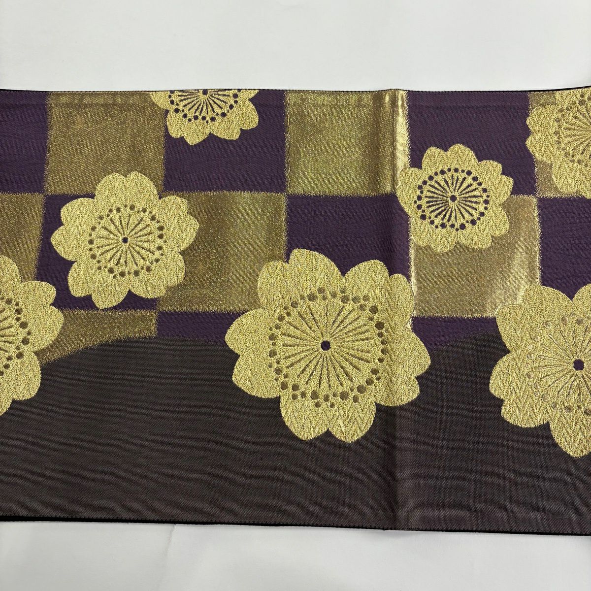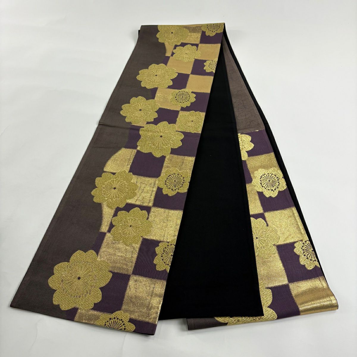 袋帯 秀品 桜 幾何学模様 箔 黒 六通 正絹