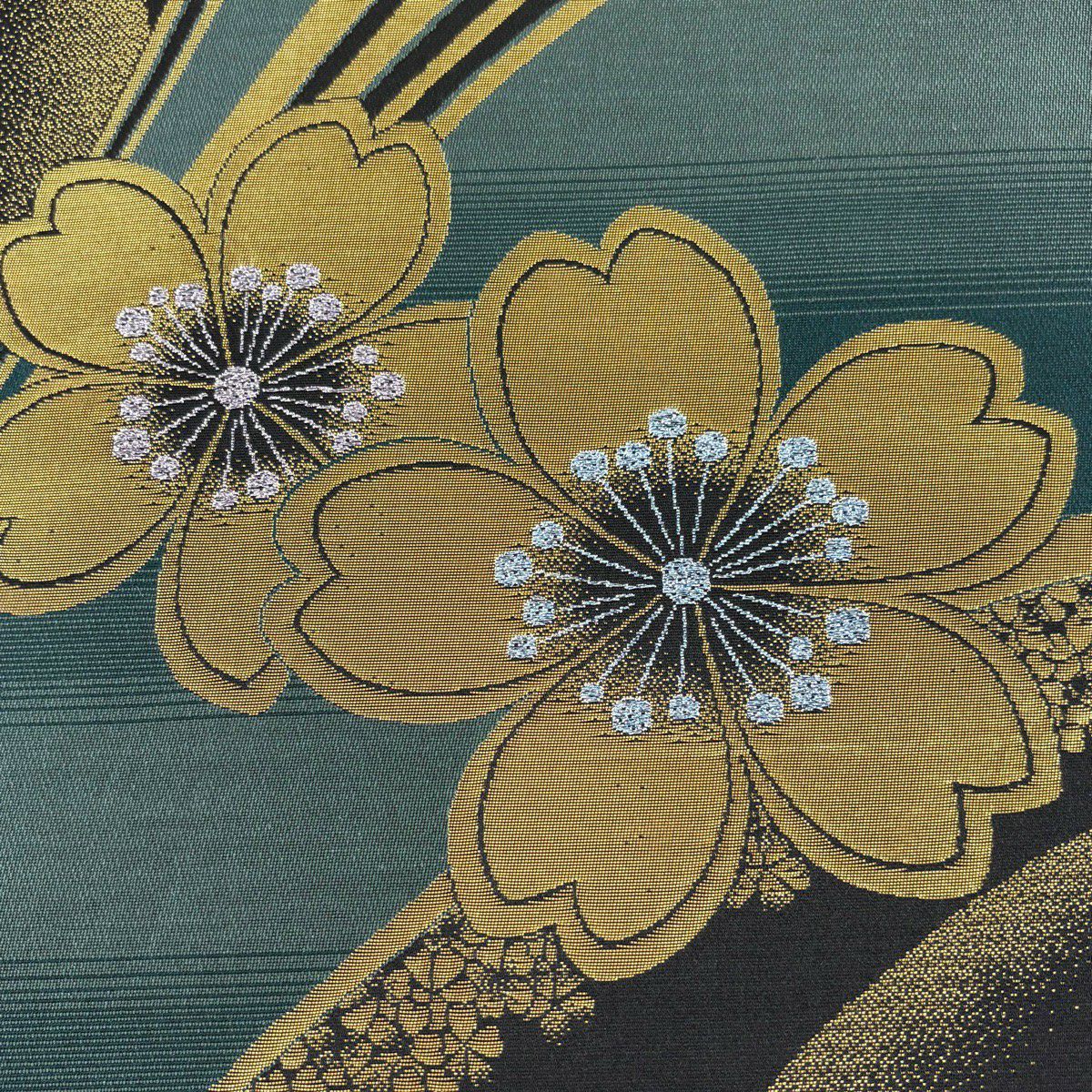 袋帯 秀品 蝶 桜 金銀糸 箔 緑 六通 正絹