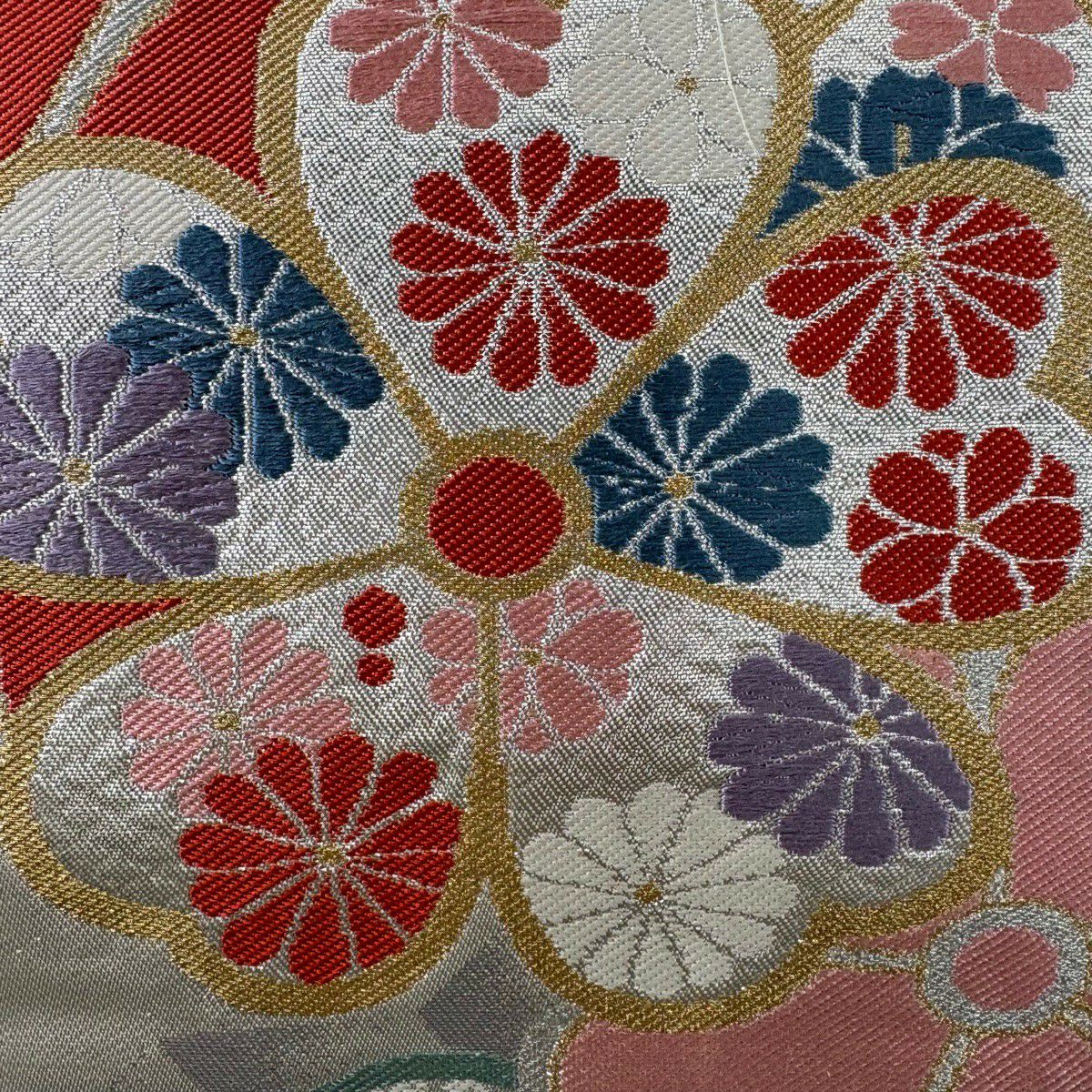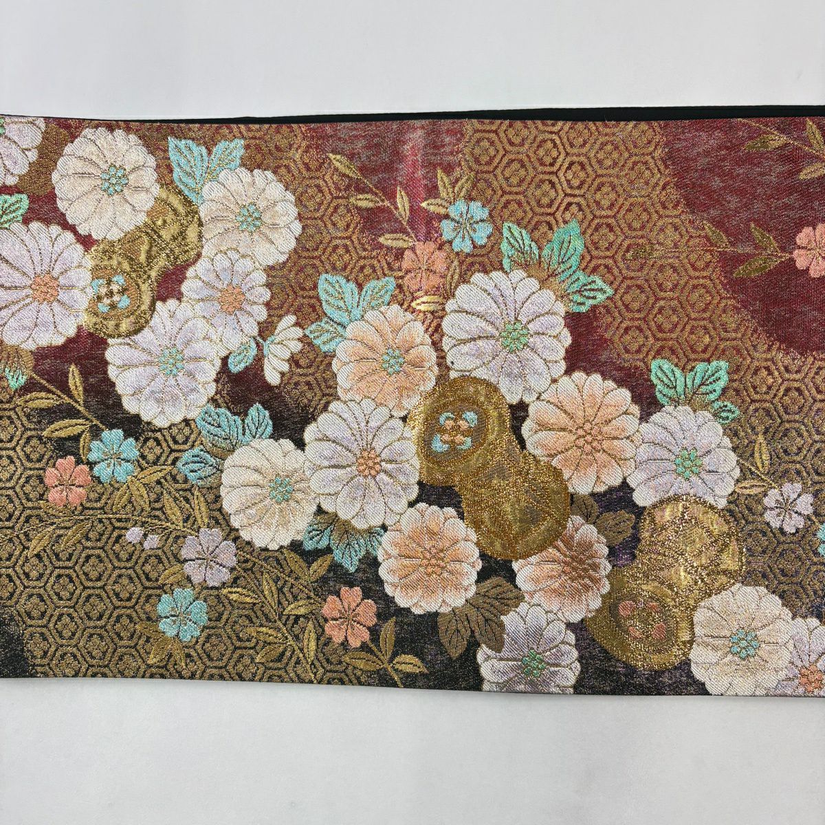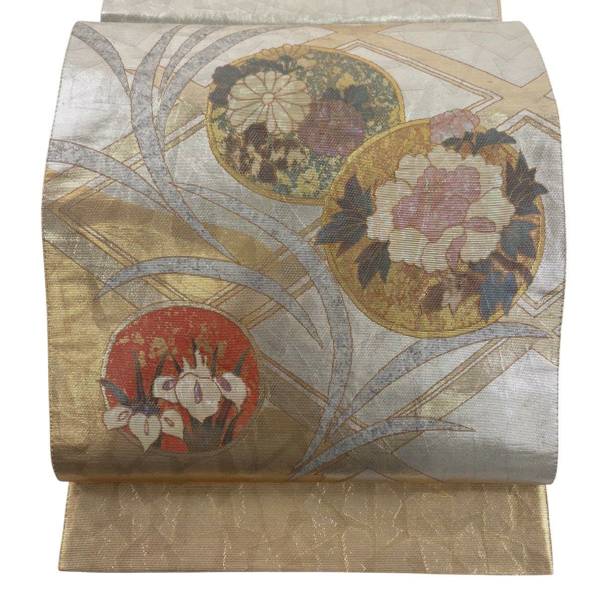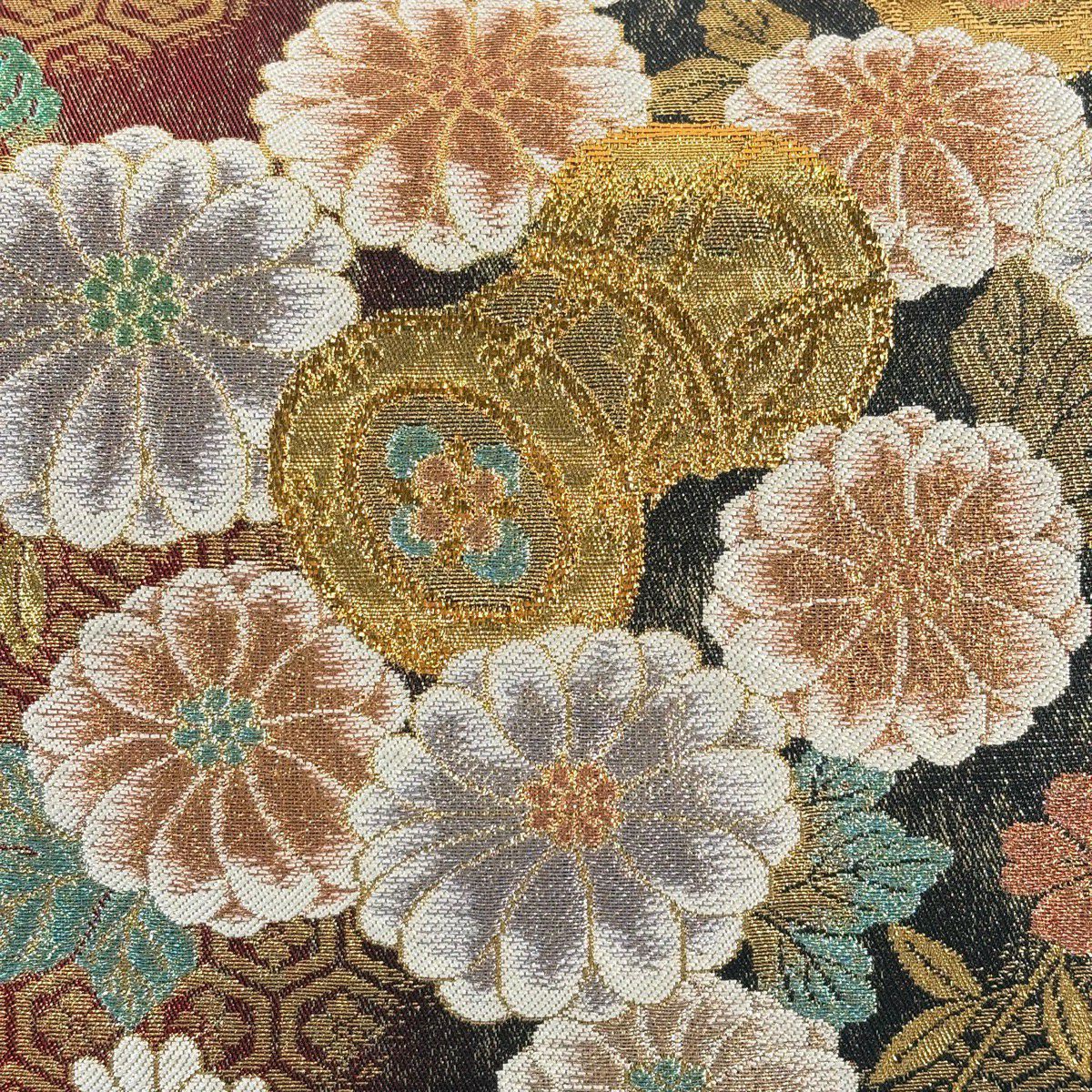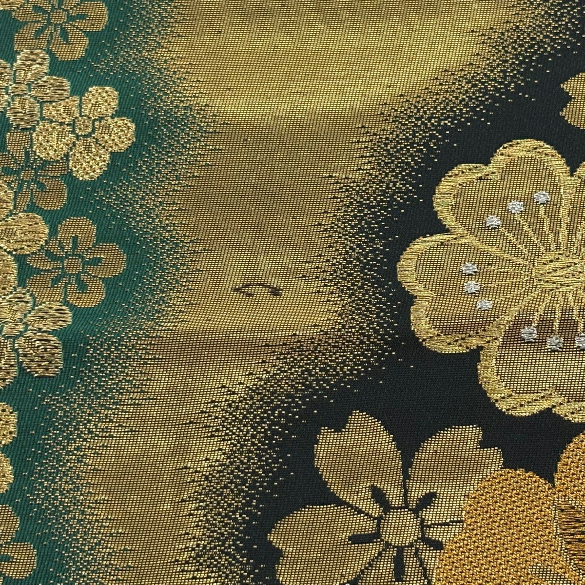 袋帯 秀品 菊 牡丹 箔 金色 お太鼓柄 正絹