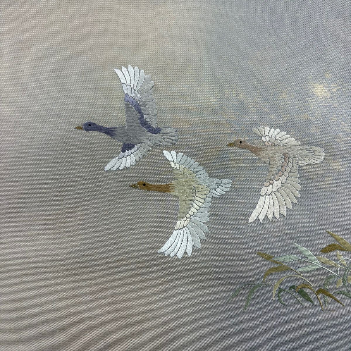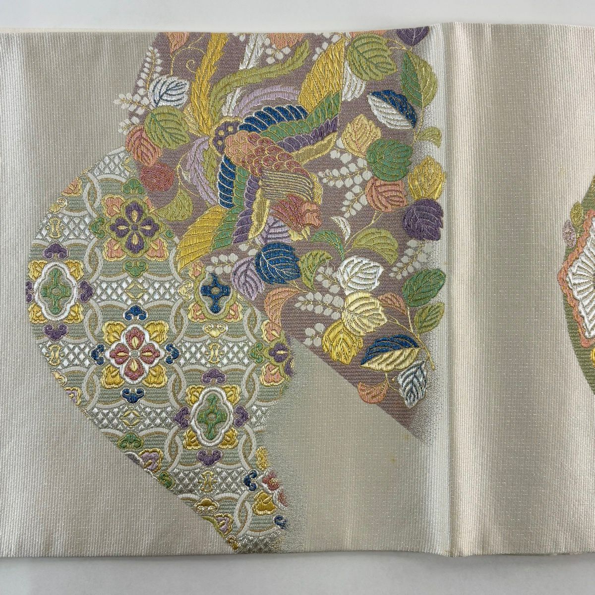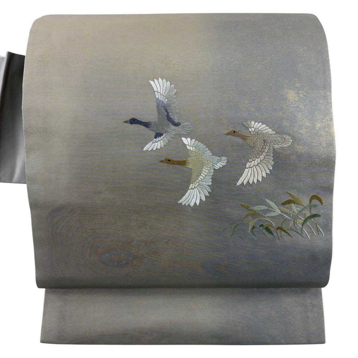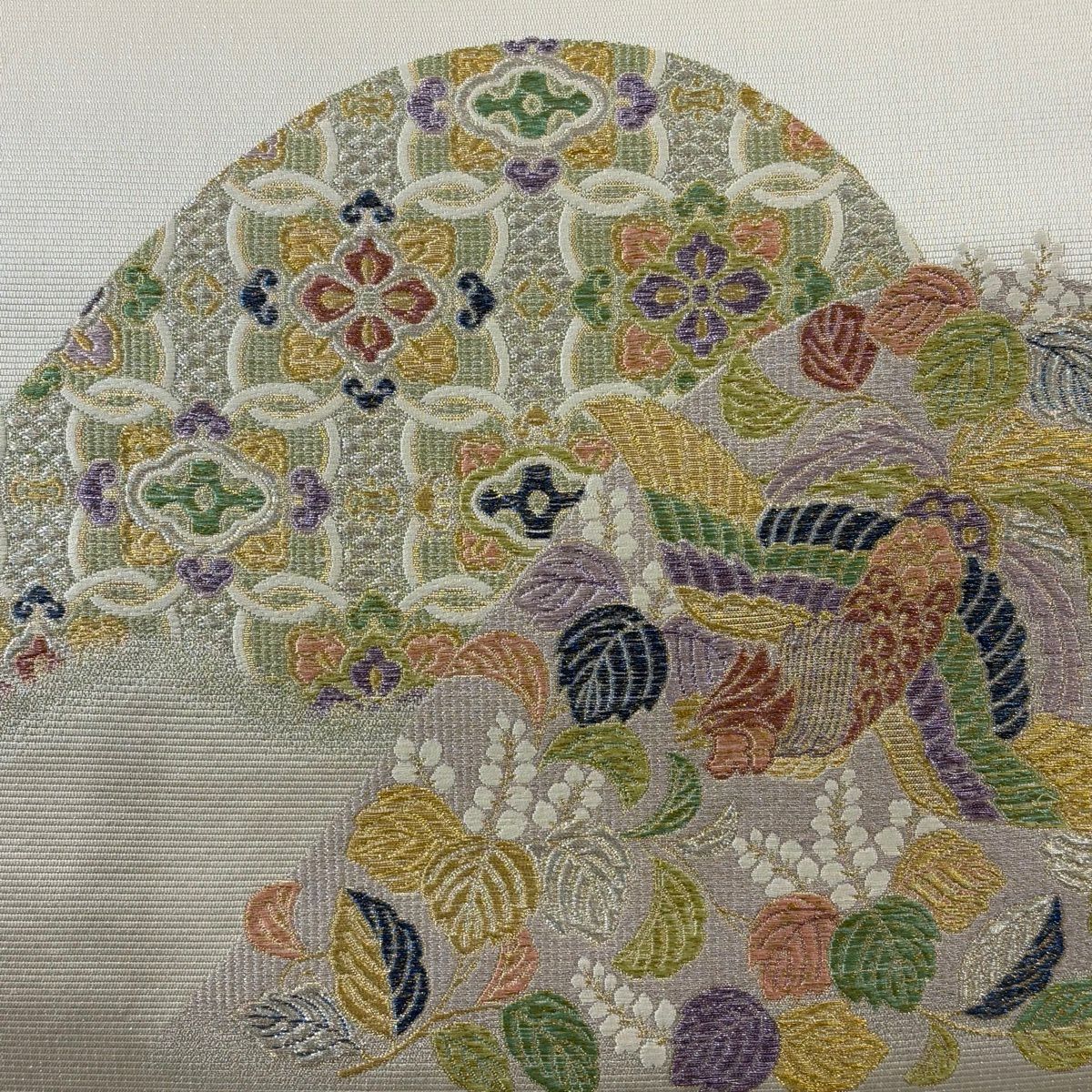 袋帯 秀品 花鳥 松 金銀糸 灰白 六通 正絹