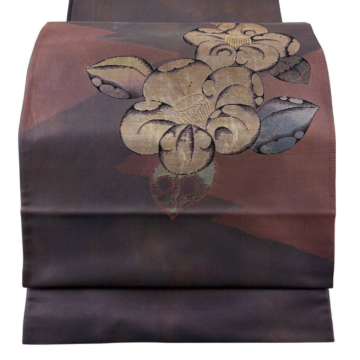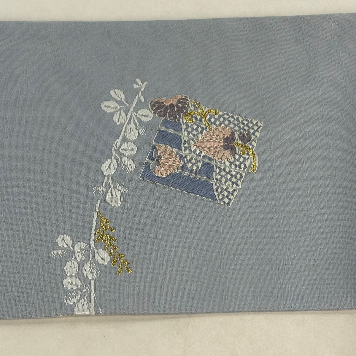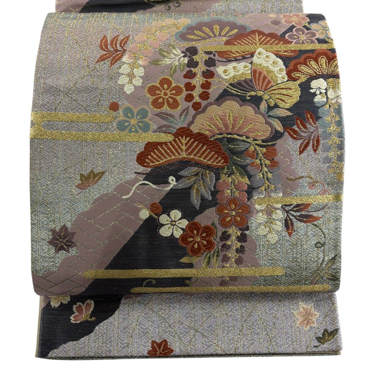 袋帯 秀品 椿 金糸 箔 灰紫 お太鼓柄 正絹