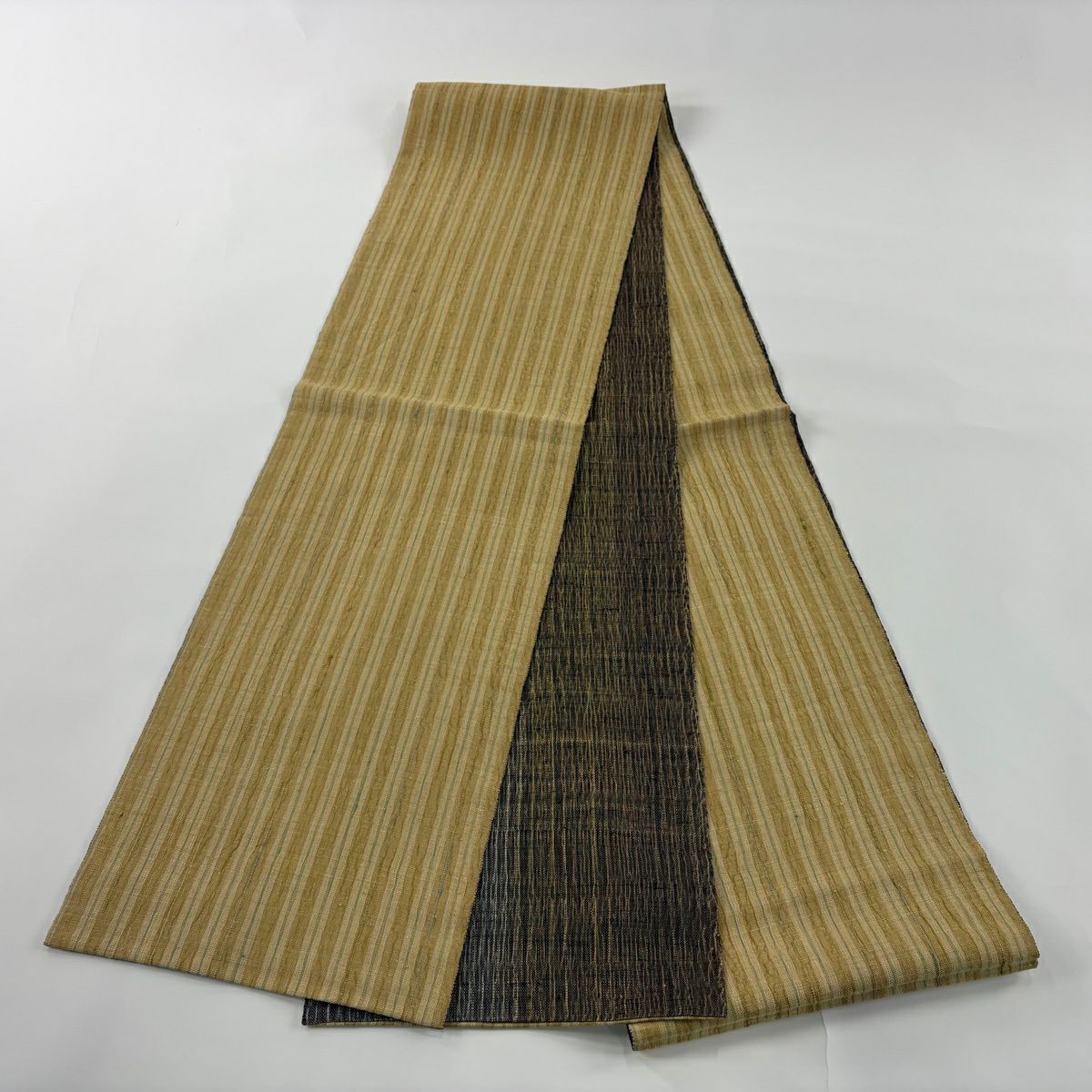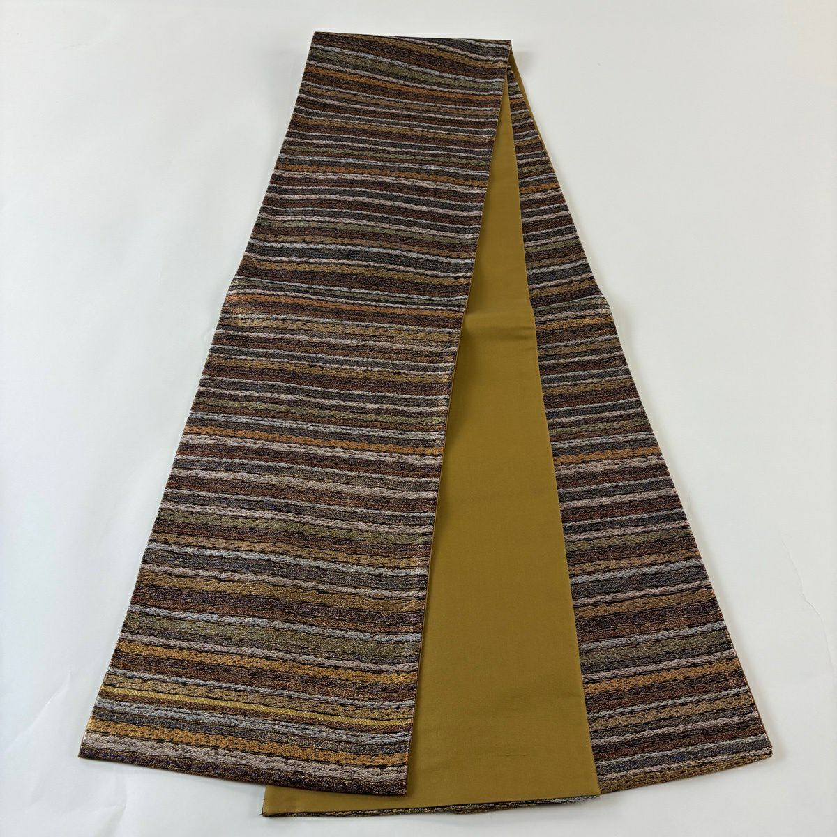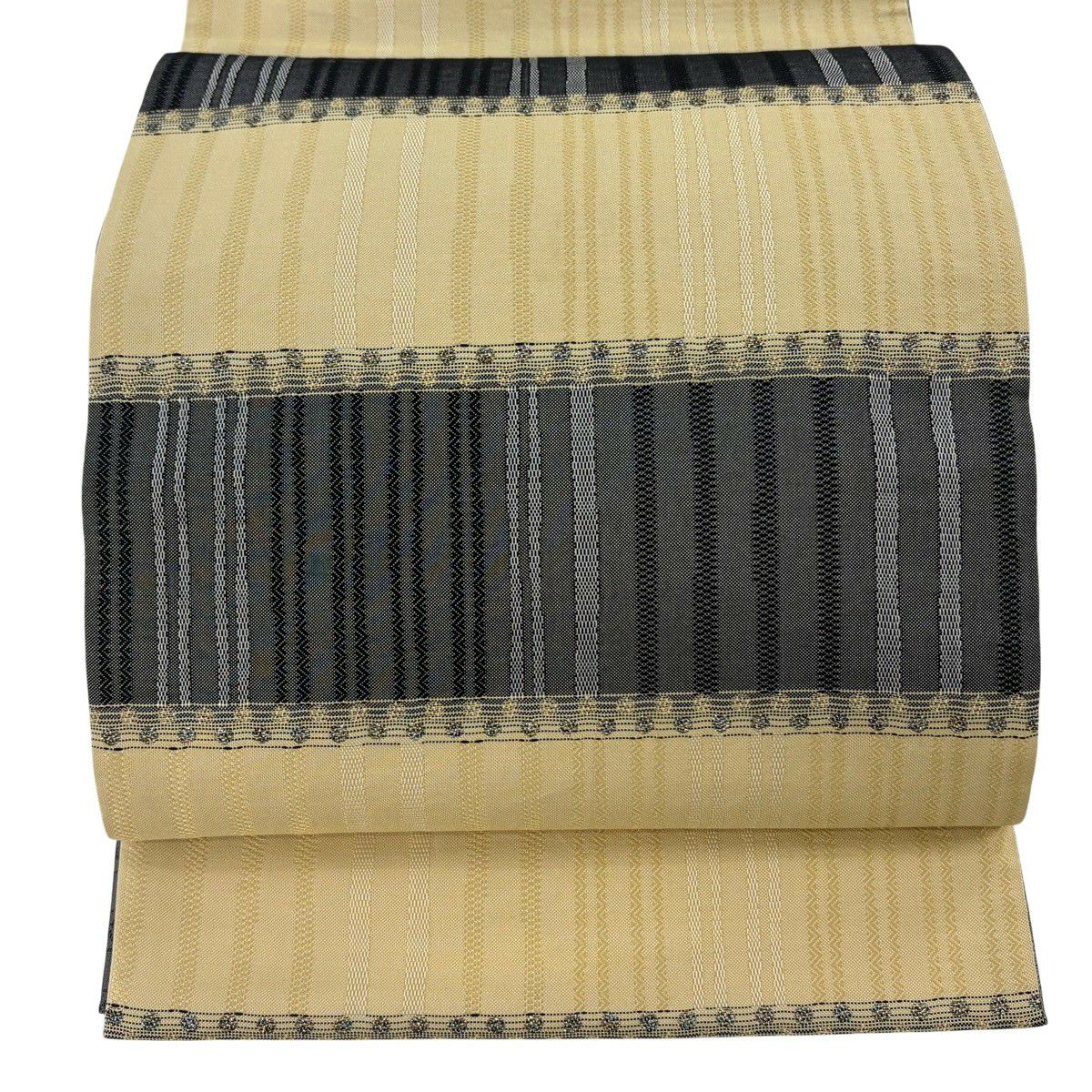 【美品】 袋帯 秀品 縞 薄黄土色 全通 正絹