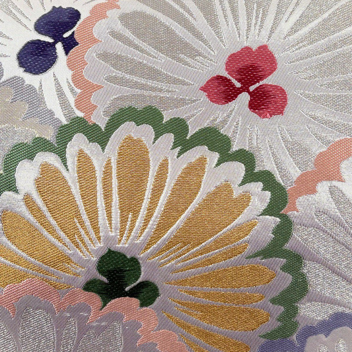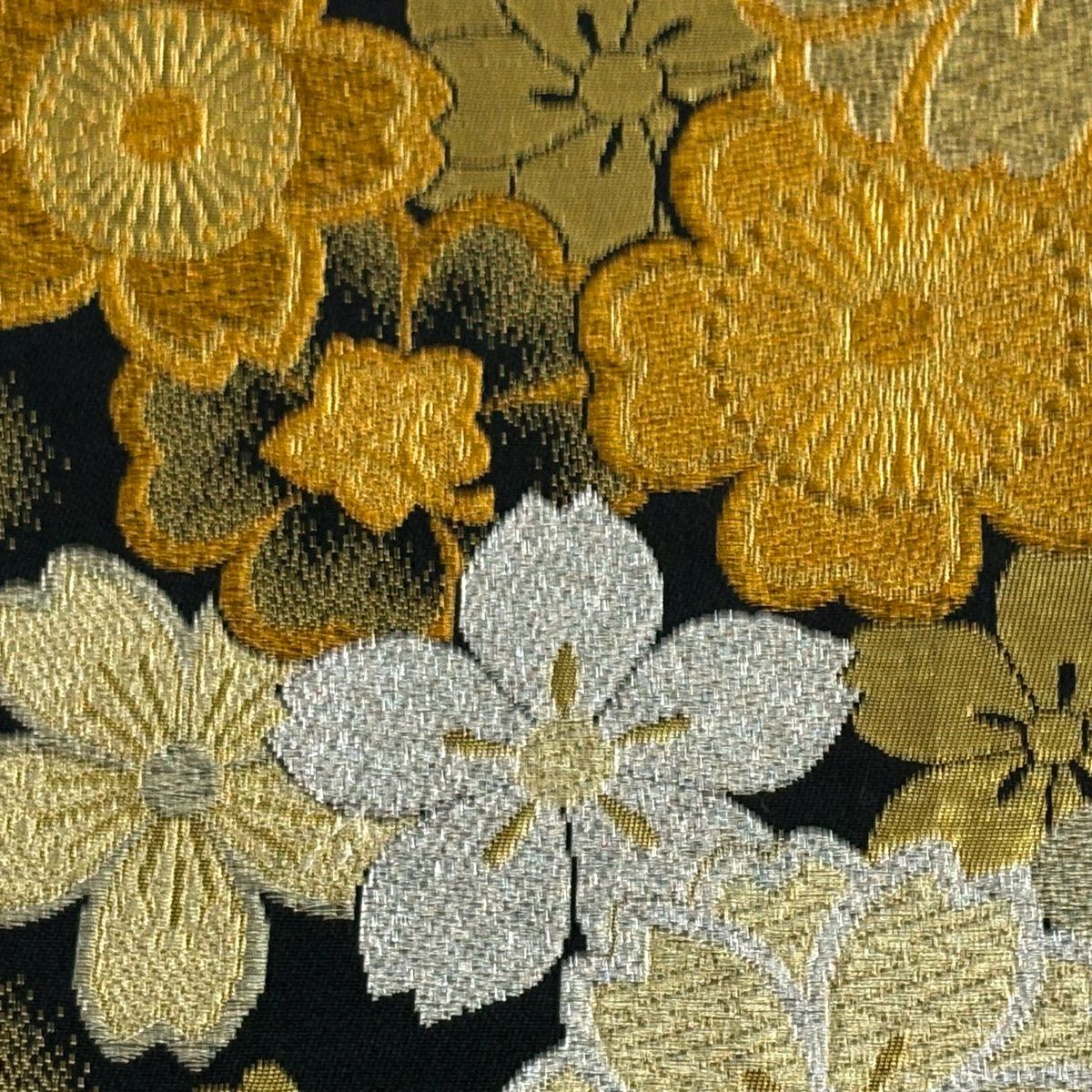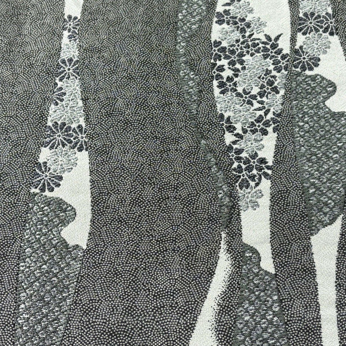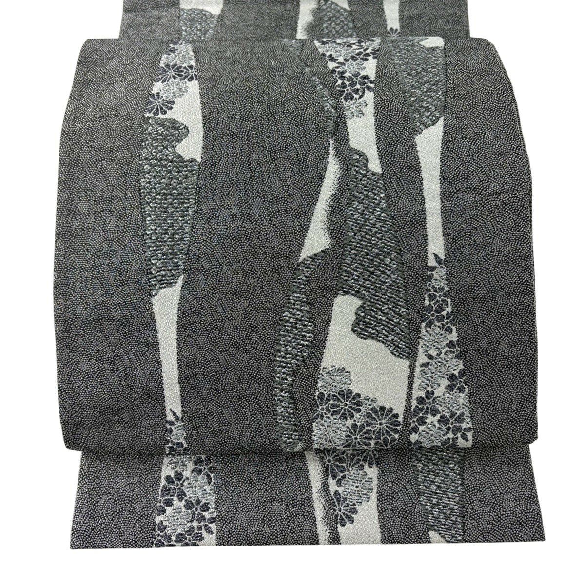 袋帯 秀品 菊 桜 銀糸 箔 黒灰 六通 正絹