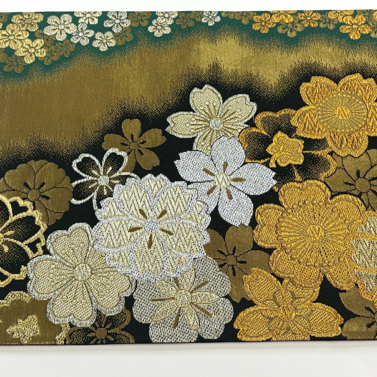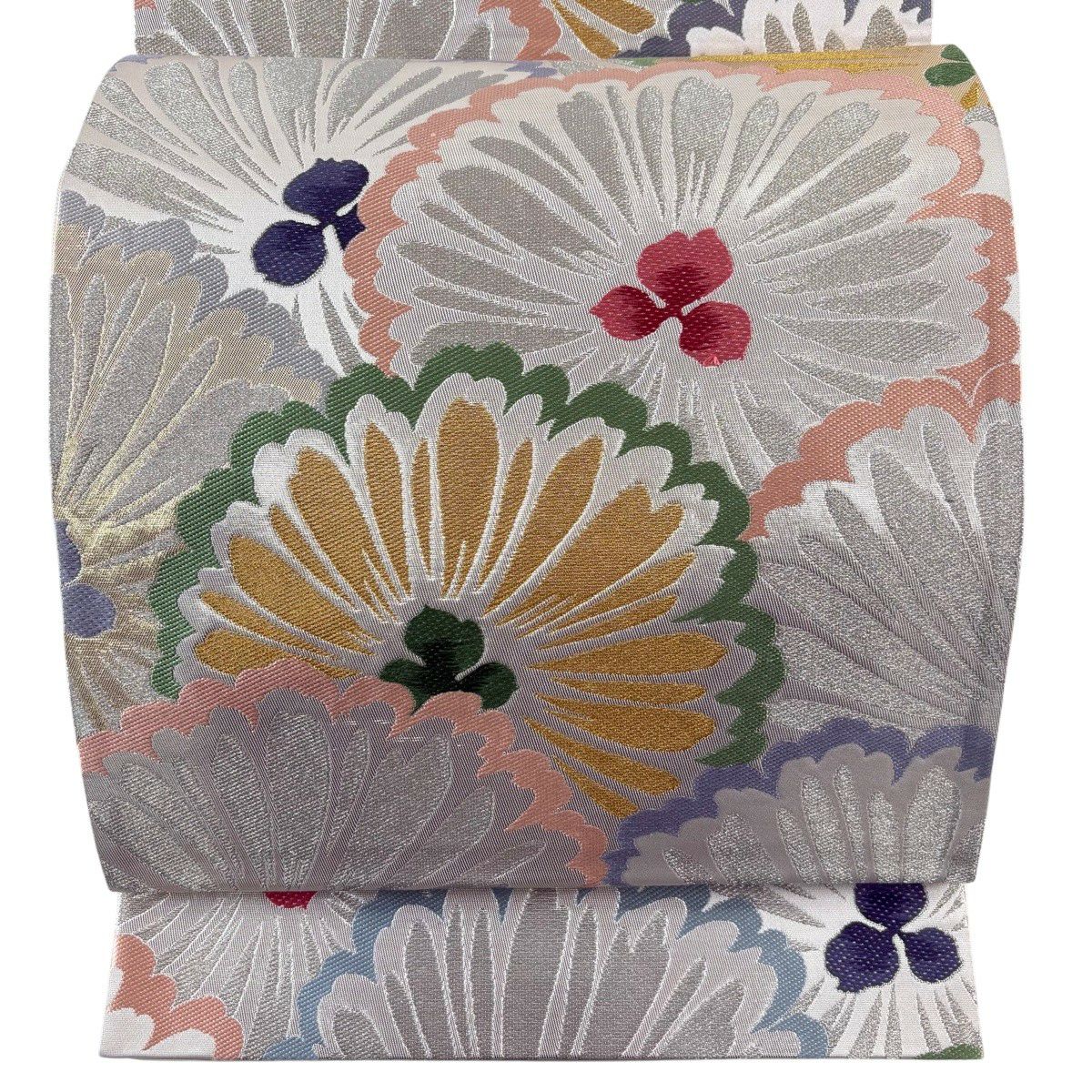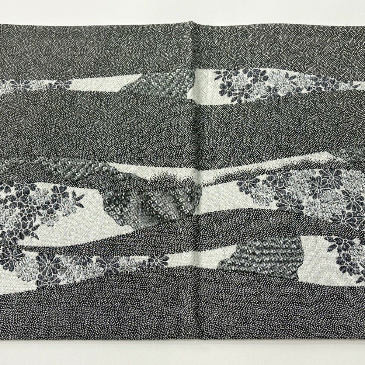 袋帯 秀品 菊 桜 銀糸 箔 黒灰 六通 正絹