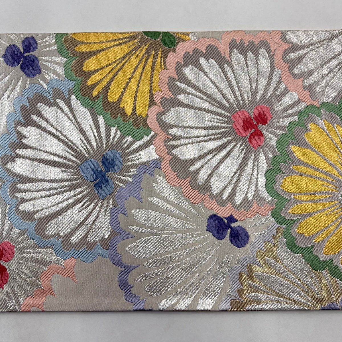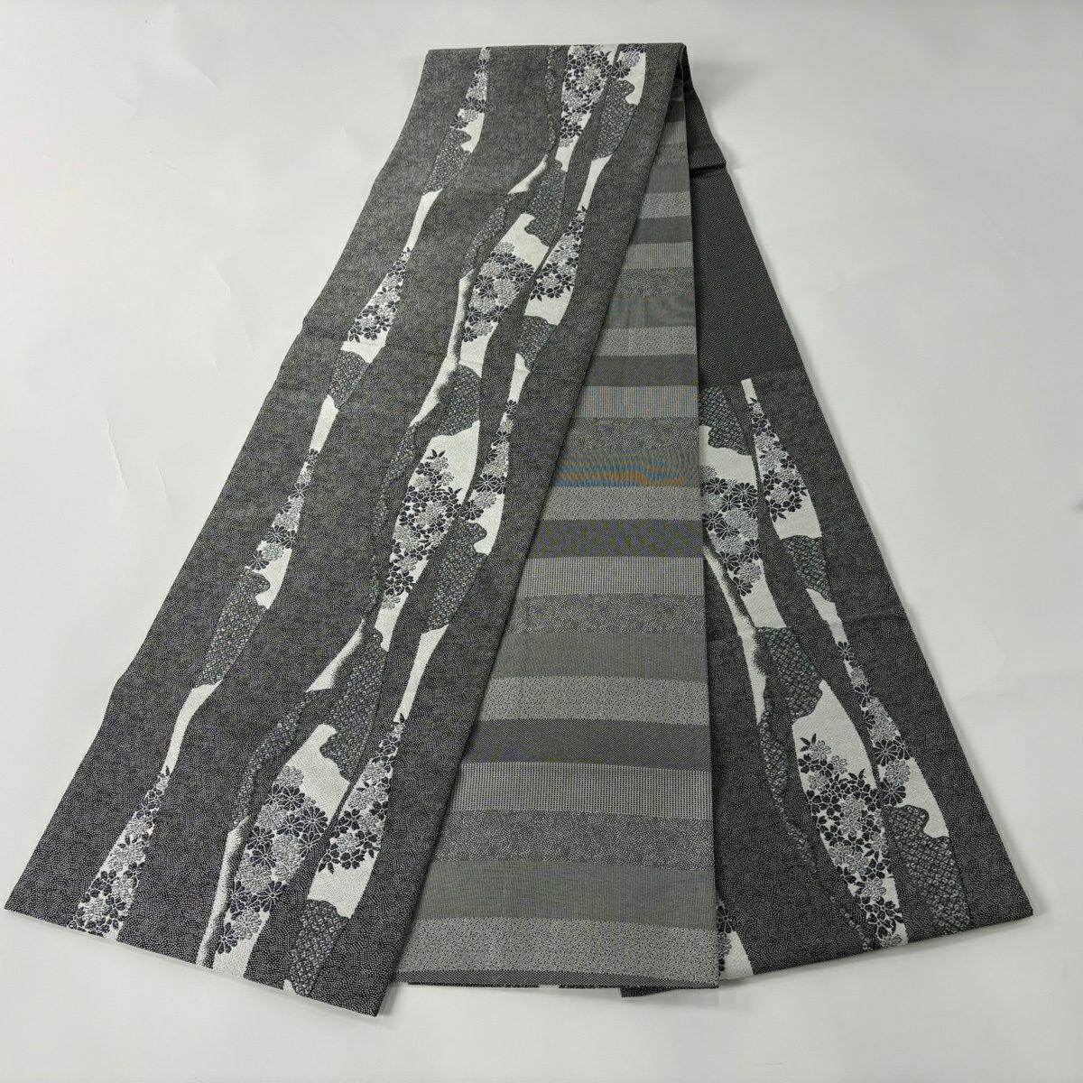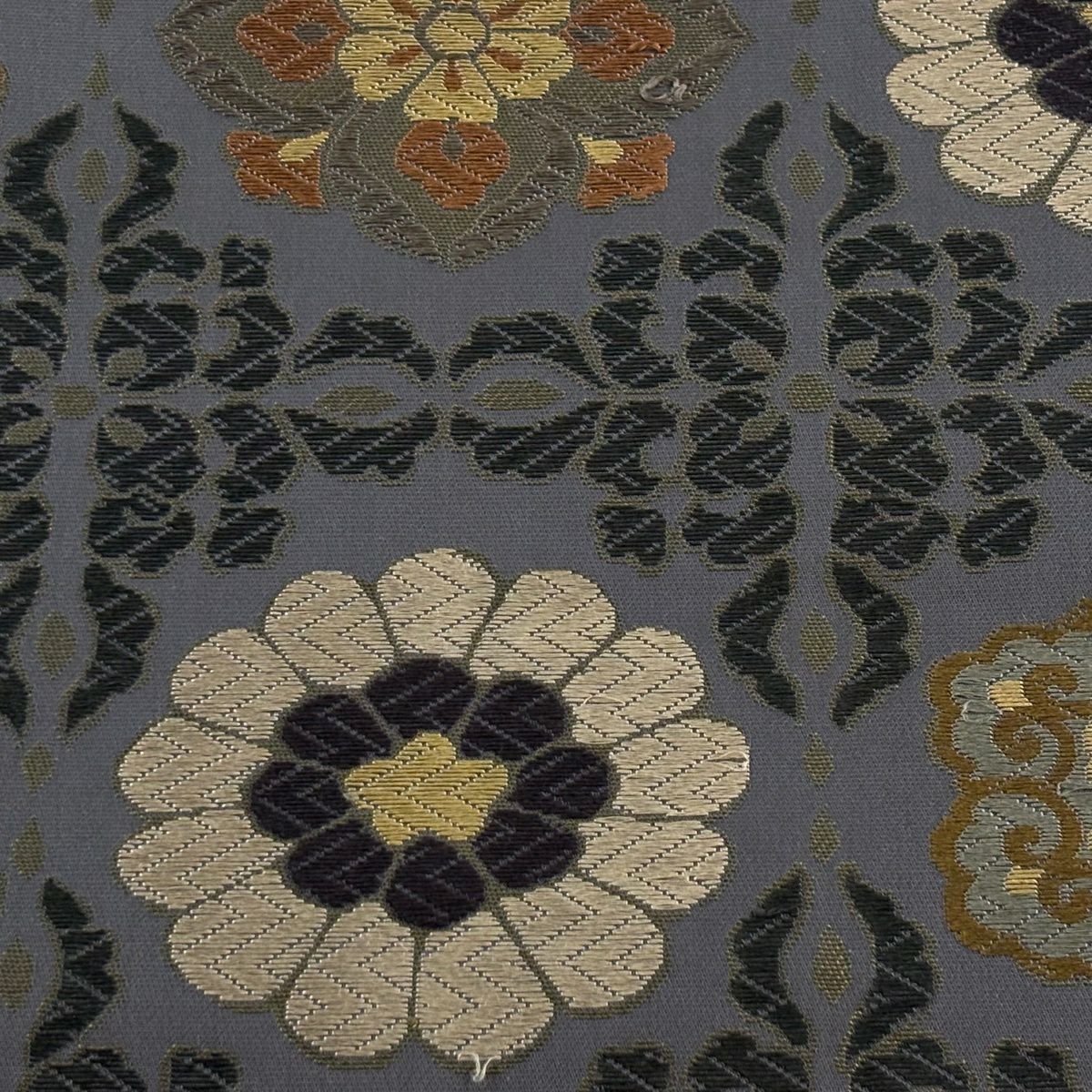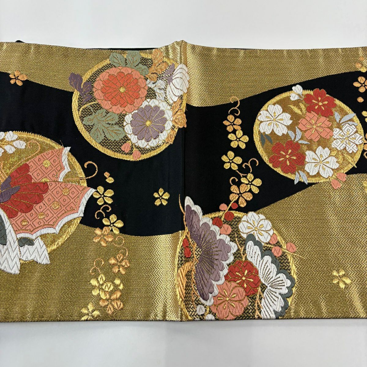 袋帯 秀品 菊 桜 銀糸 箔 黒灰 六通 正絹
