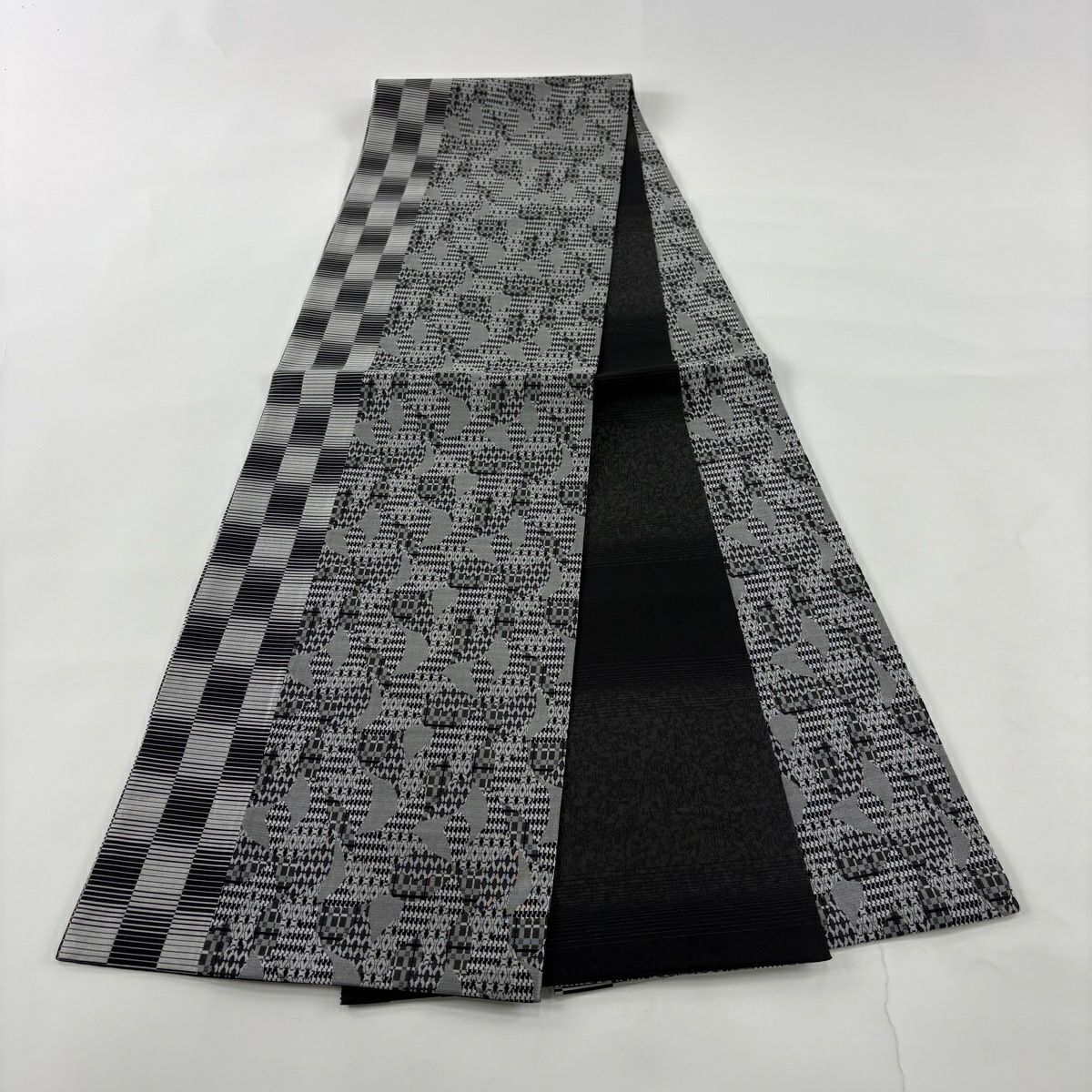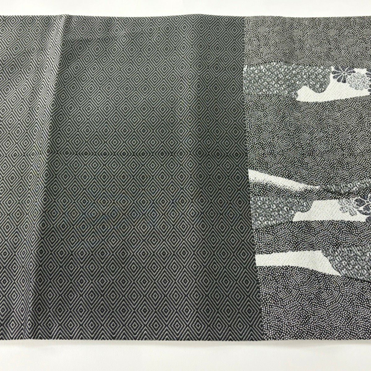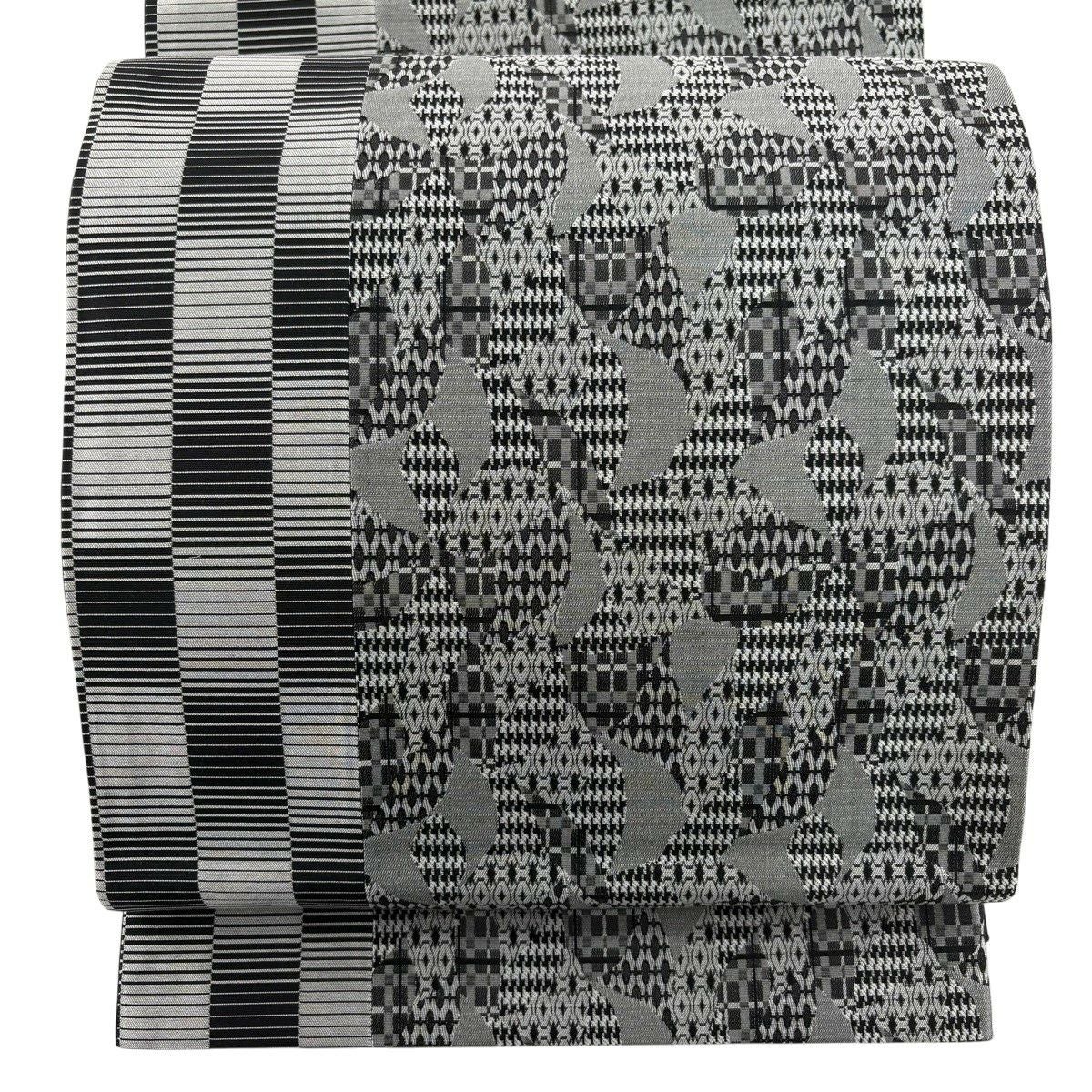 袋帯 秀品 華文 格子 唐織 黒灰 六通 正絹