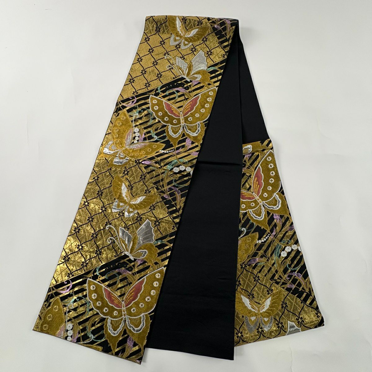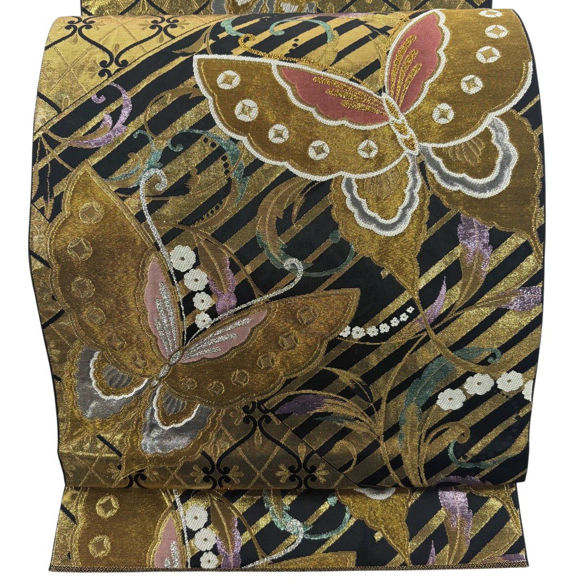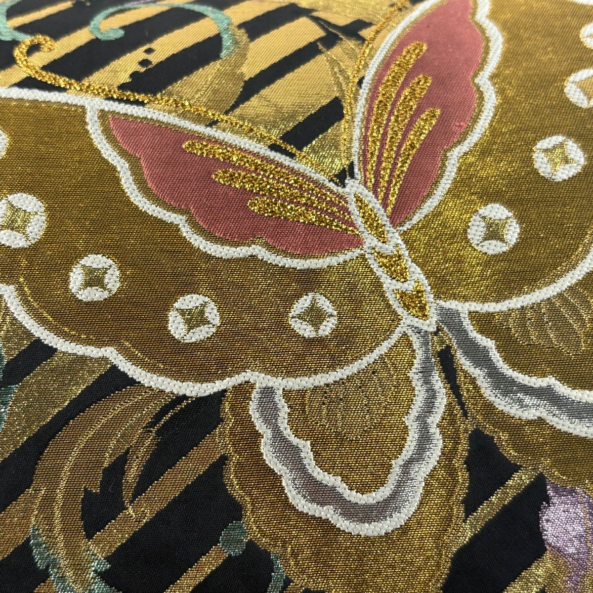 袋帯 秀品 蝶 斜縞 箔 金糸 黒 六通 正絹