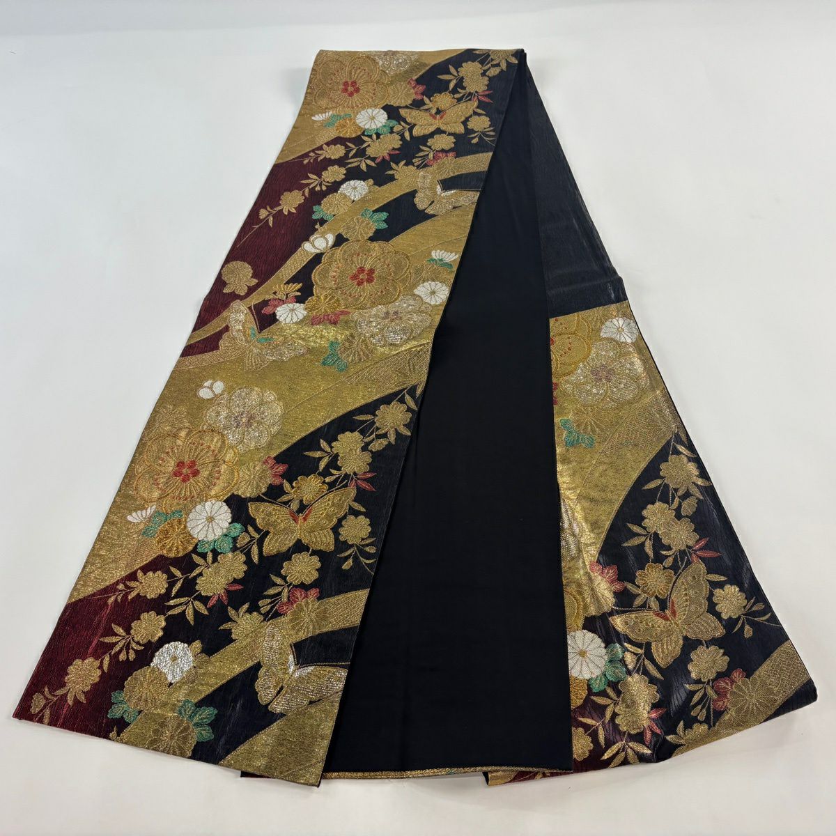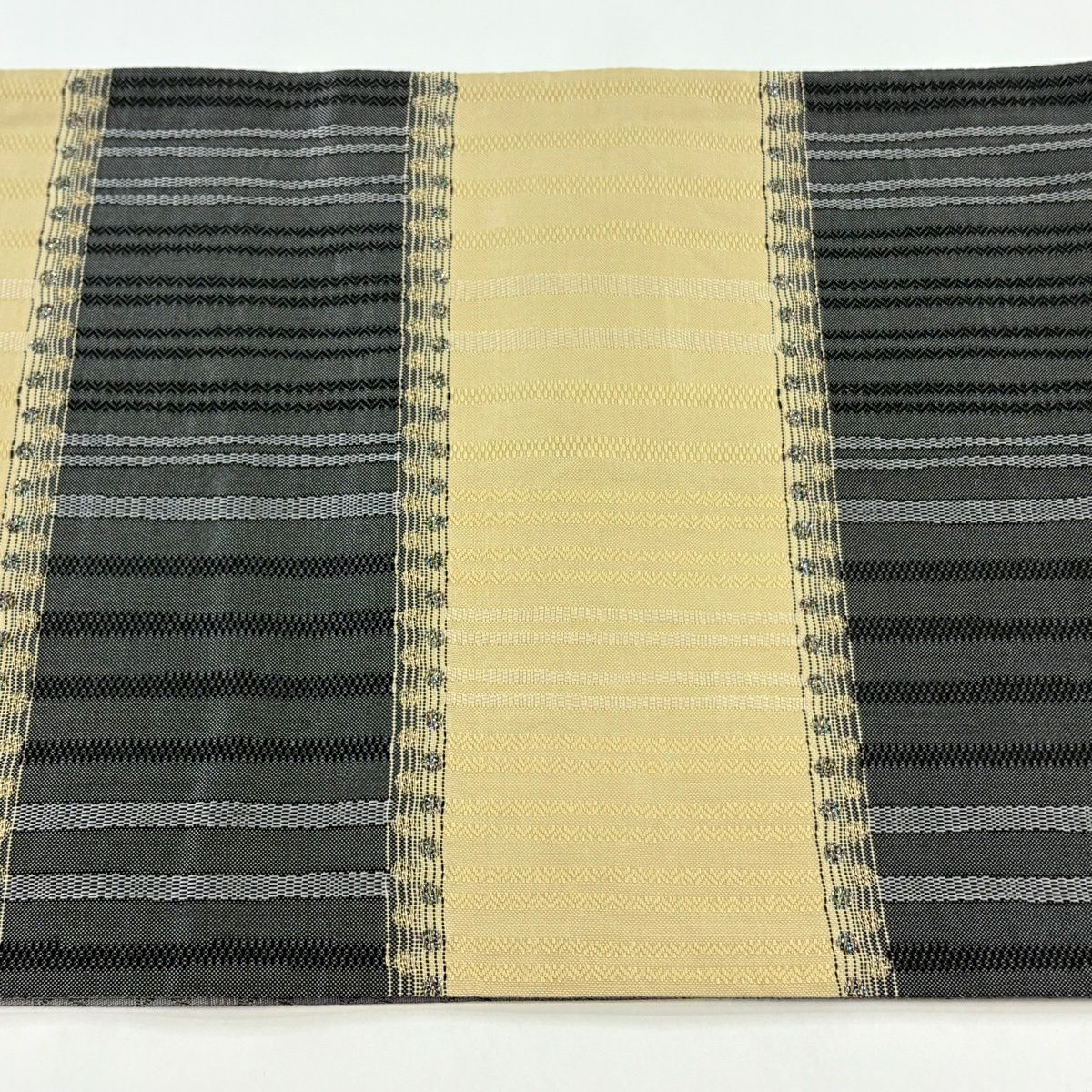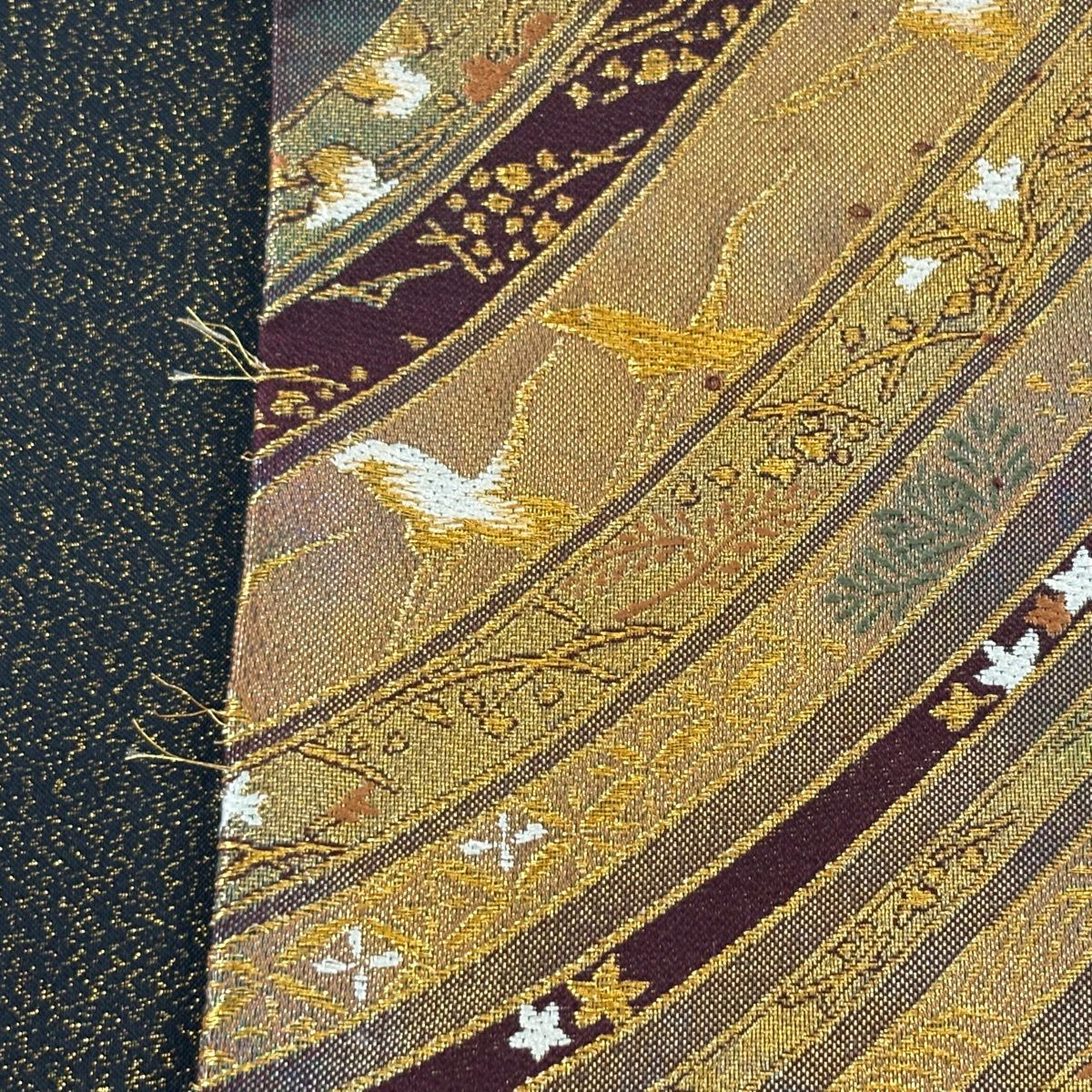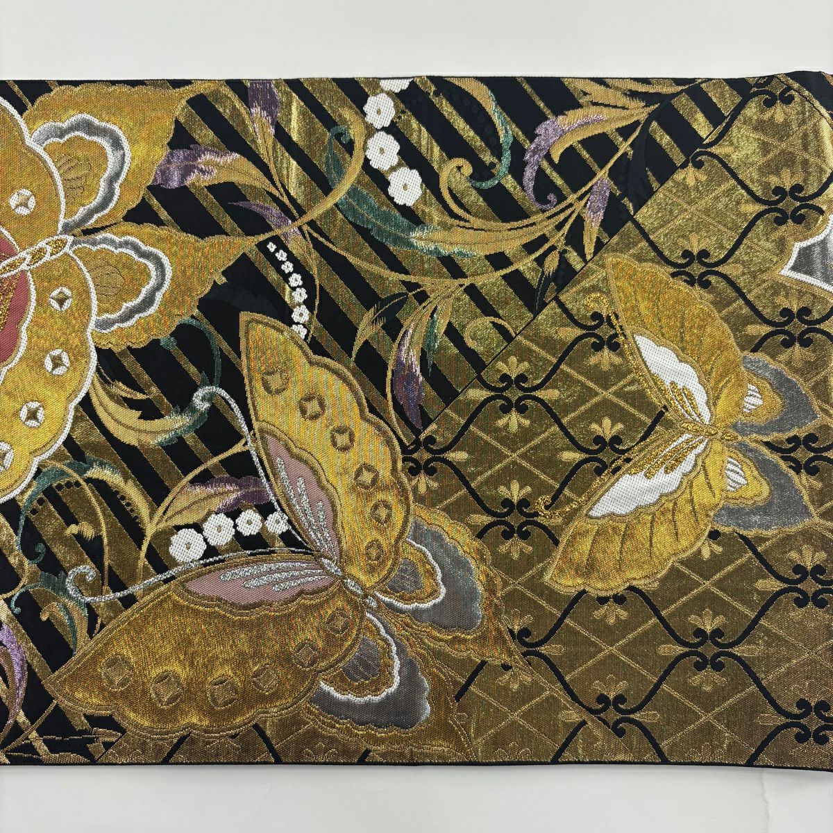袋帯 秀品 蝶 斜縞 箔 金糸 黒 六通 正絹