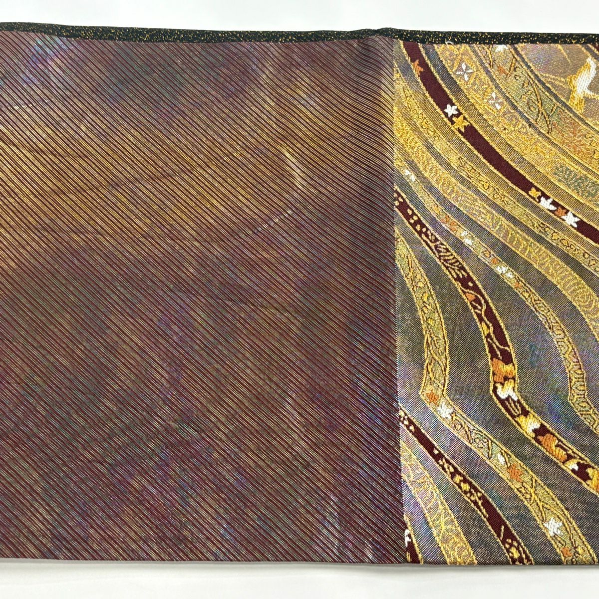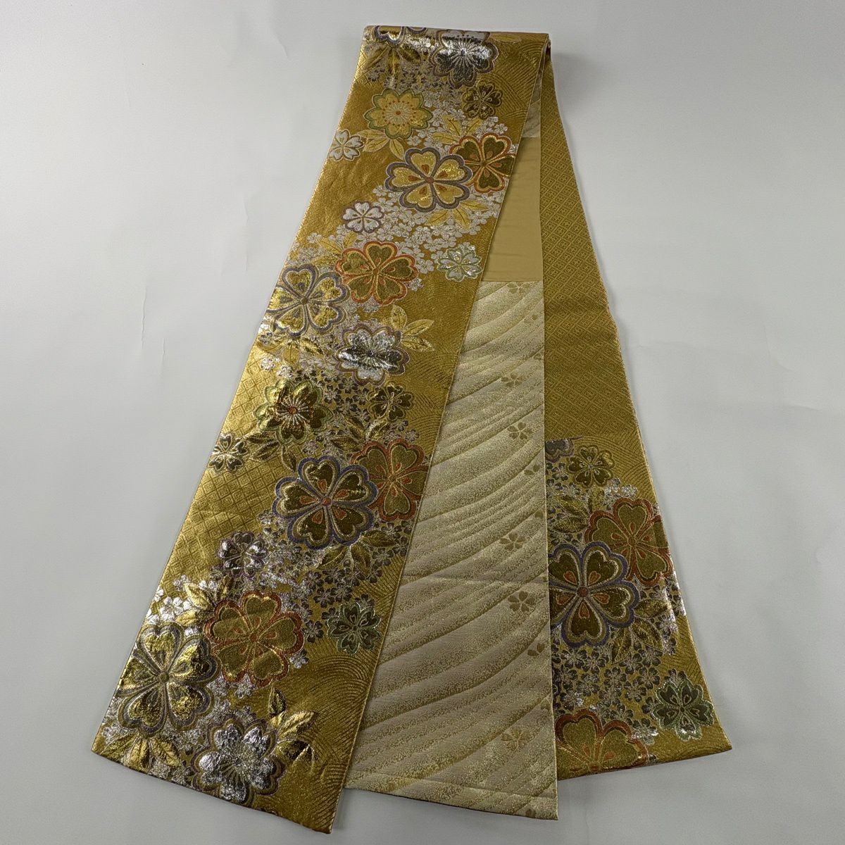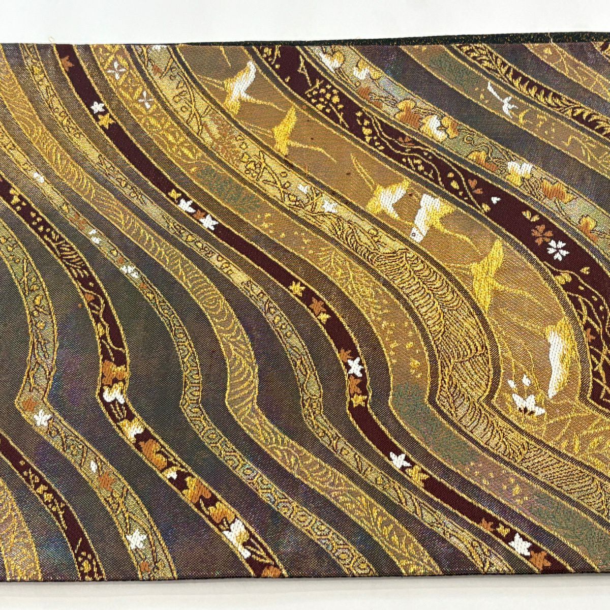 袋帯 秀品 草花 波 箔 金糸 金色 六通 正絹
