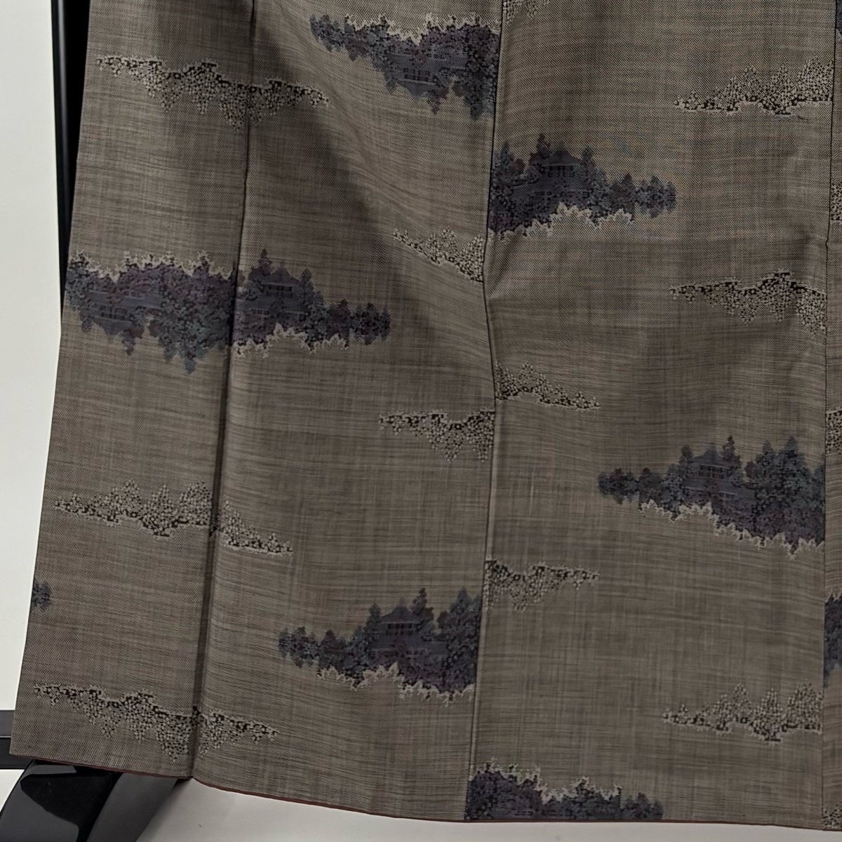 紬 身丈165cm 裄丈67.5cm L 袷 建物 樹木 焦茶色 正絹 秀品