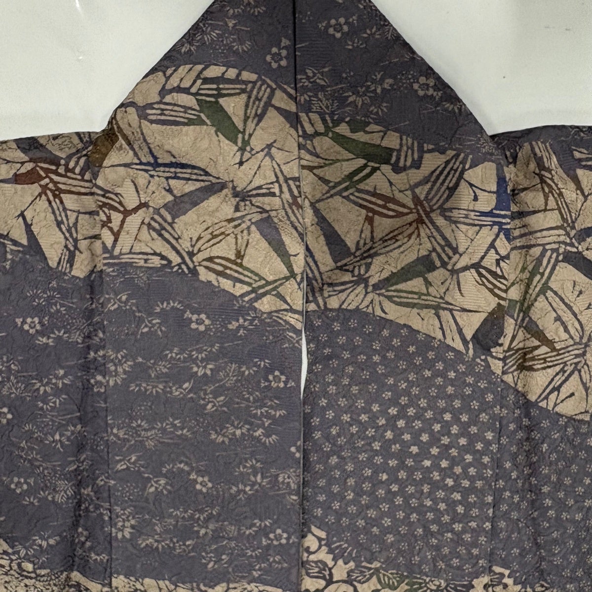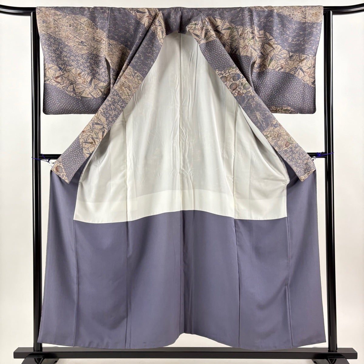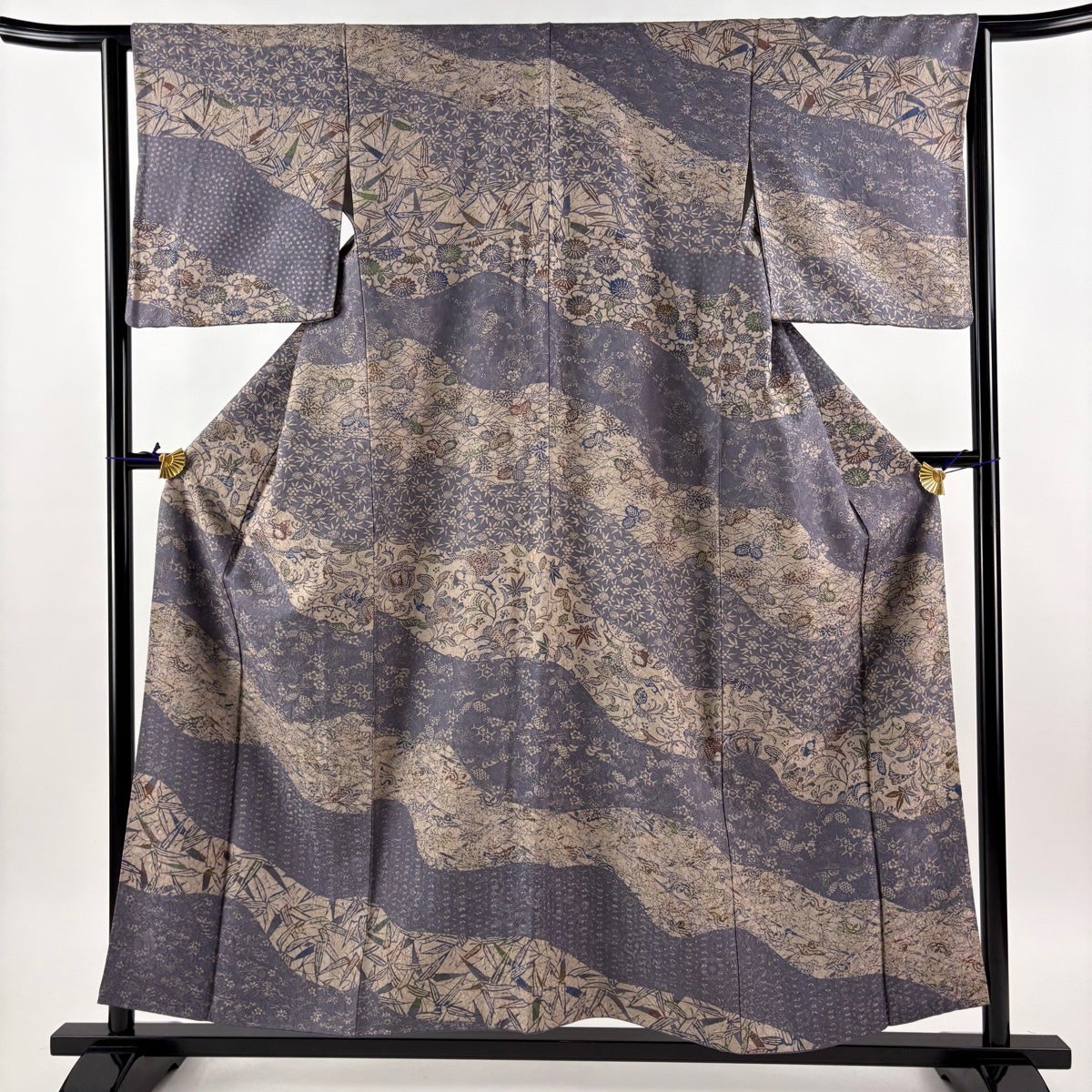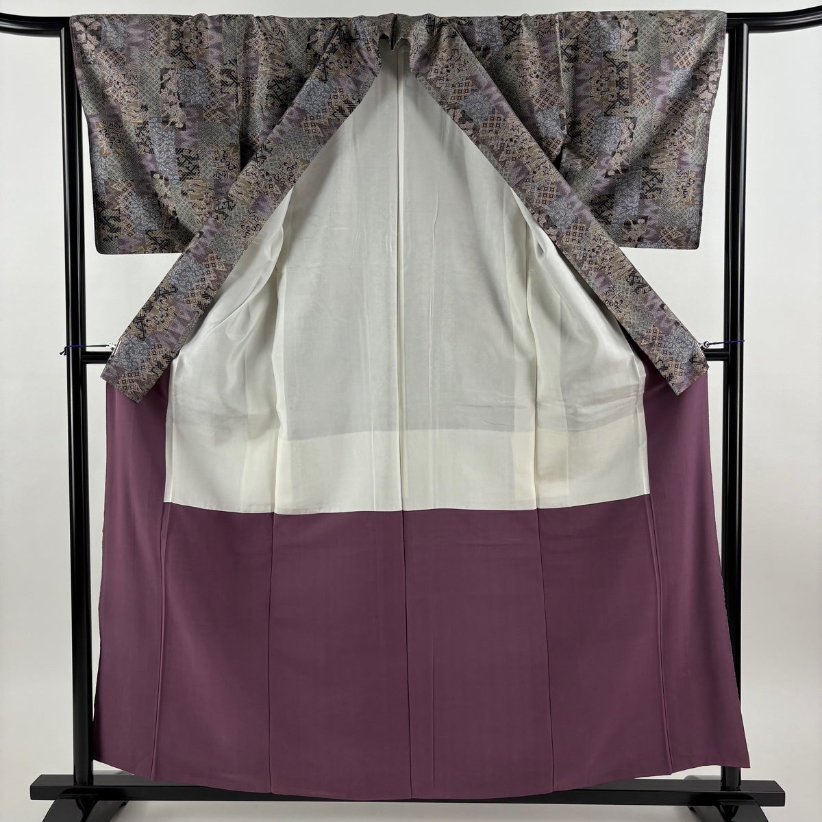紬 身丈159cm 裄丈64cm M 袷 草花 有職文様 灰紫 正絹 秀品