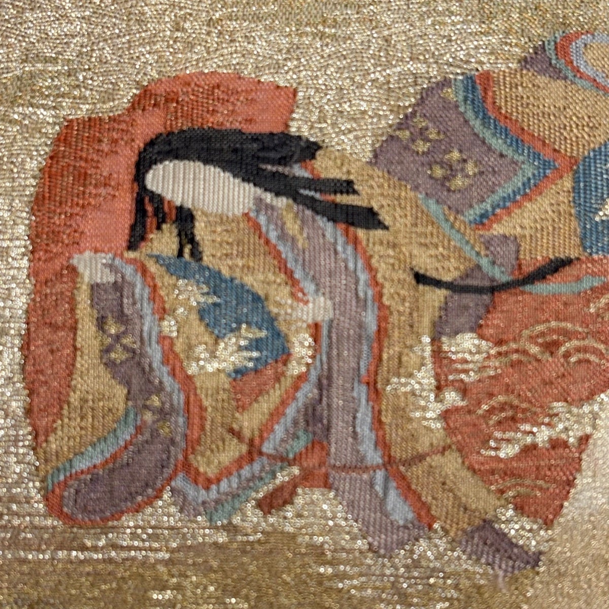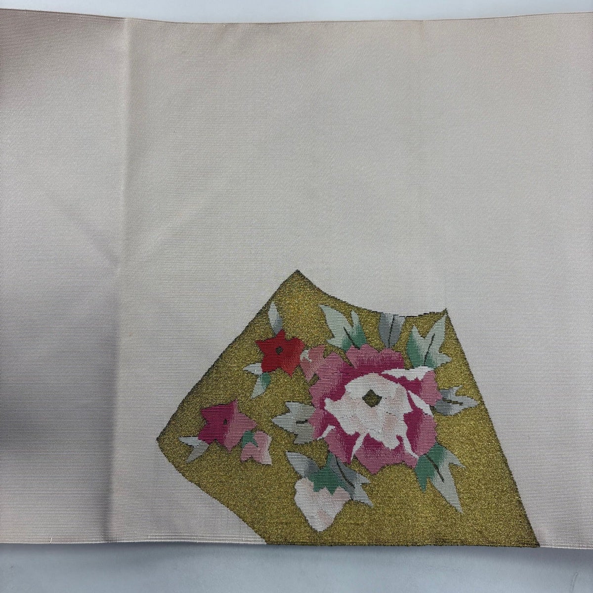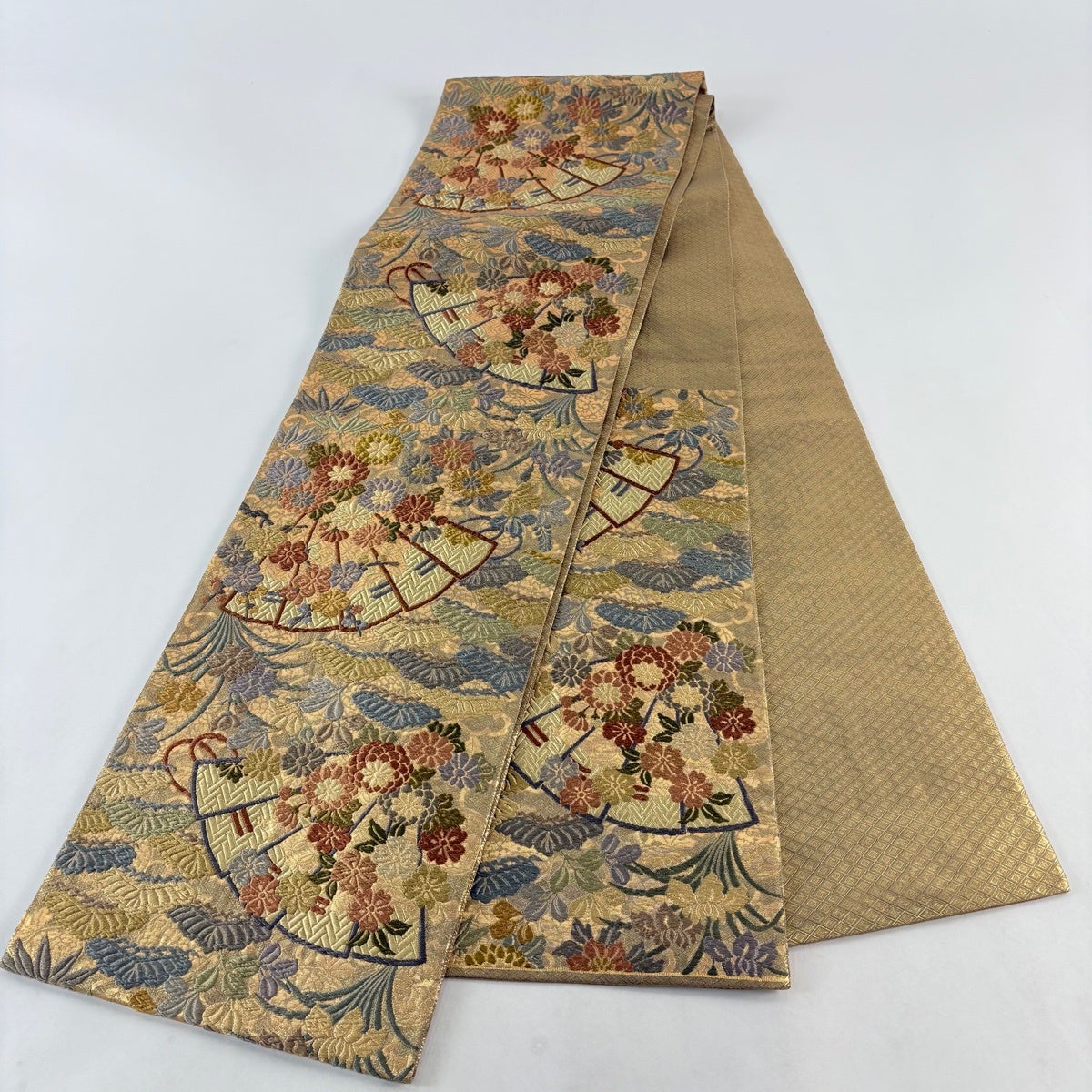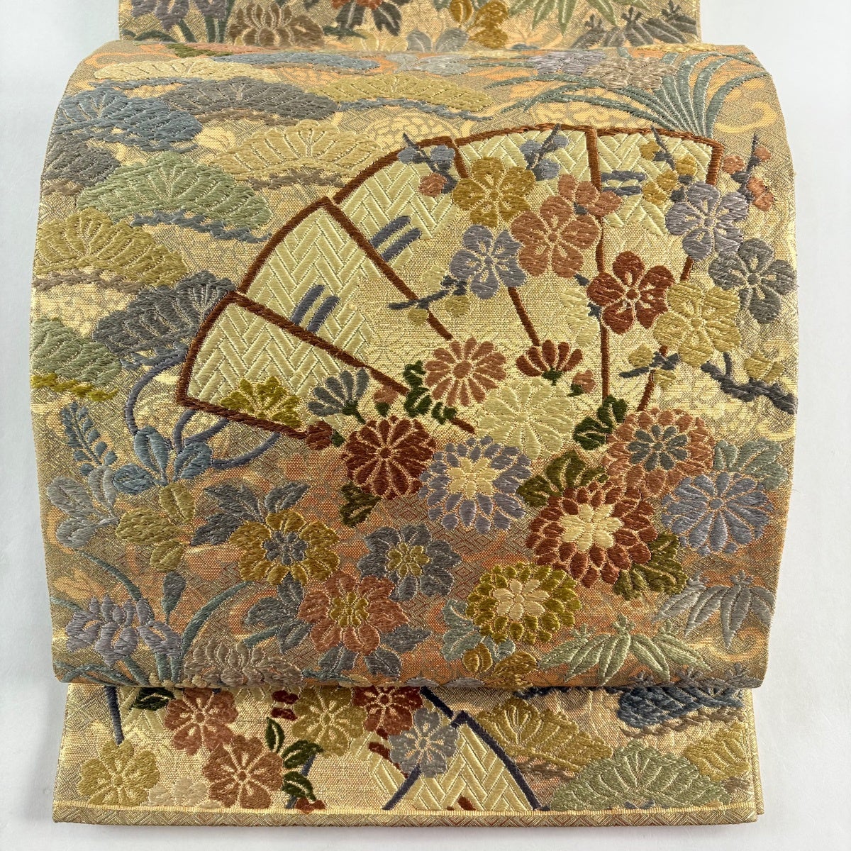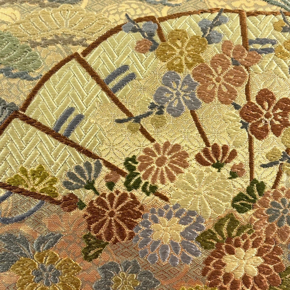 【美品】 袋帯 秀品 関西仕立て 桧扇 草花 箔 唐織 金色 六通 正絹