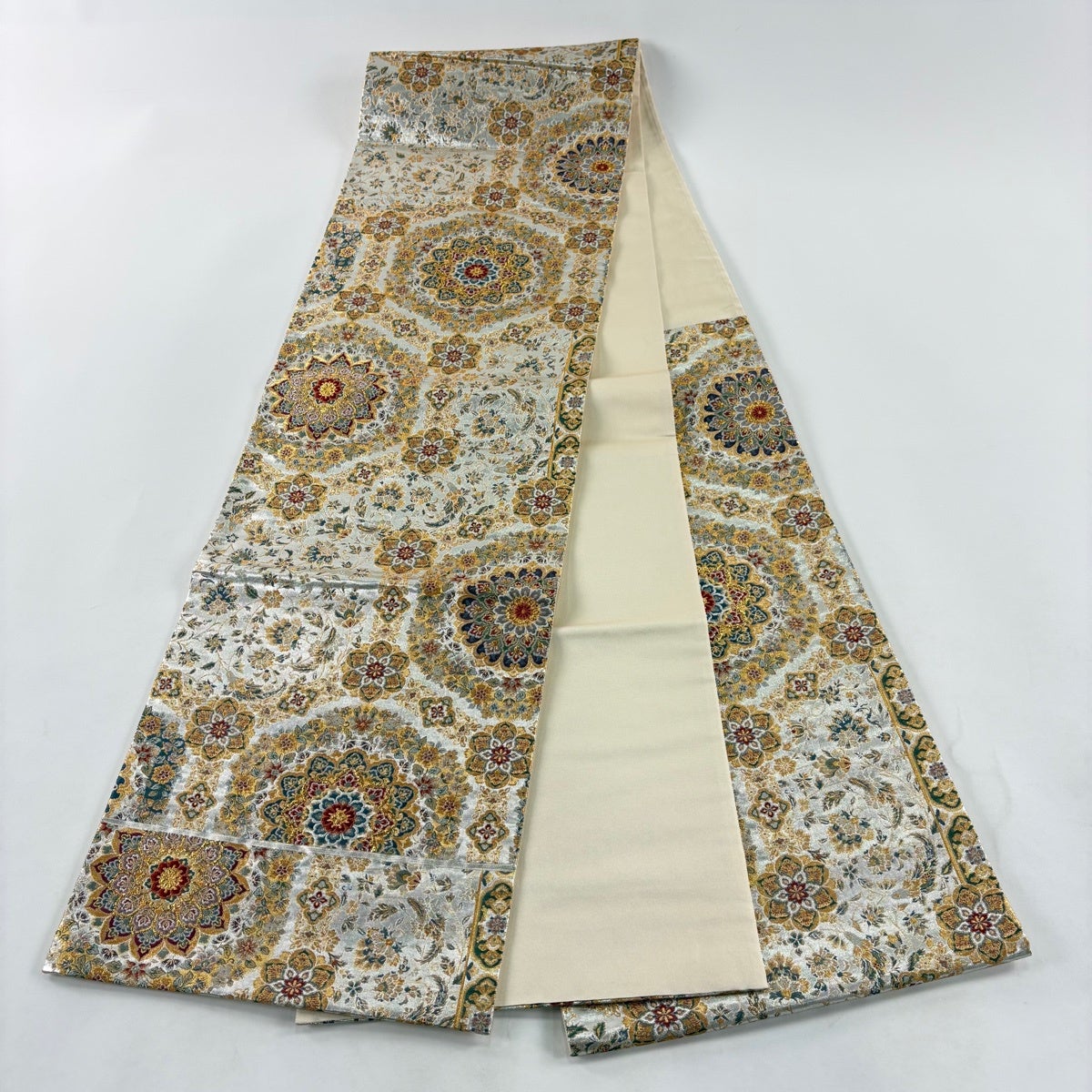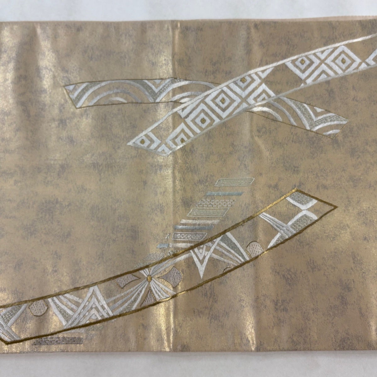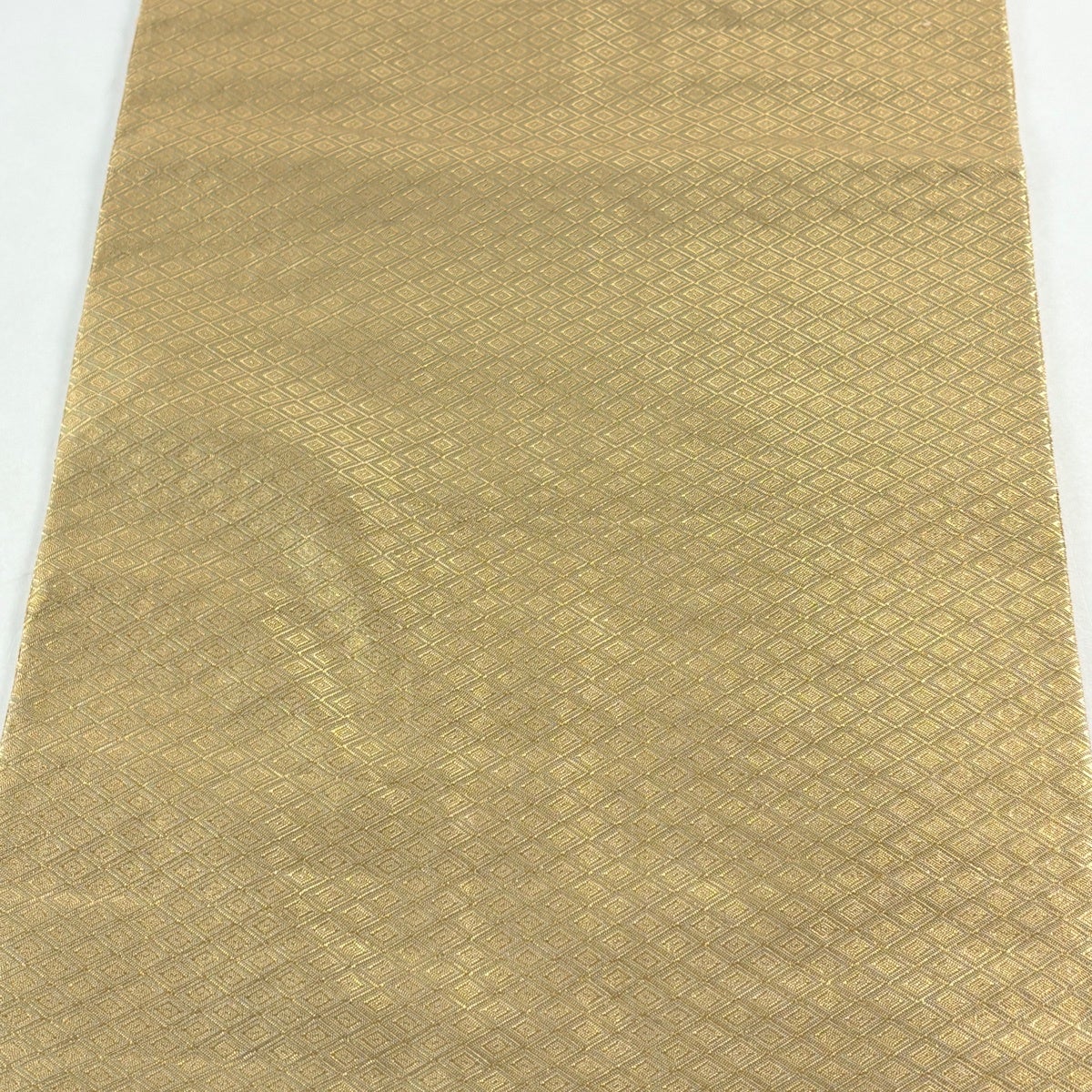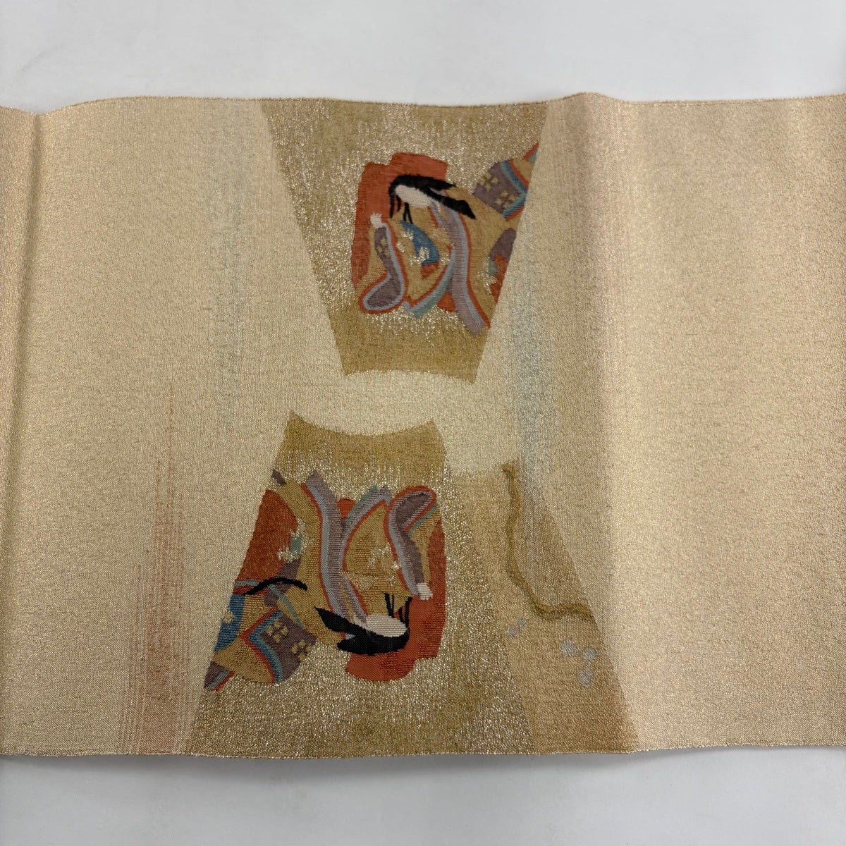 【美品】 名古屋帯 秀品 桜 幾何学模様 金糸 唐織 ベージュ 正絹