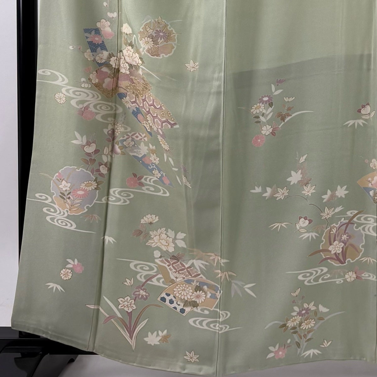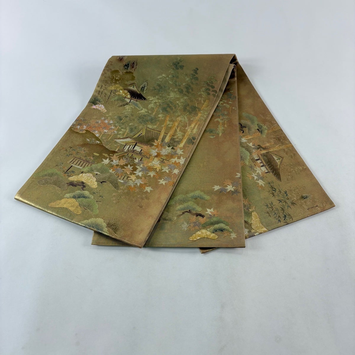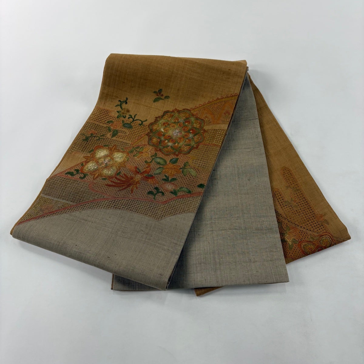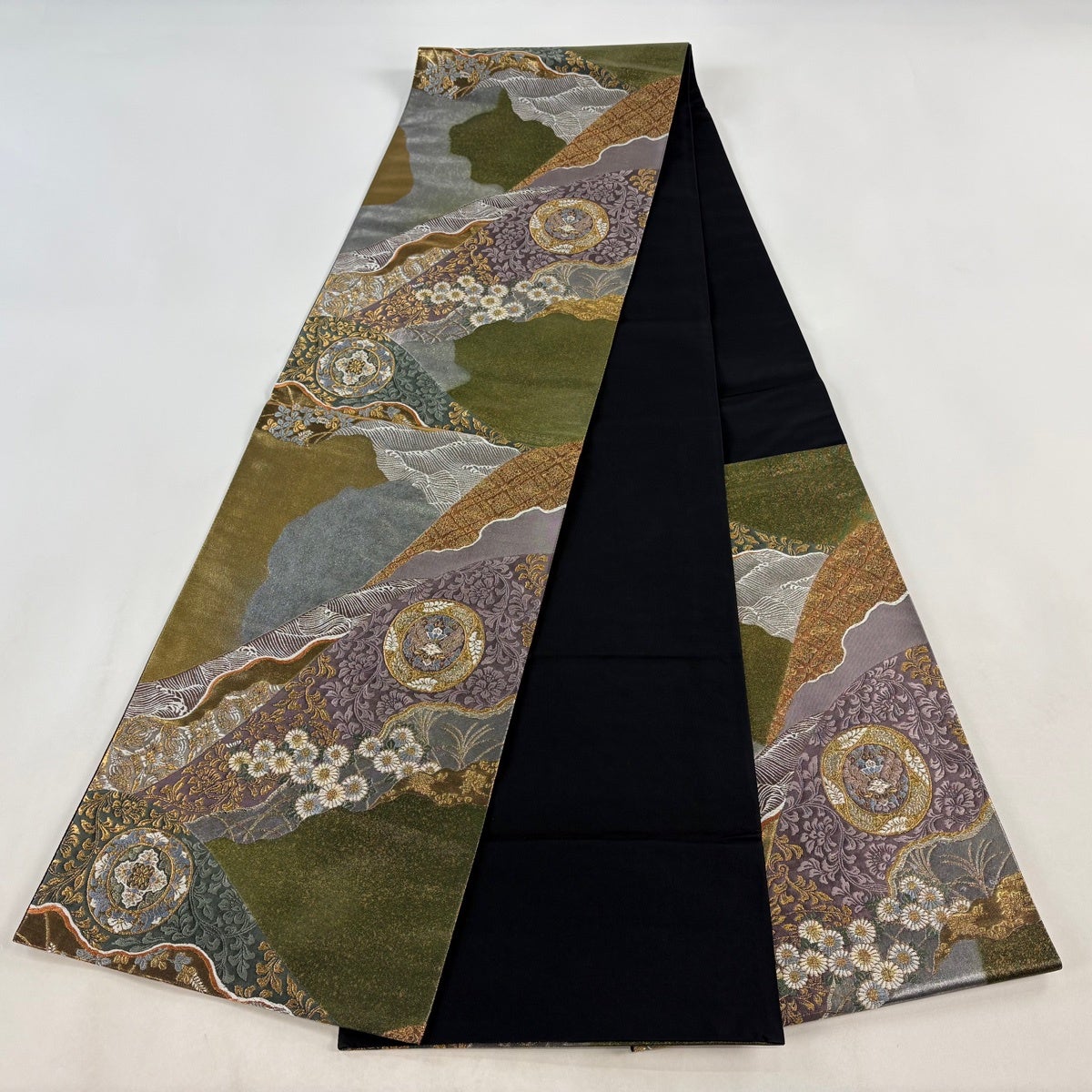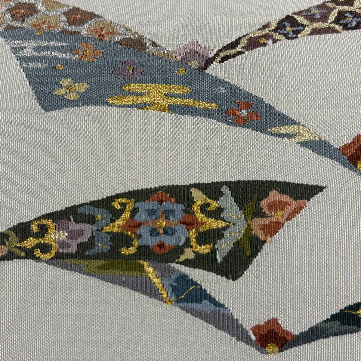 【美品】 袋帯 秀品 証紙あり 扇面 草花 刺繍 金糸 灰緑 六通 正絹