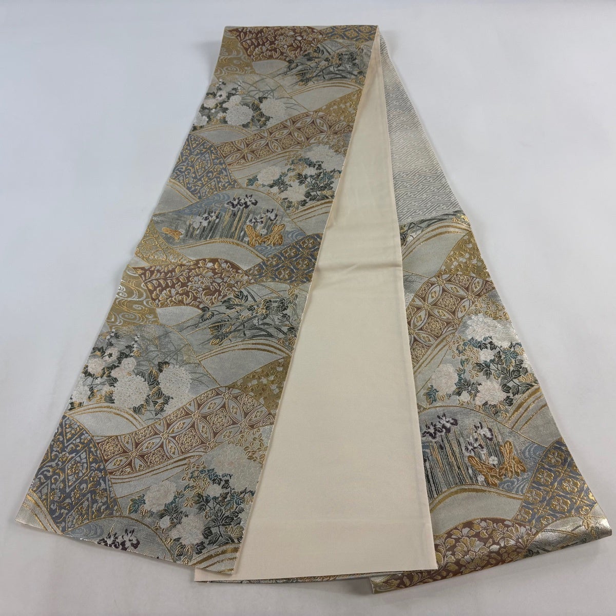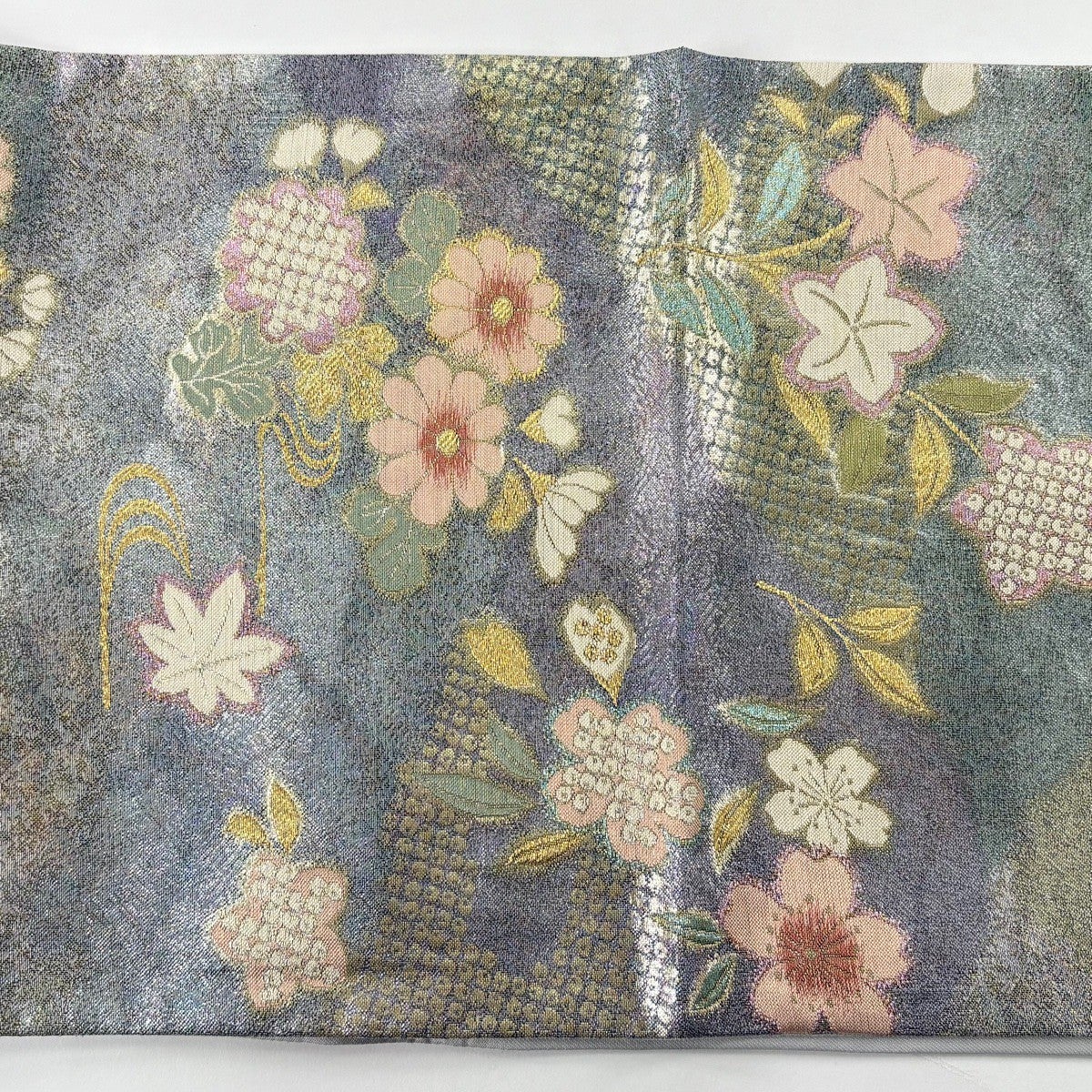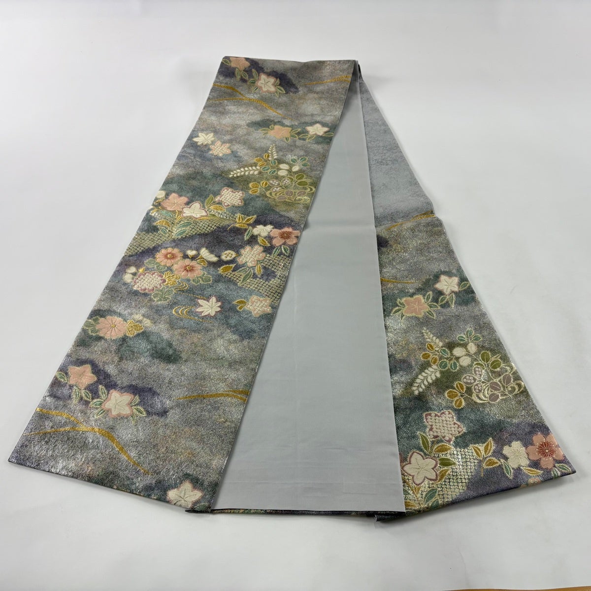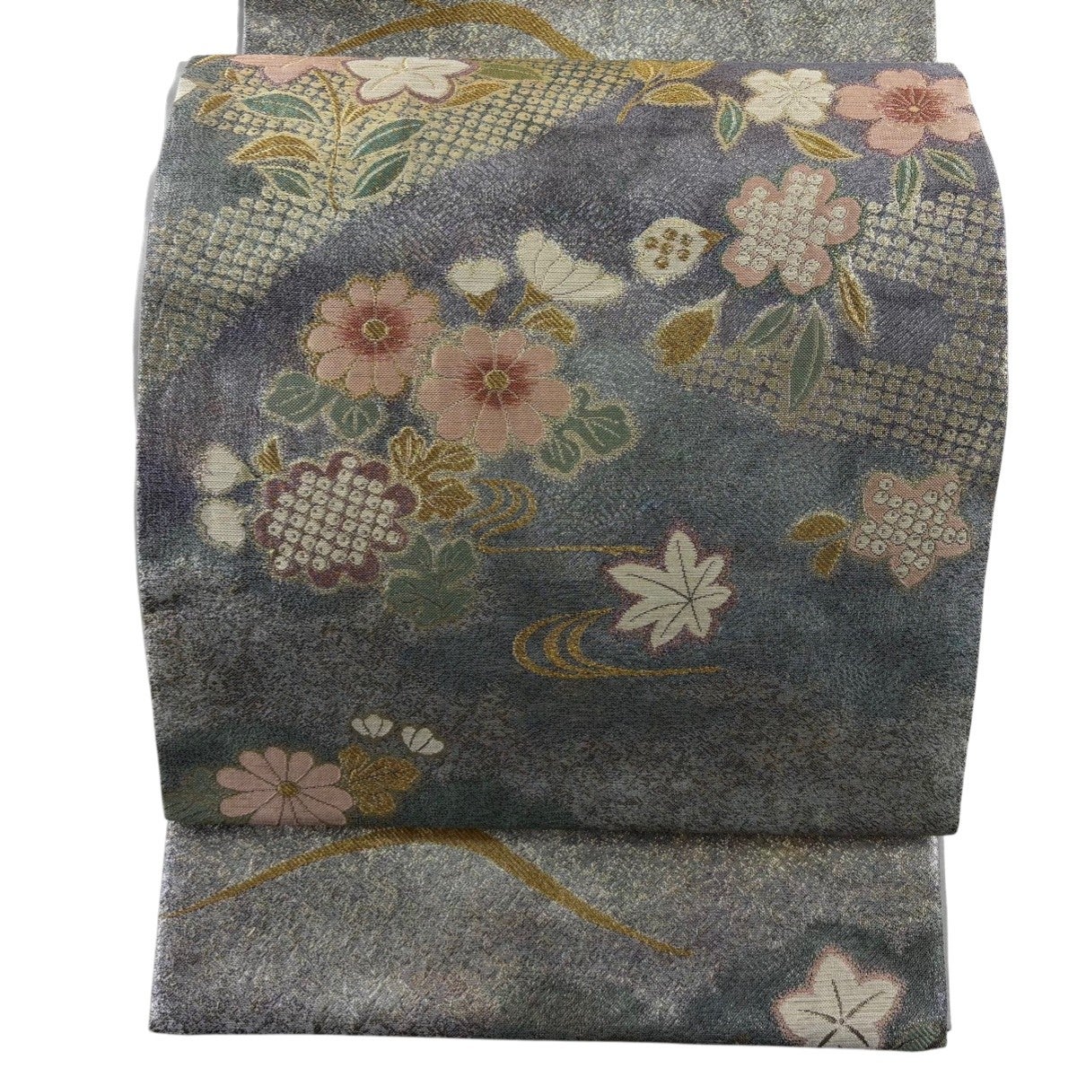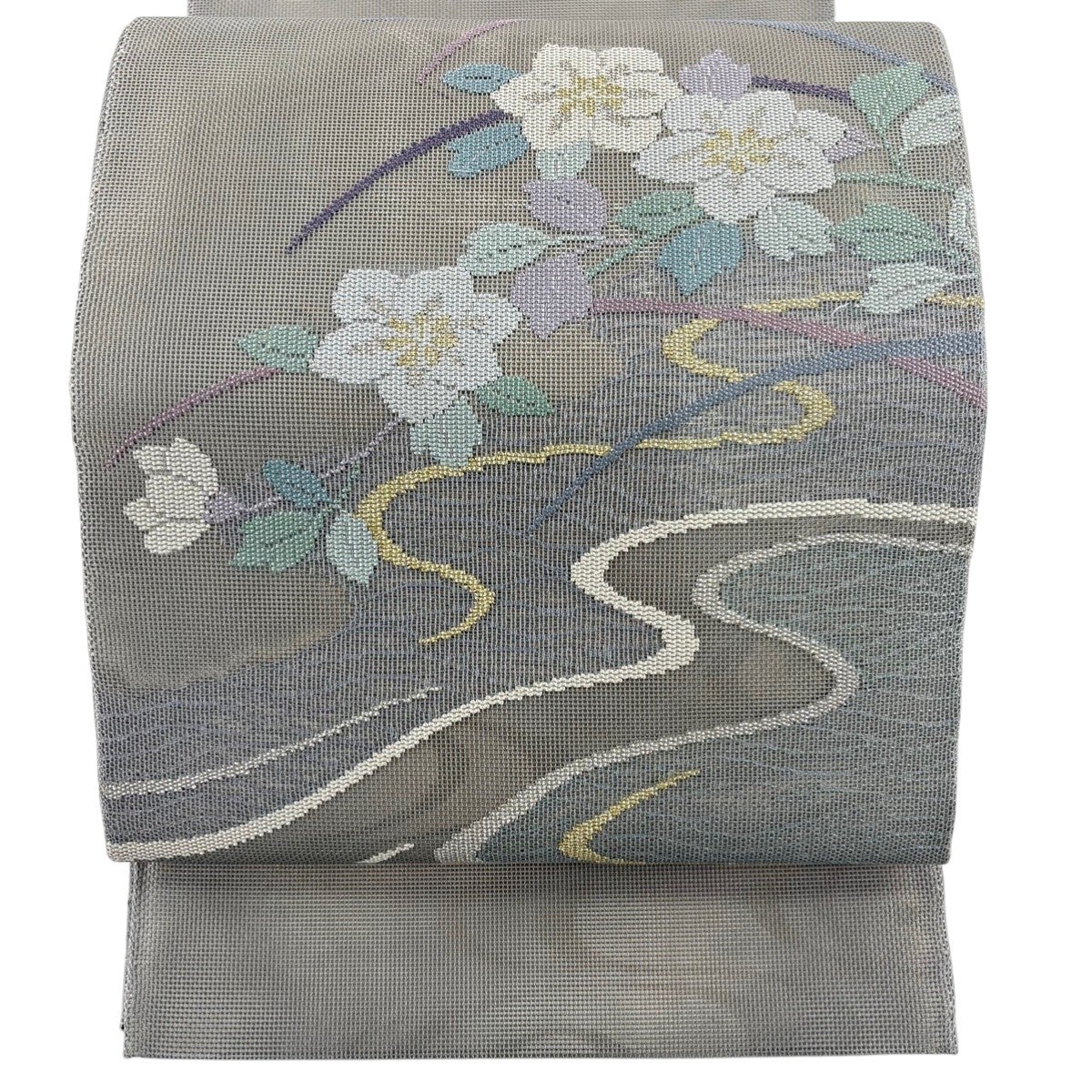 【美品】 袋帯 秀品 夏帯 草花 流水 金銀糸 箔 灰色 お太鼓柄 正絹