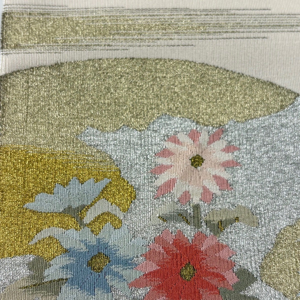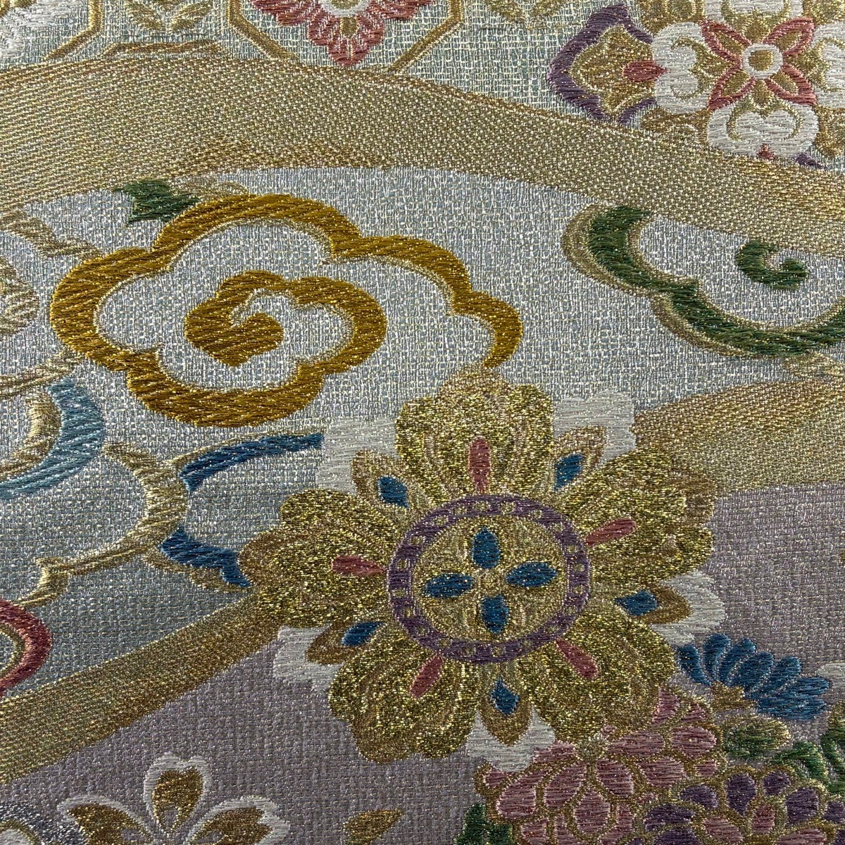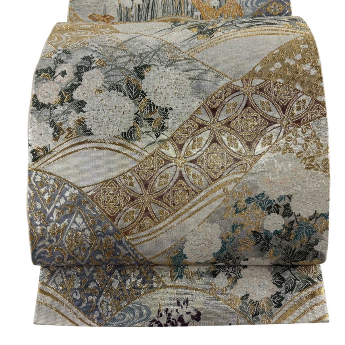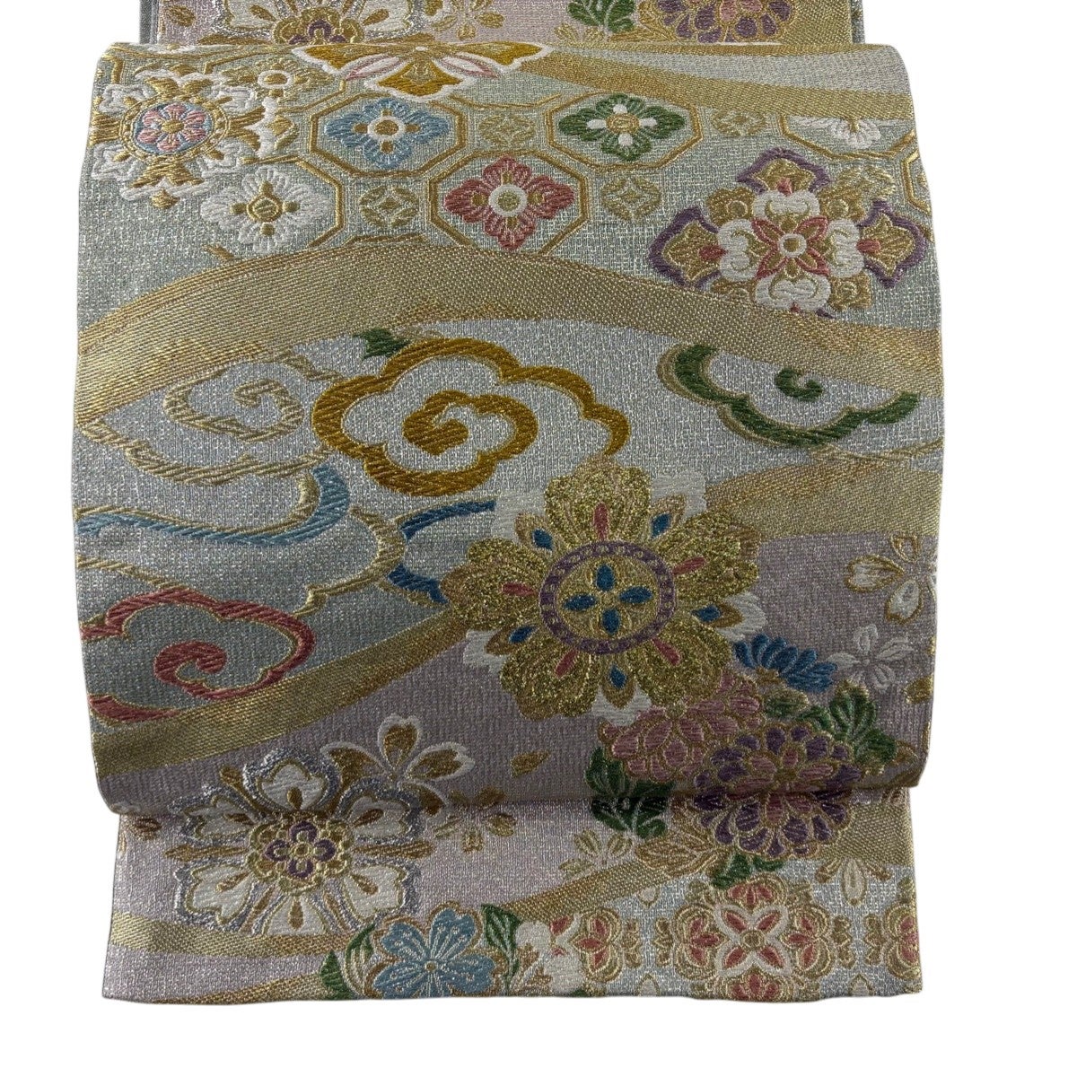 【美品】 袋帯 秀品 夏帯 草花 流水 金銀糸 箔 灰色 お太鼓柄 正絹