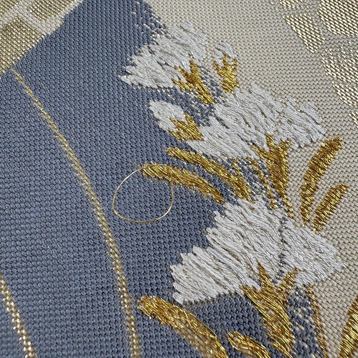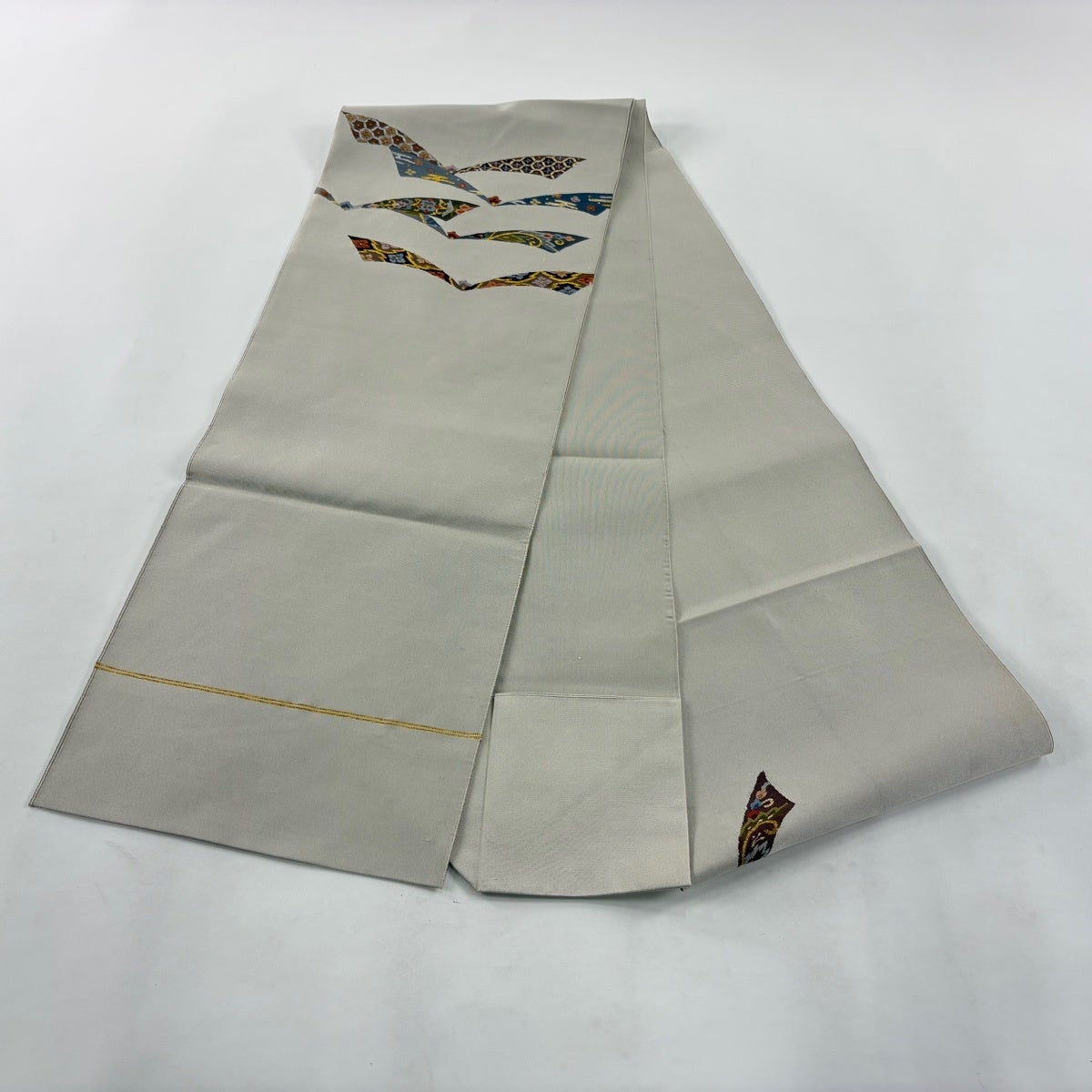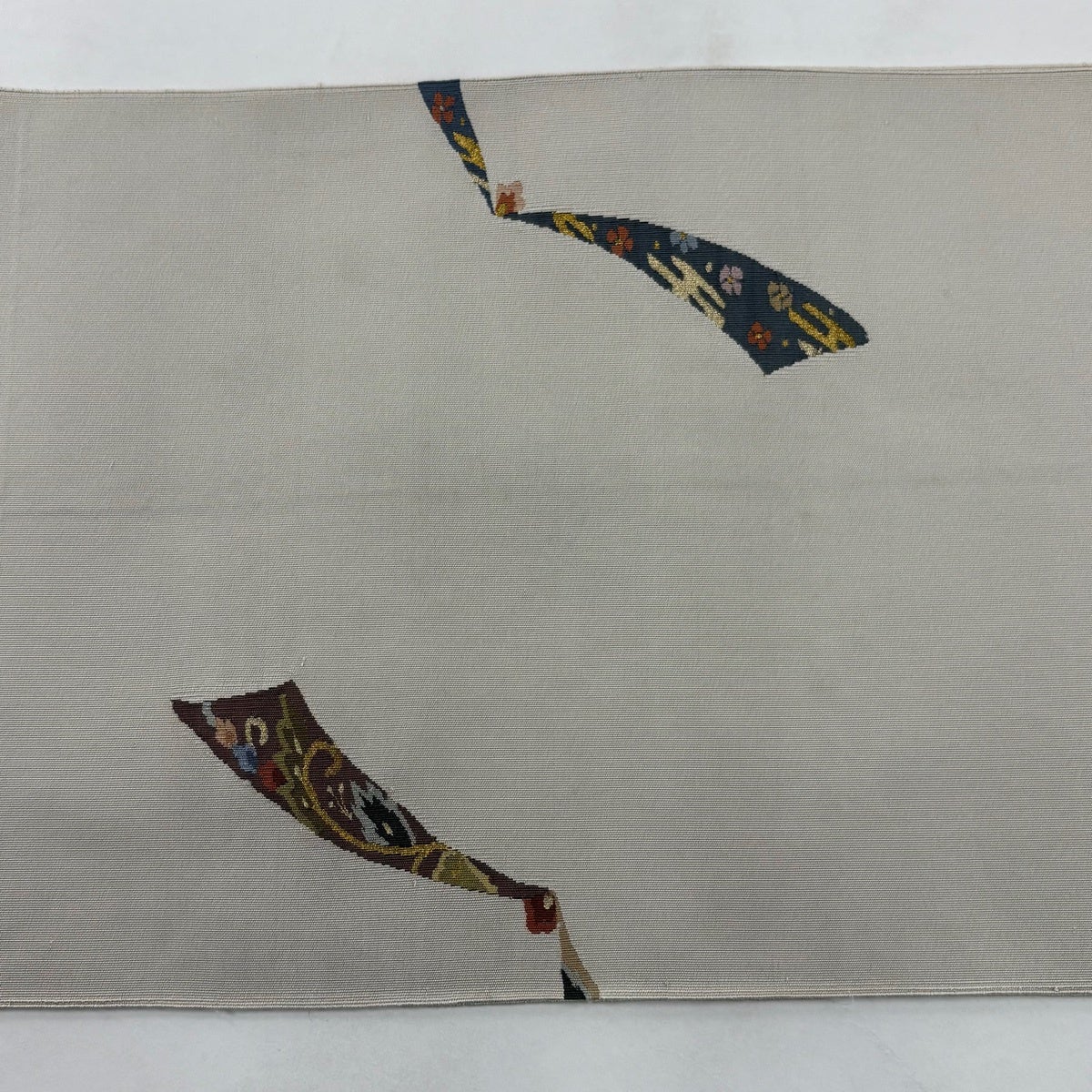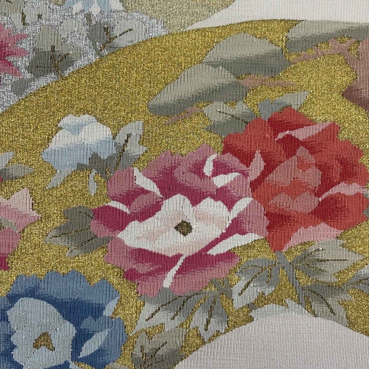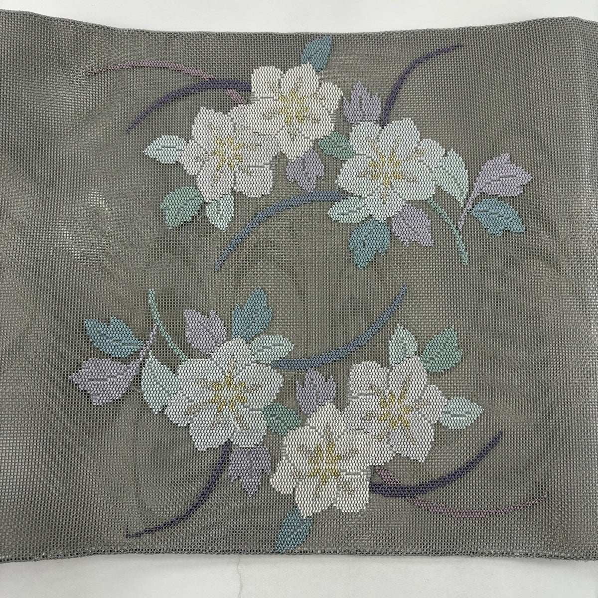 【美品】 袋帯 秀品 夏帯 草花 流水 金銀糸 箔 灰色 お太鼓柄 正絹
