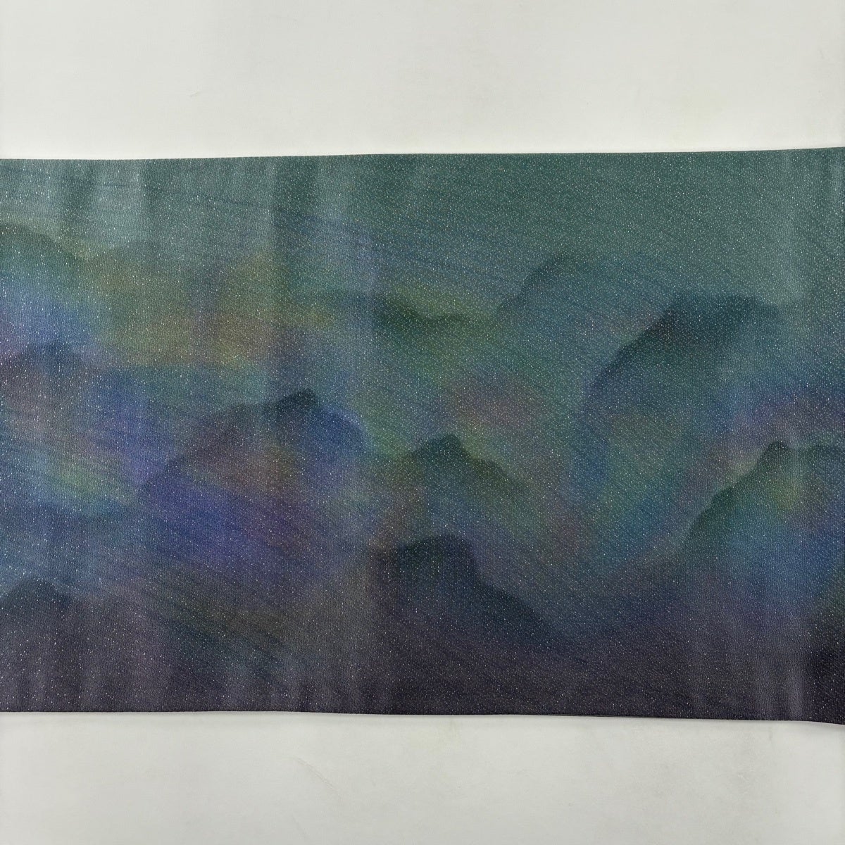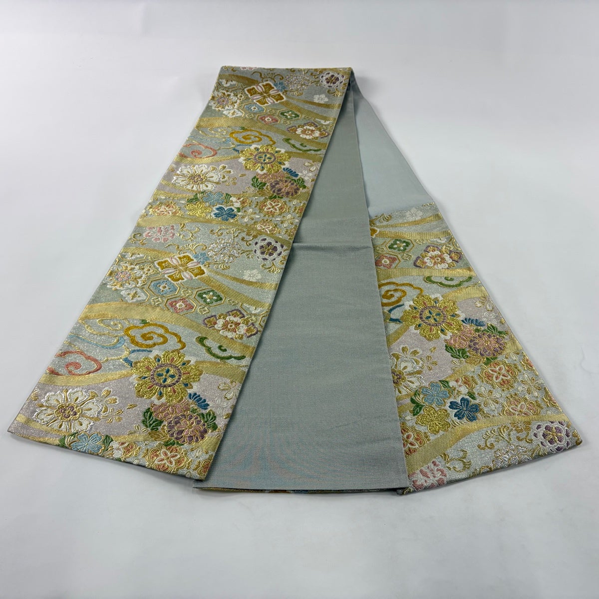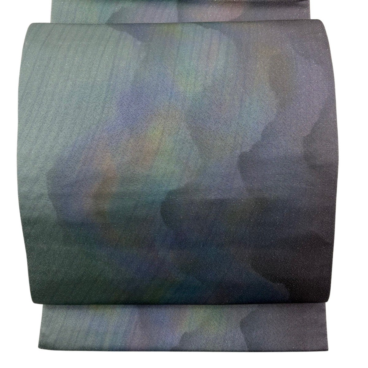 【美品】 袋帯 秀品 落款あり 霞 流線 箔 ぼかし 青灰色 全通 正絹