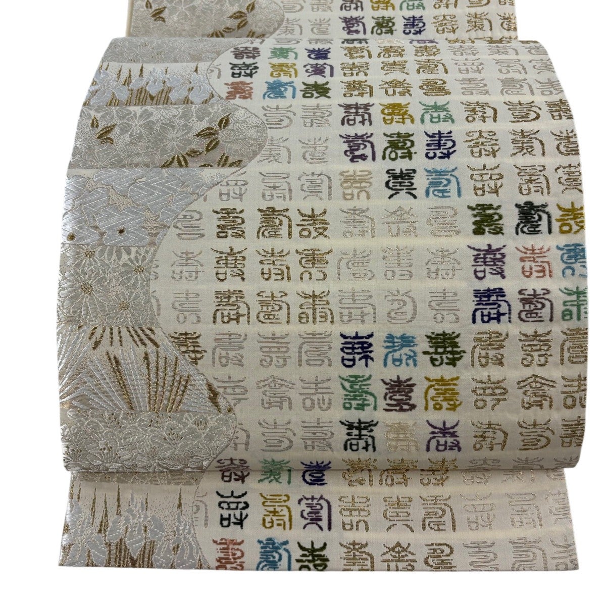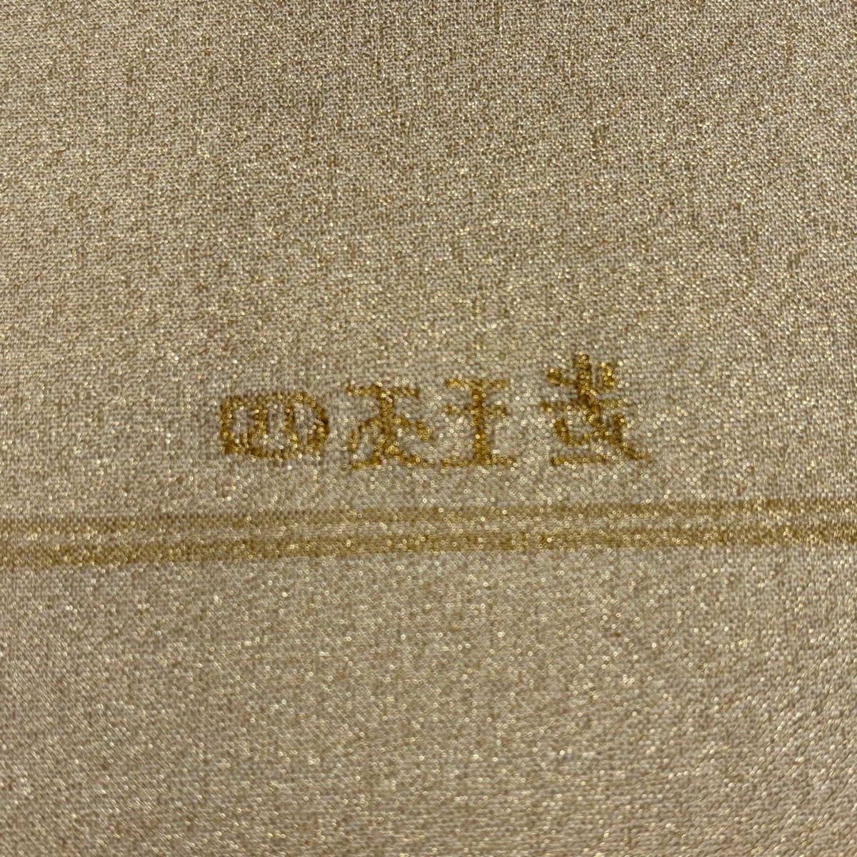 【美品】 袋帯 秀品 文字文 草花 刺繍 金糸 ベージュ 六通 正絹