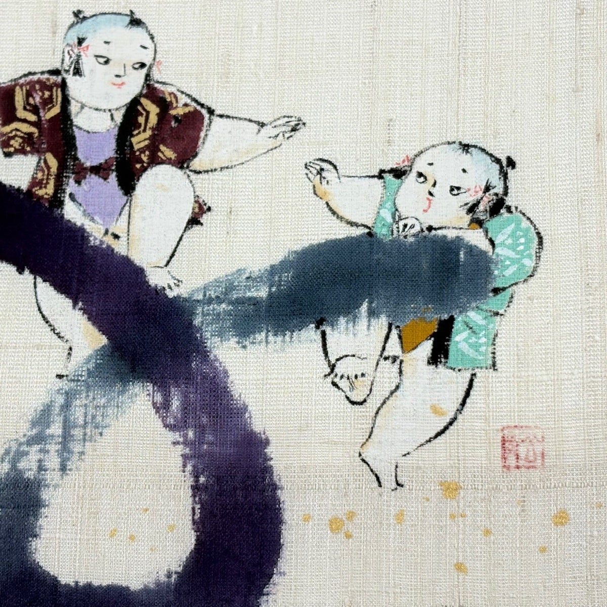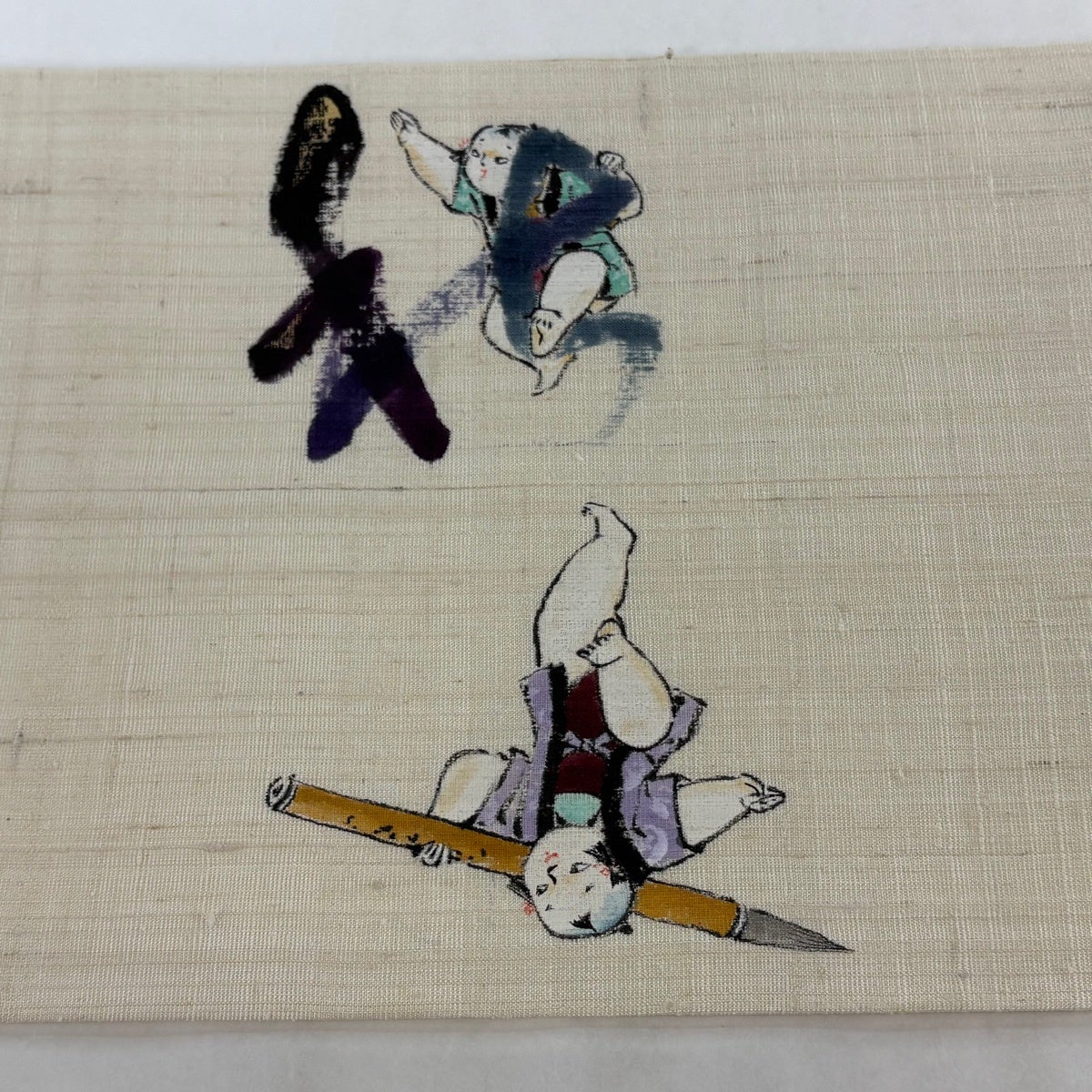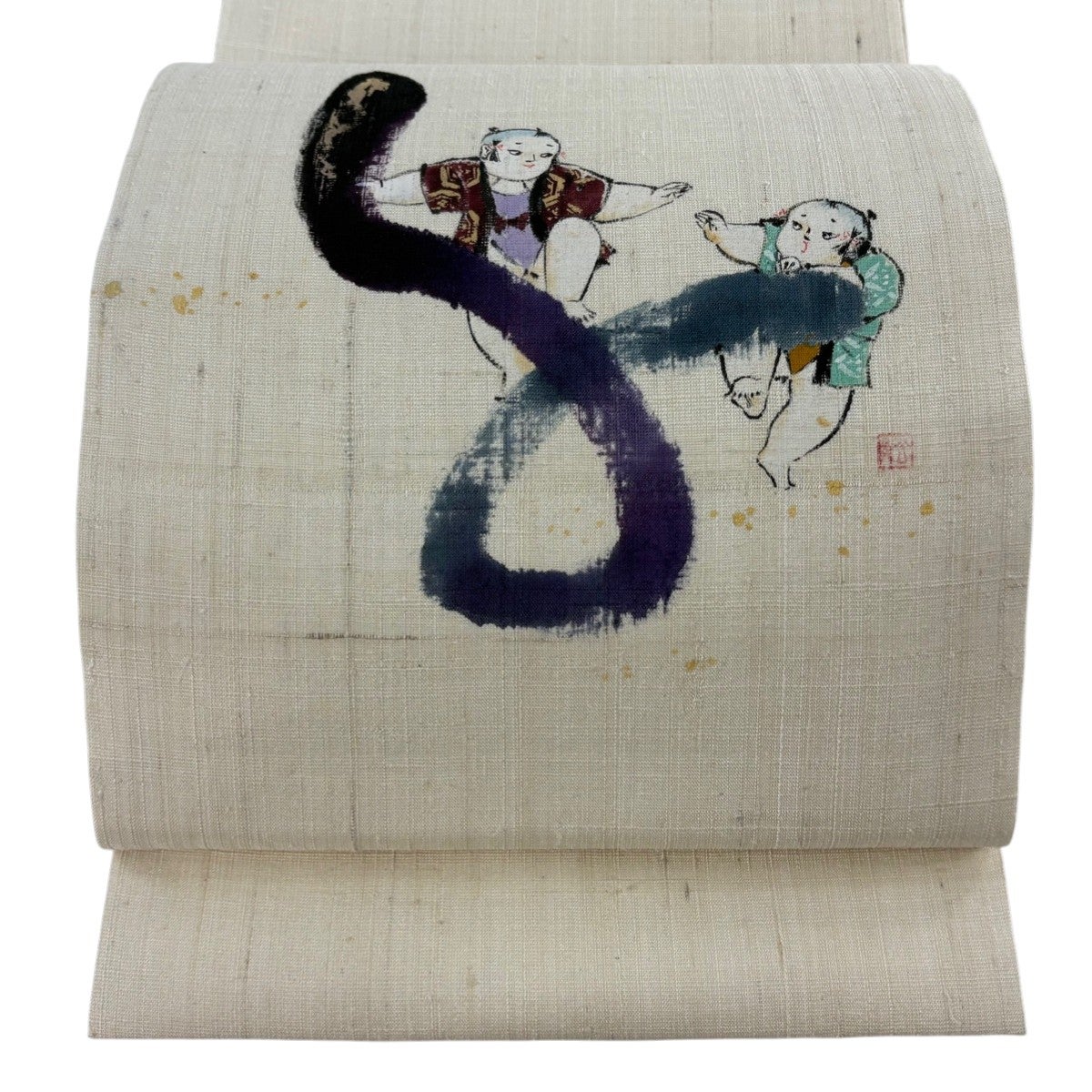 開き名古屋帯 秀品 落款あり 紬地 童 文字文 金彩 ベージュ 正絹