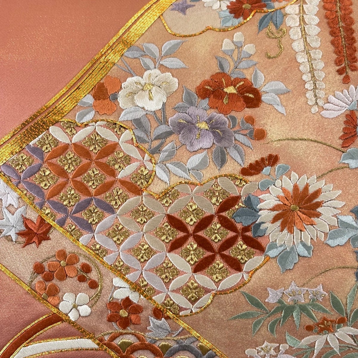 反物 秀品 小紋 加賀友禅 落款 幾何学模様 ピンクベージュ 正絹