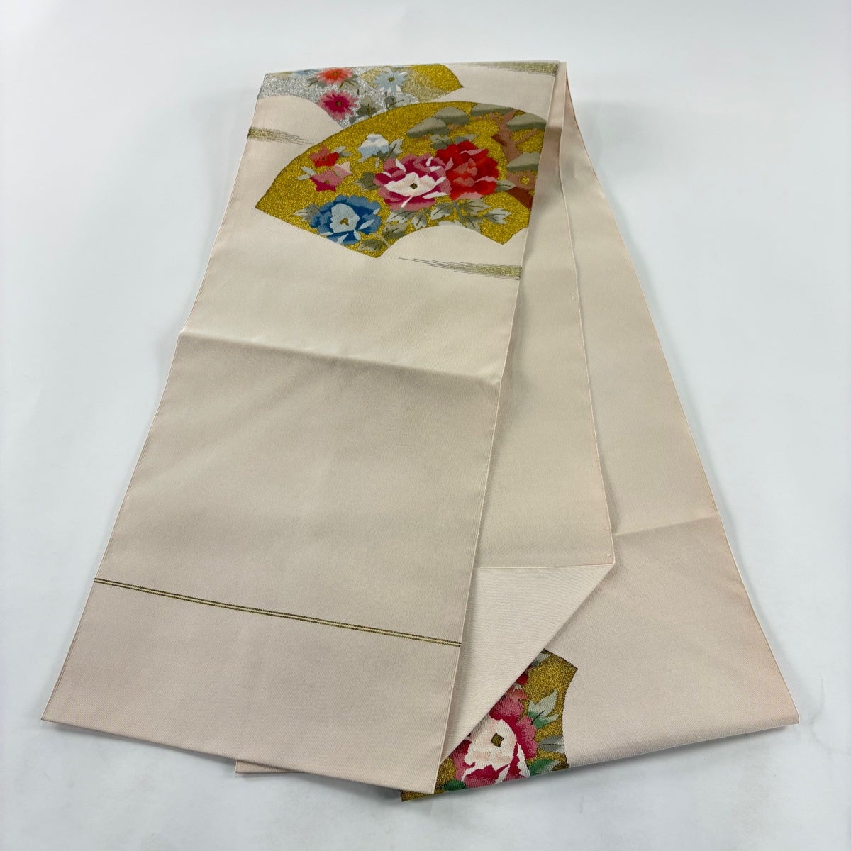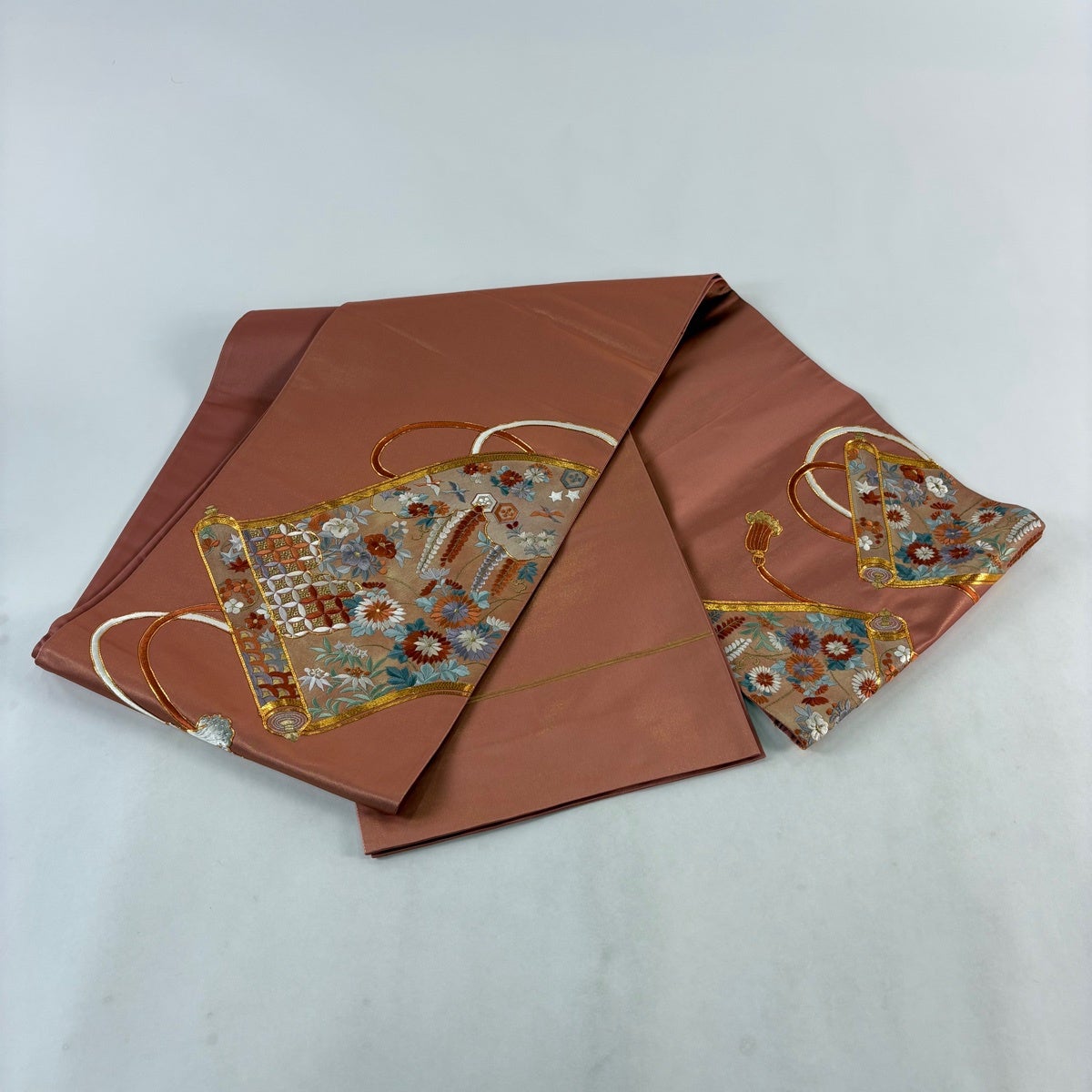 袋帯 秀品 巻物 草花 金糸 刺繍 ピンクベージュ お太鼓柄 正絹