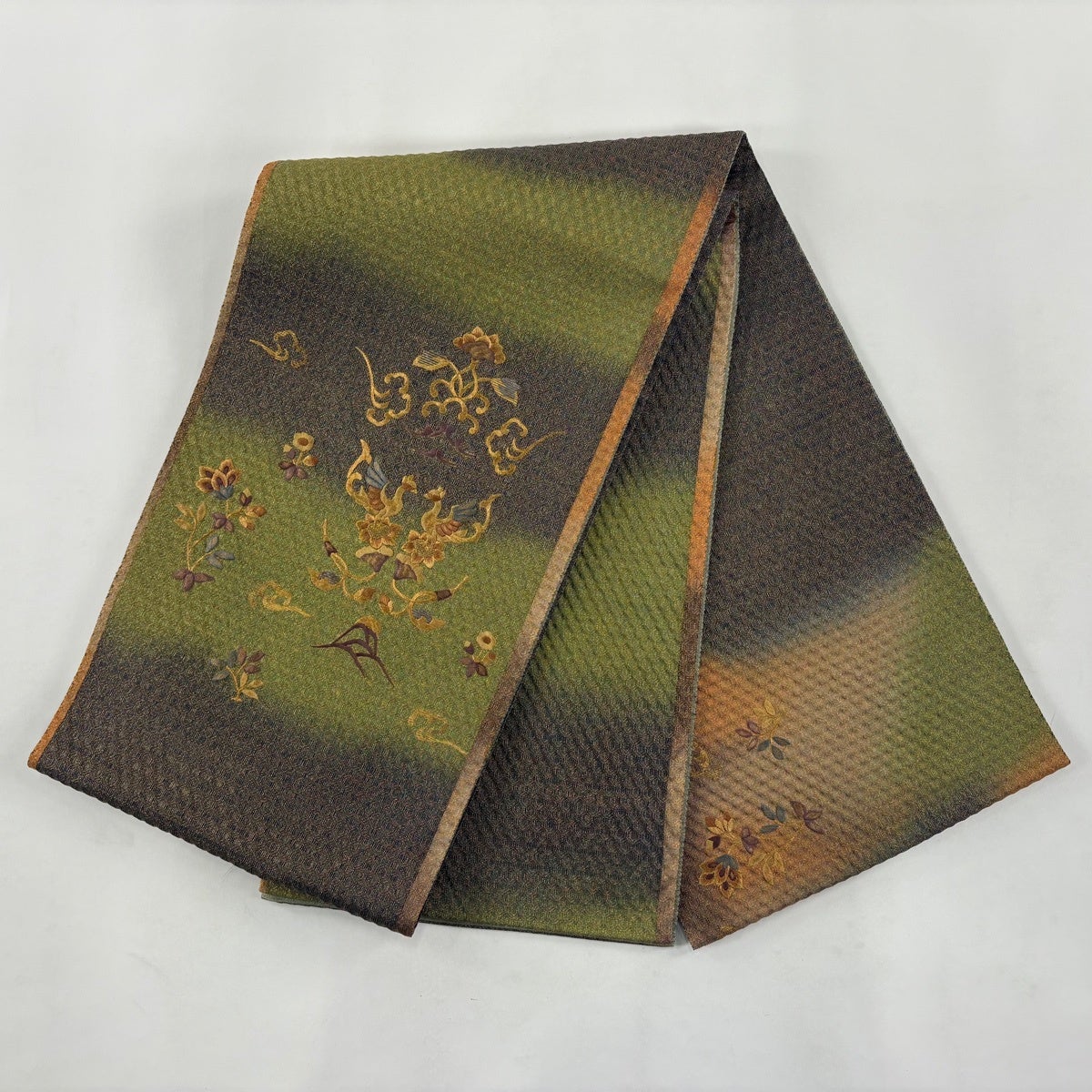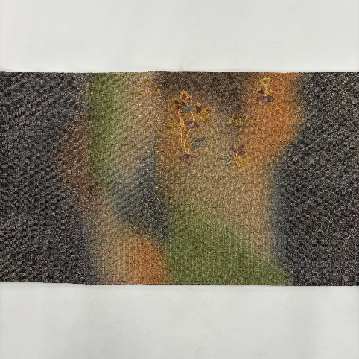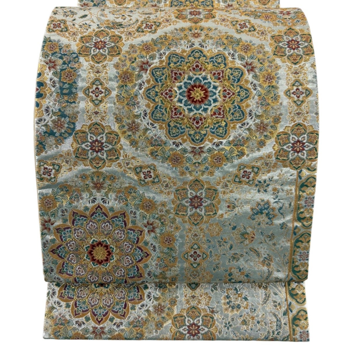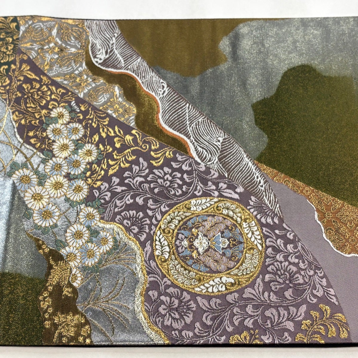 【美品】 袋帯 秀品 振袖向き 華文 草花 金銀糸 箔 灰緑 六通 正絹