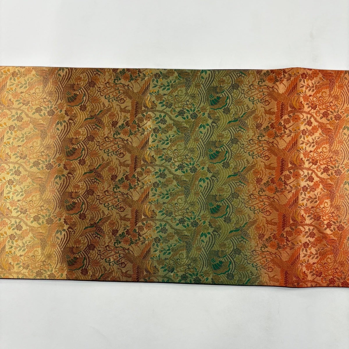 【美品】 袋帯 秀品 関西仕立て 花鳥 縞 箔 ぼかし 茶色 全通 正絹