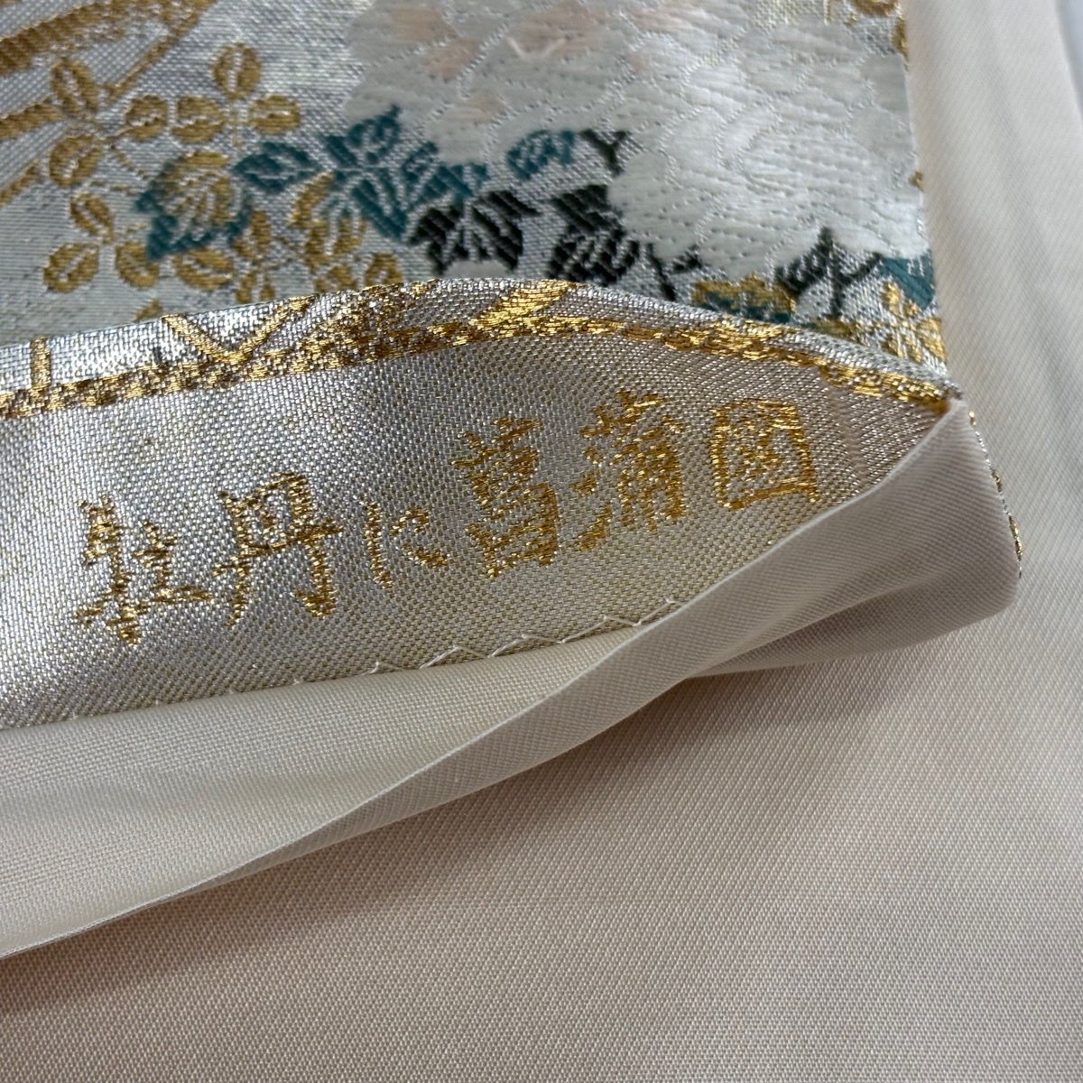 【美品】 袋帯 秀品 牡丹に菖蒲図 七宝花菱 金糸 箔 銀色 六通 正絹