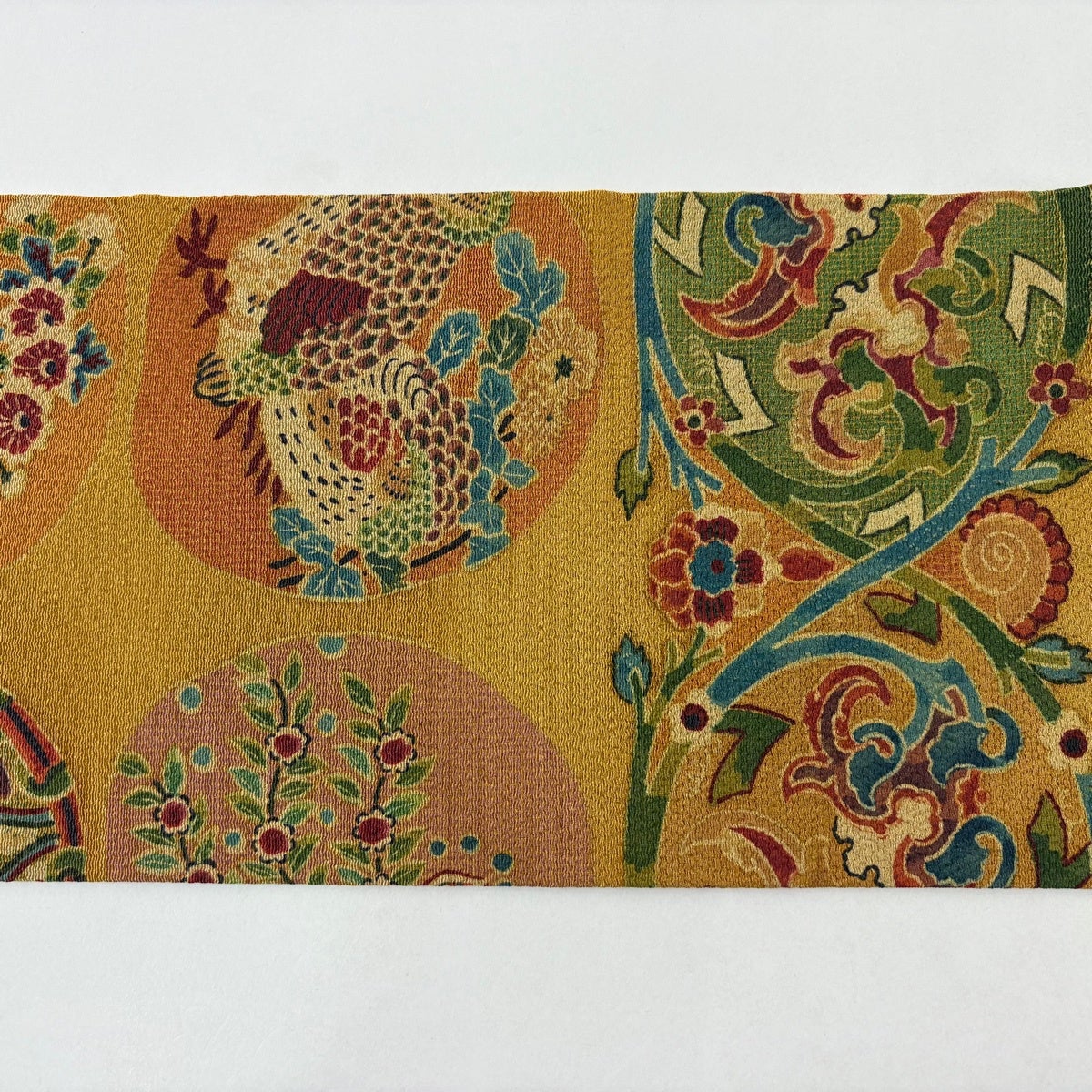 【美品】 名古屋帯 秀品 山岡古都 落款あり 草花 鳥 縮緬 山吹色 正絹