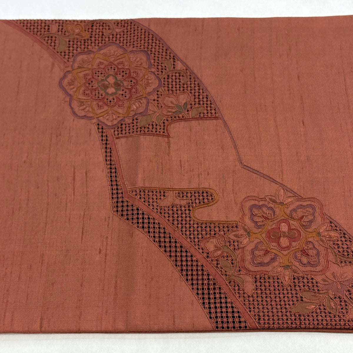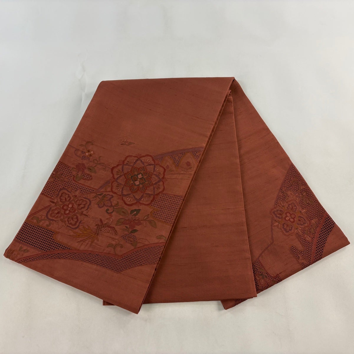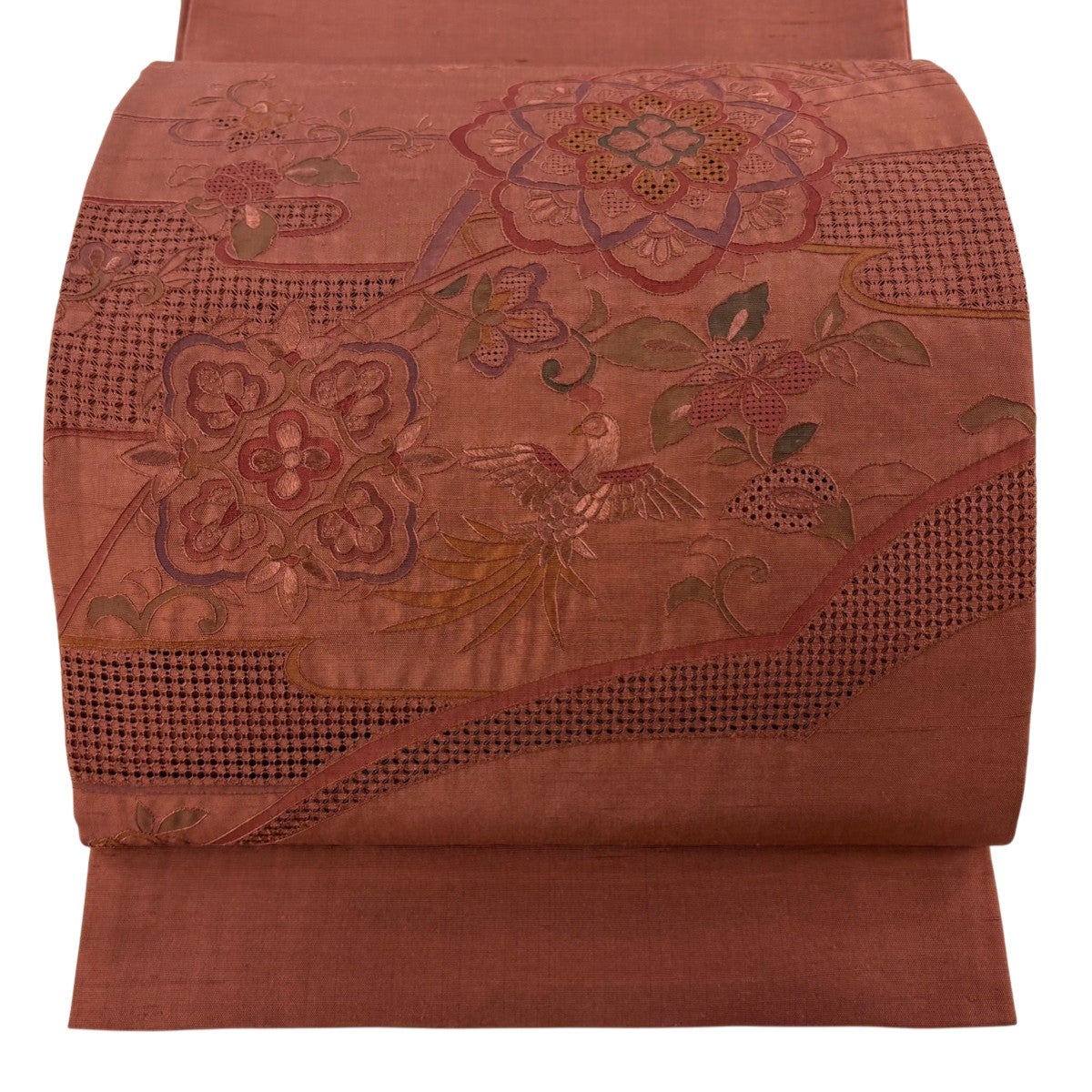 【美品】 袋帯 秀品 紬地 華文 花鳥 刺繍 金彩 茶色 お太鼓柄 正絹