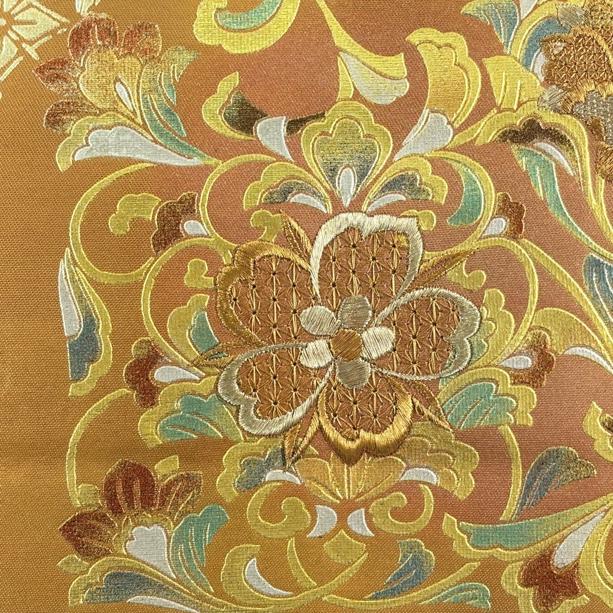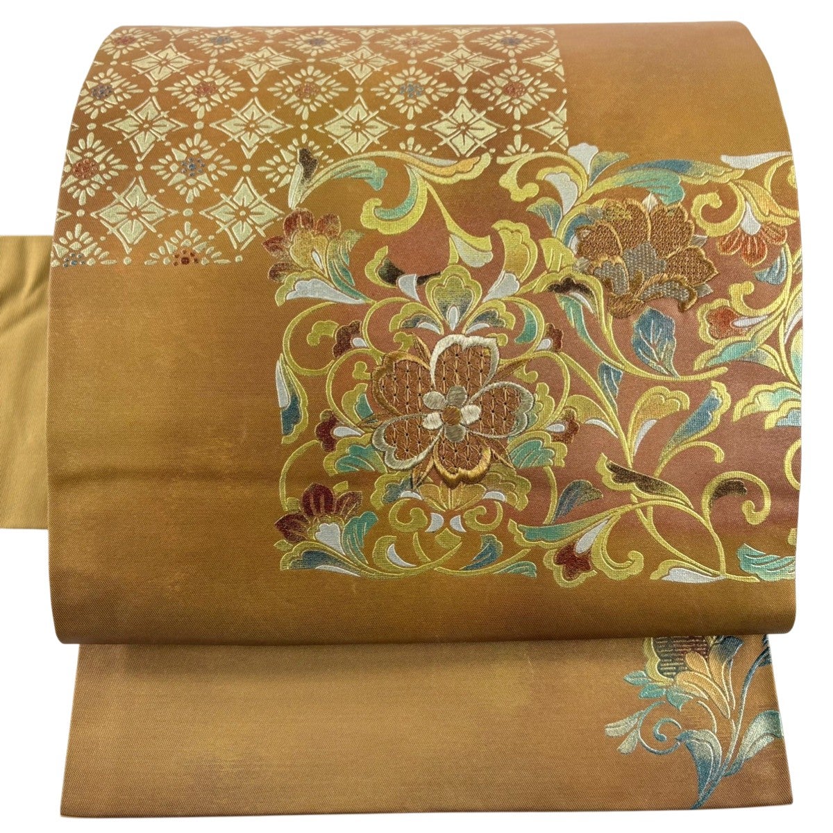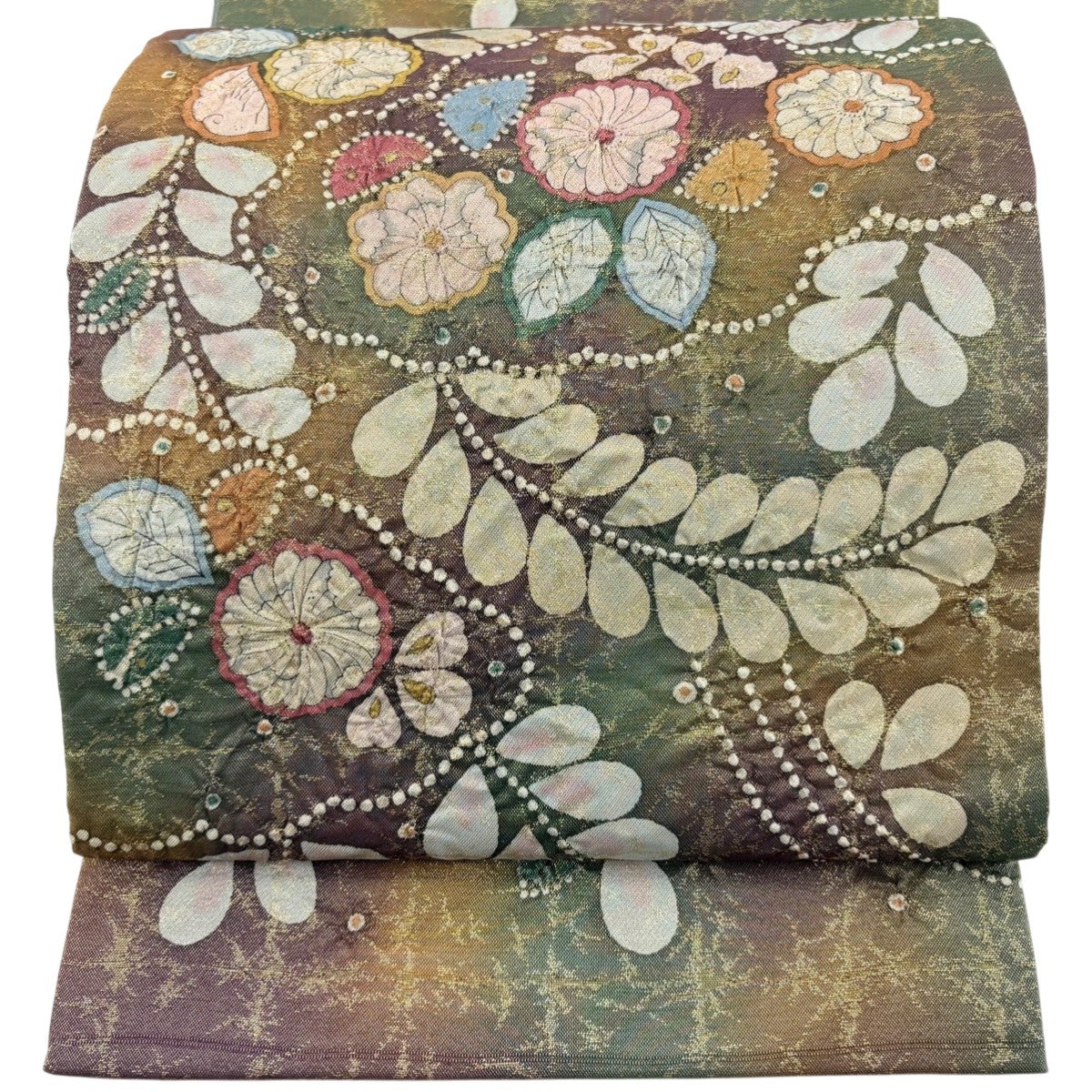 【美品】 袋帯 秀品 華文 花唐草 金糸 刺繍 薄黄土色 お太鼓柄 正絹