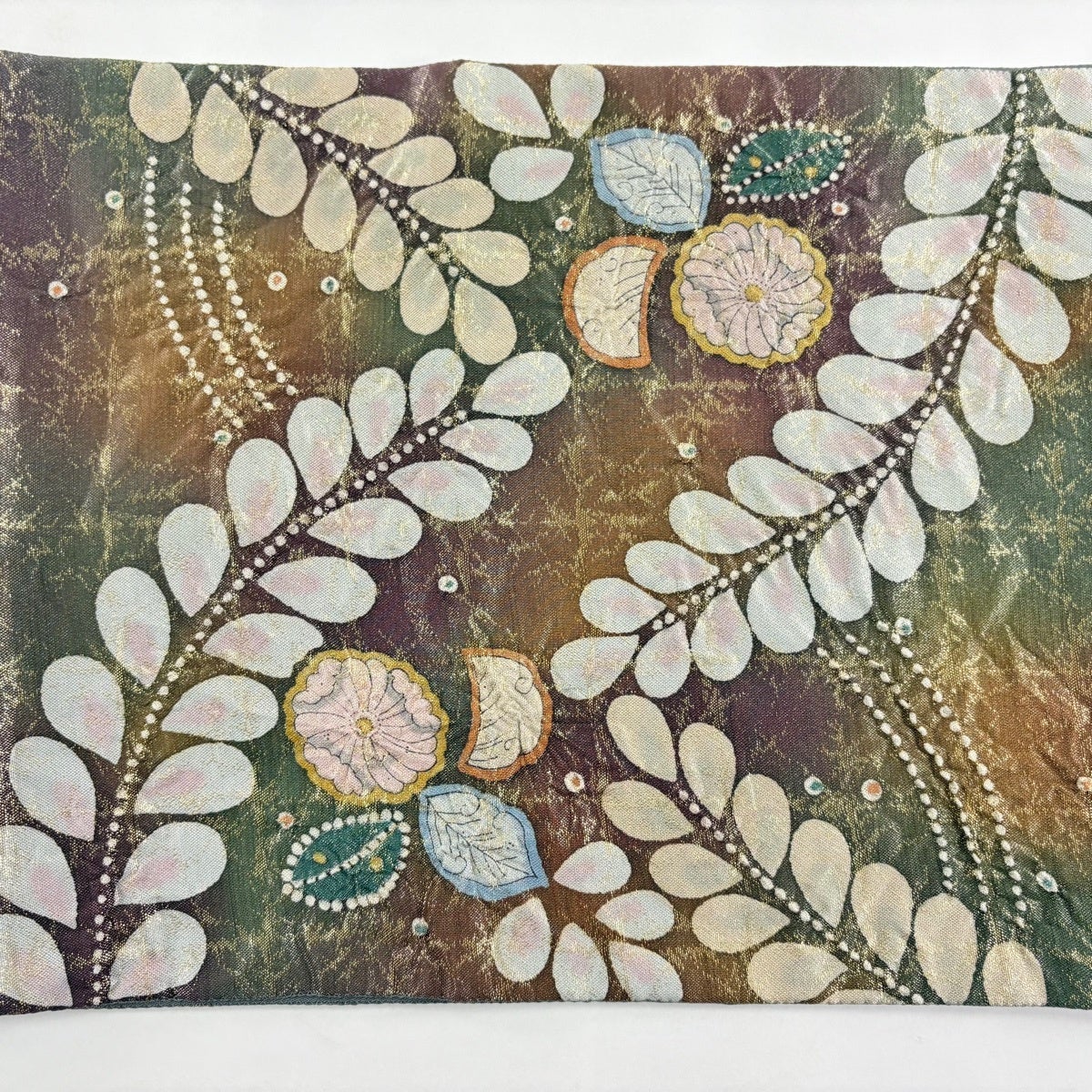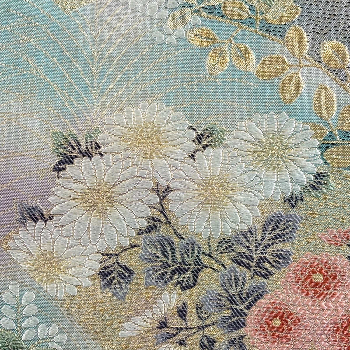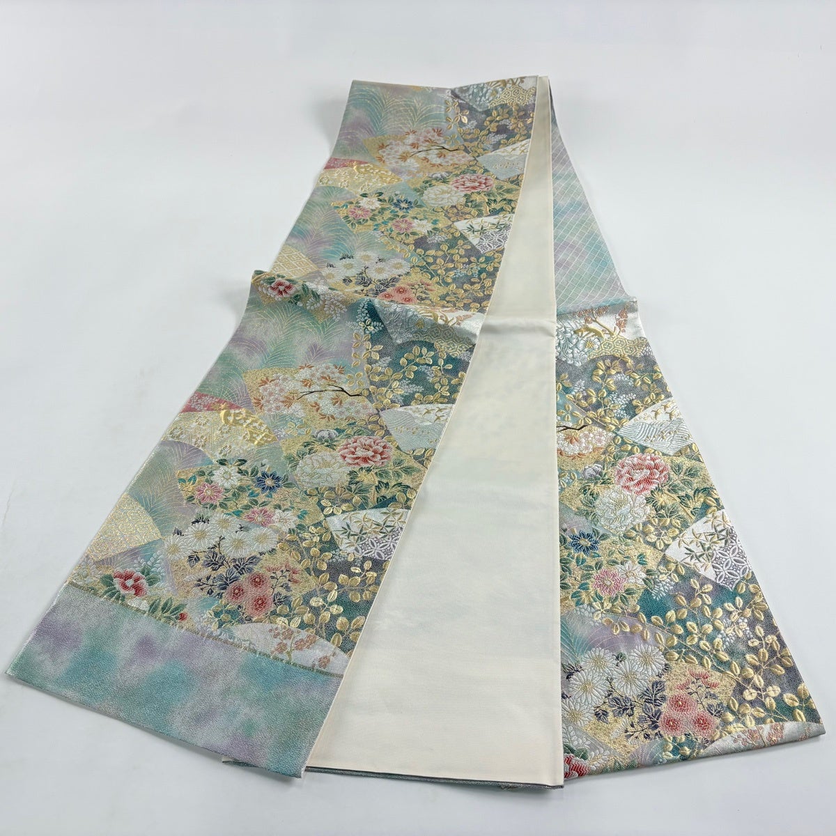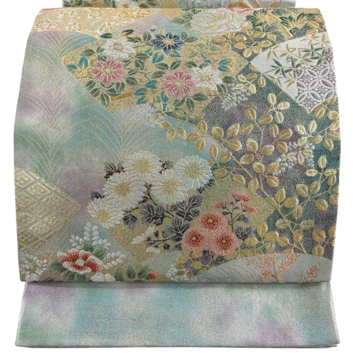 【美品】 袋帯 秀品 振袖向き 雪輪 草花 金銀糸 箔 薄緑 六通 正絹
