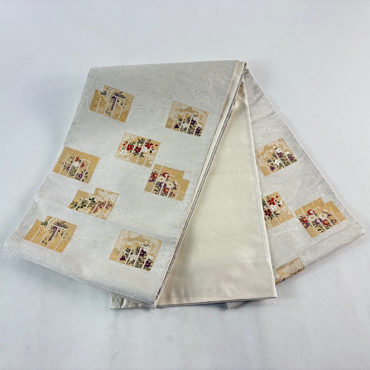 【美品】 袋帯 秀品 花鳥 蜀江華文 銀糸 箔 ベージュ 六通 正絹