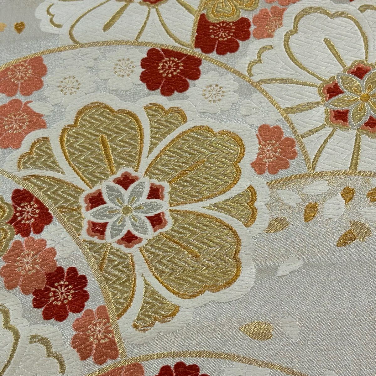 【美品】 袋帯 秀品 振袖向き 桜 波 金銀糸 箔 クリーム 六通 正絹
