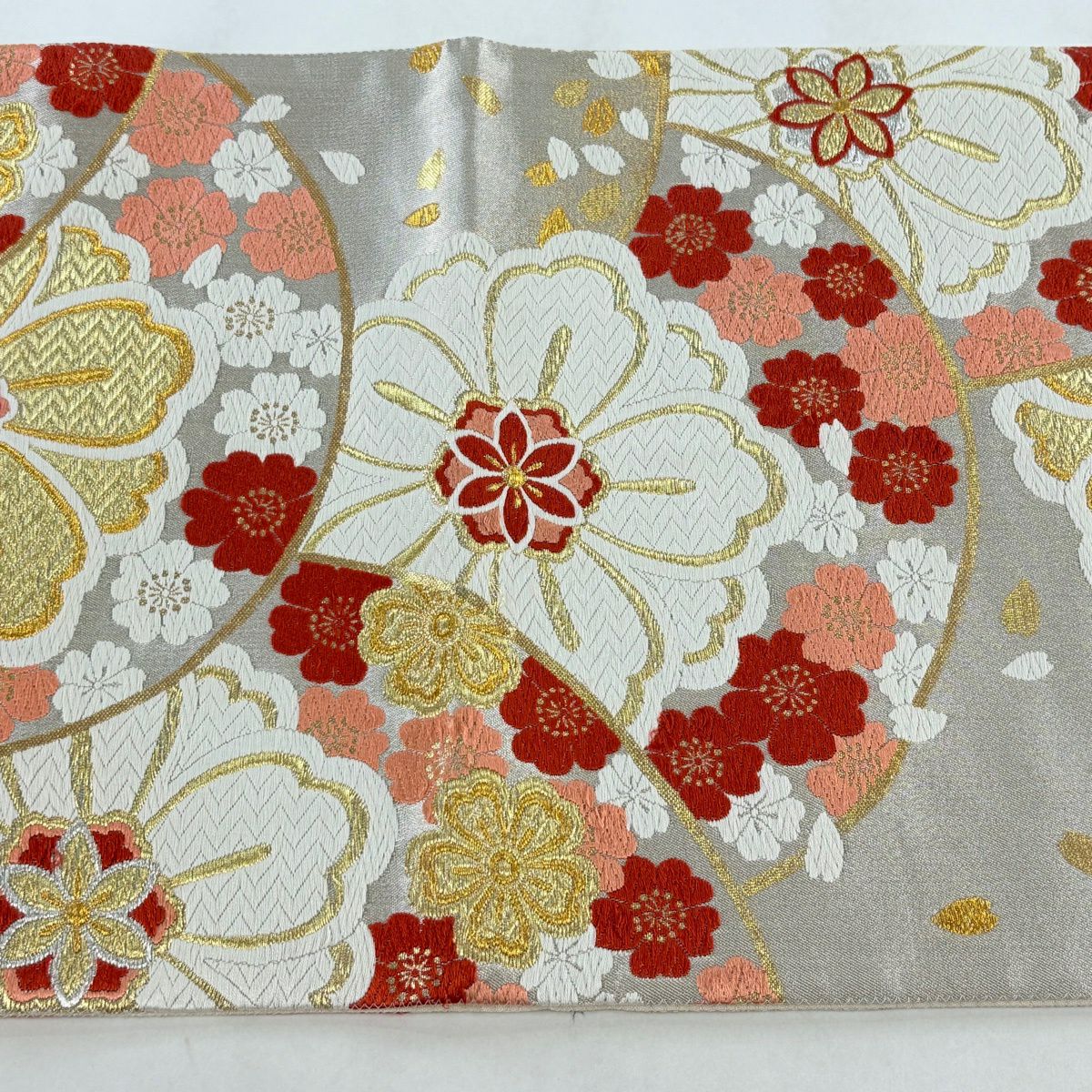 【美品】 袋帯 秀品 振袖向き 桜 流水 金糸 箔 クリーム 六通 正絹