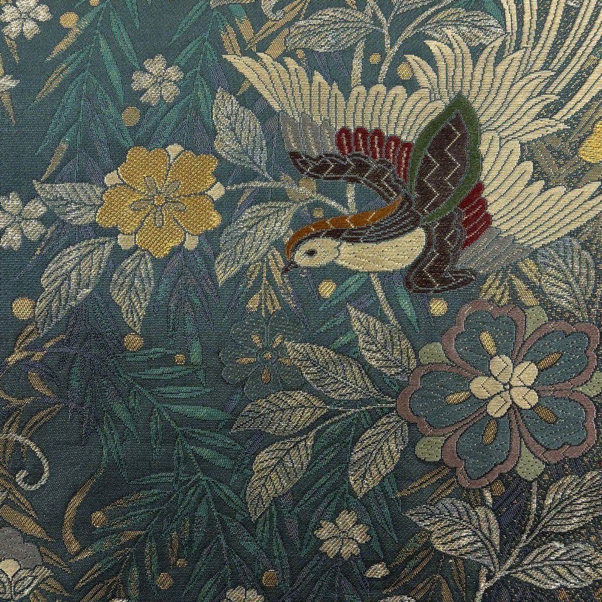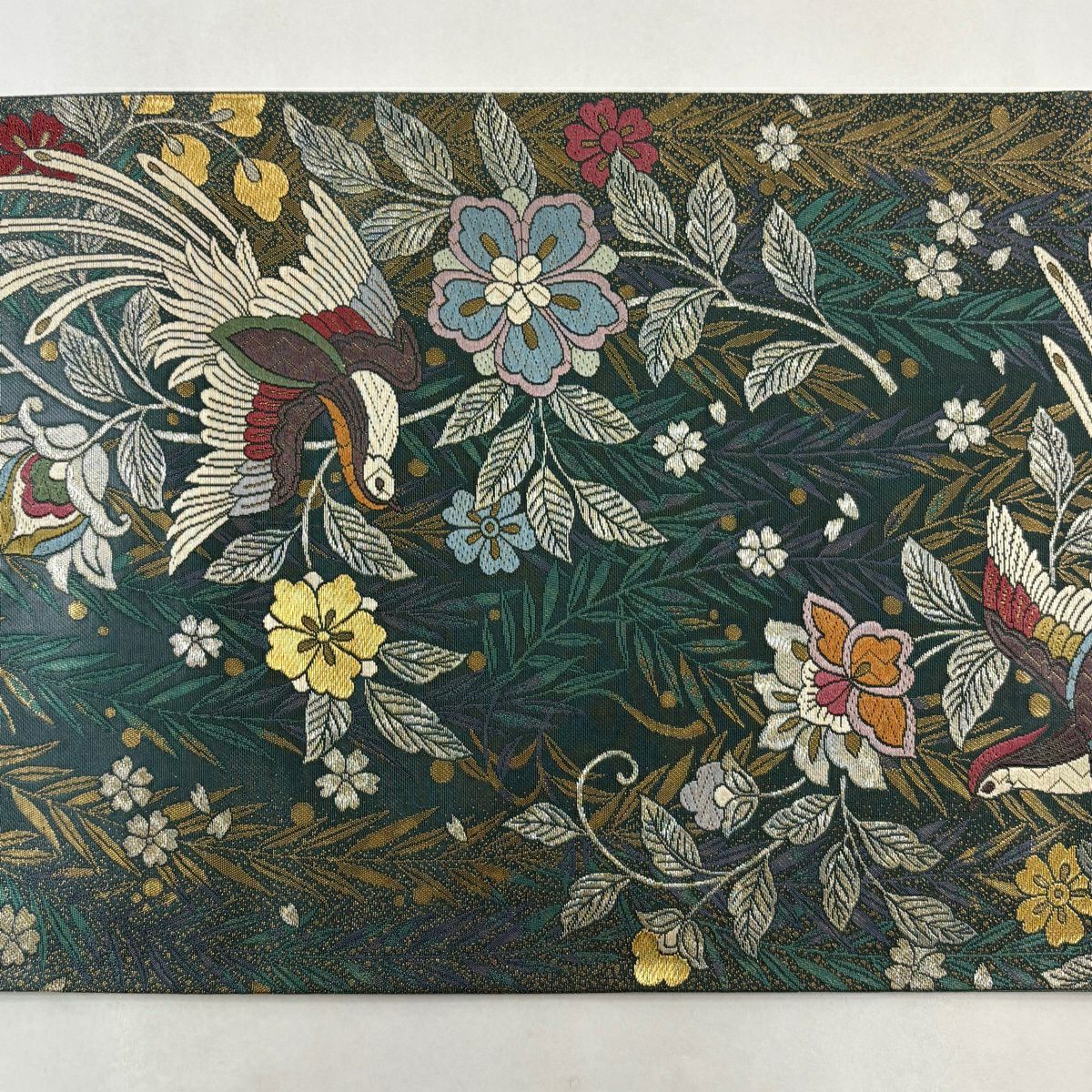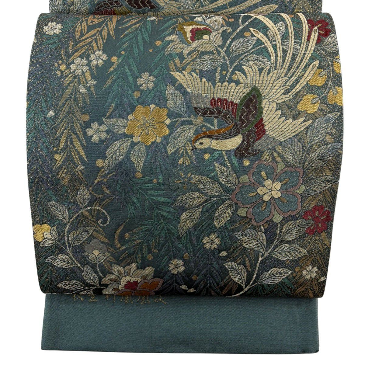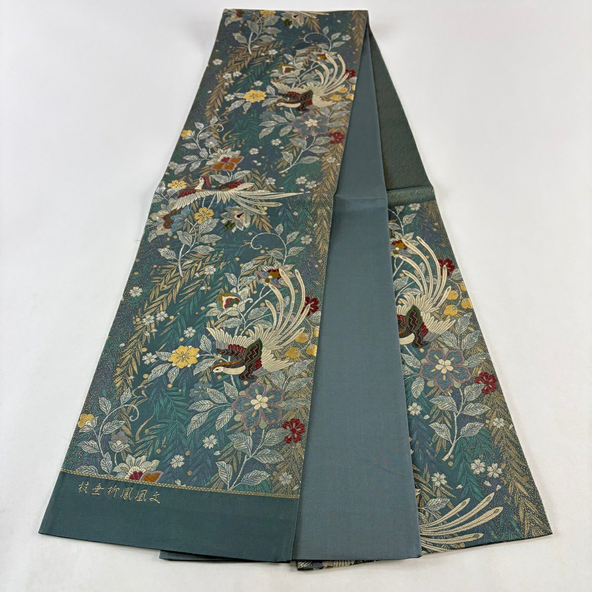 袋帯 秀品 唐三彩萌黄草木染 鳳凰 花唐草 金糸 箔 黄土色 六通 正絹