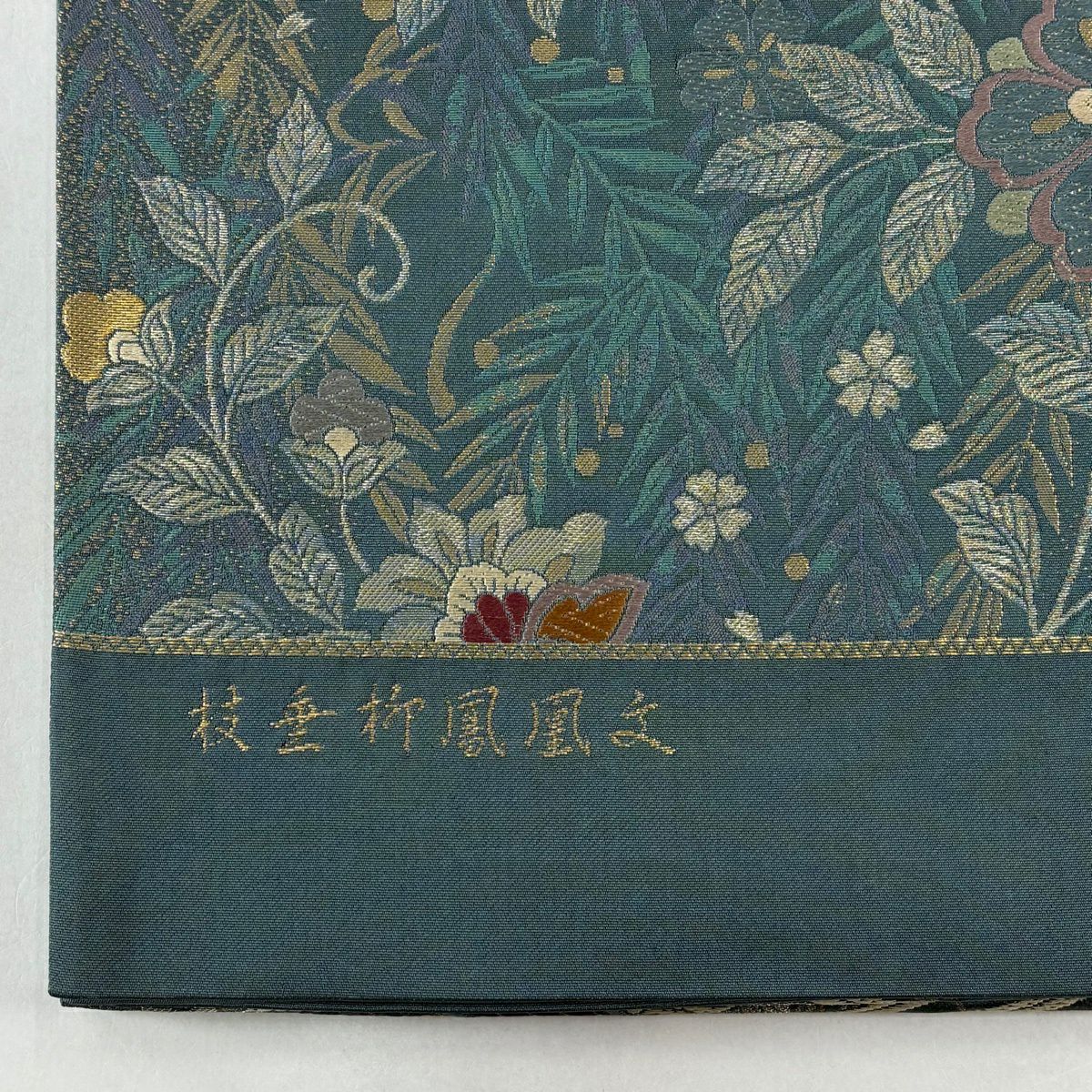 袋帯 秀品 名物裂文様集 花唐草 笹蔓 箔 金通し 灰緑 お太鼓柄 正絹