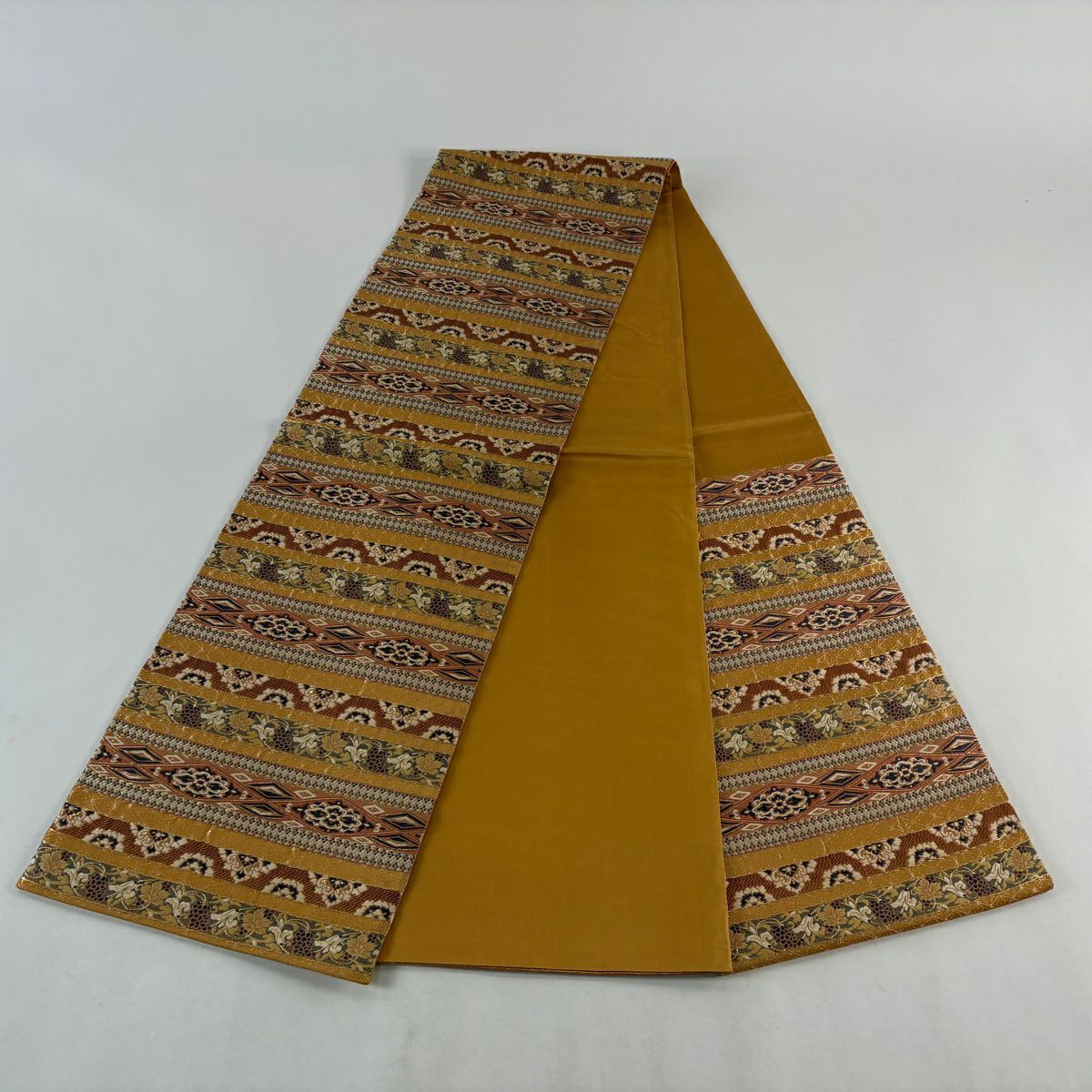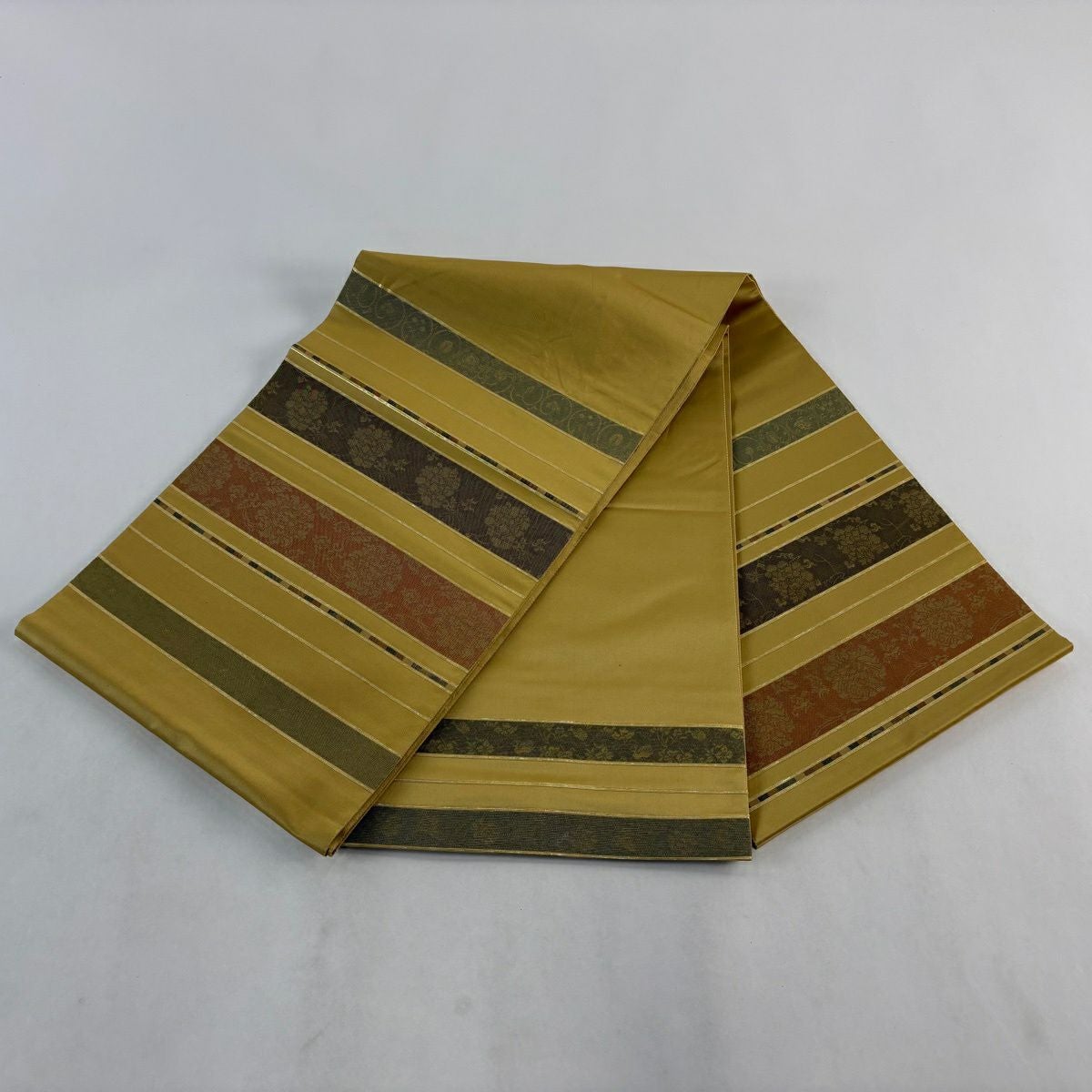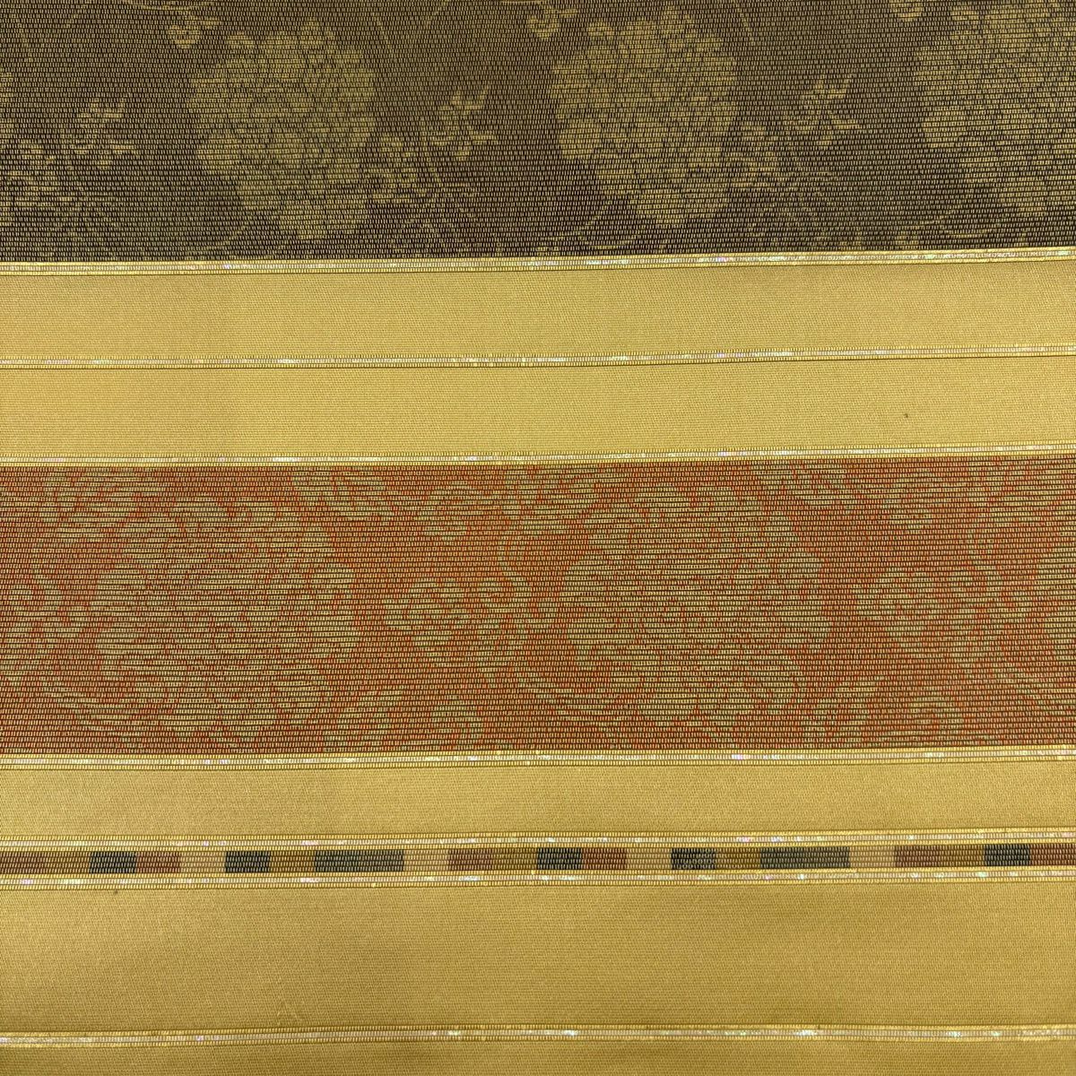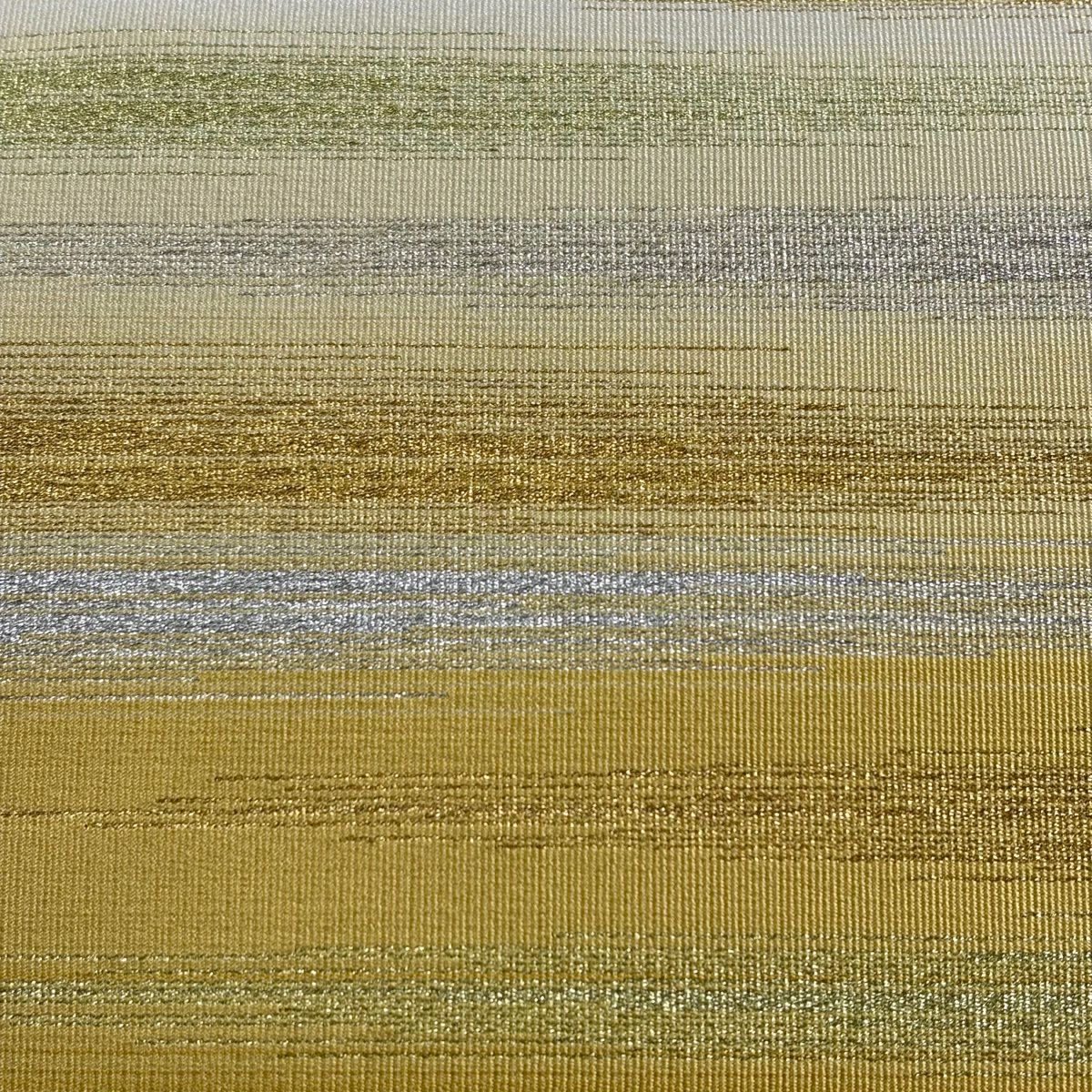【美品】 袋帯 秀品 花唐草 縞模様 螺鈿箔 箔 からし色 お太鼓柄 正絹