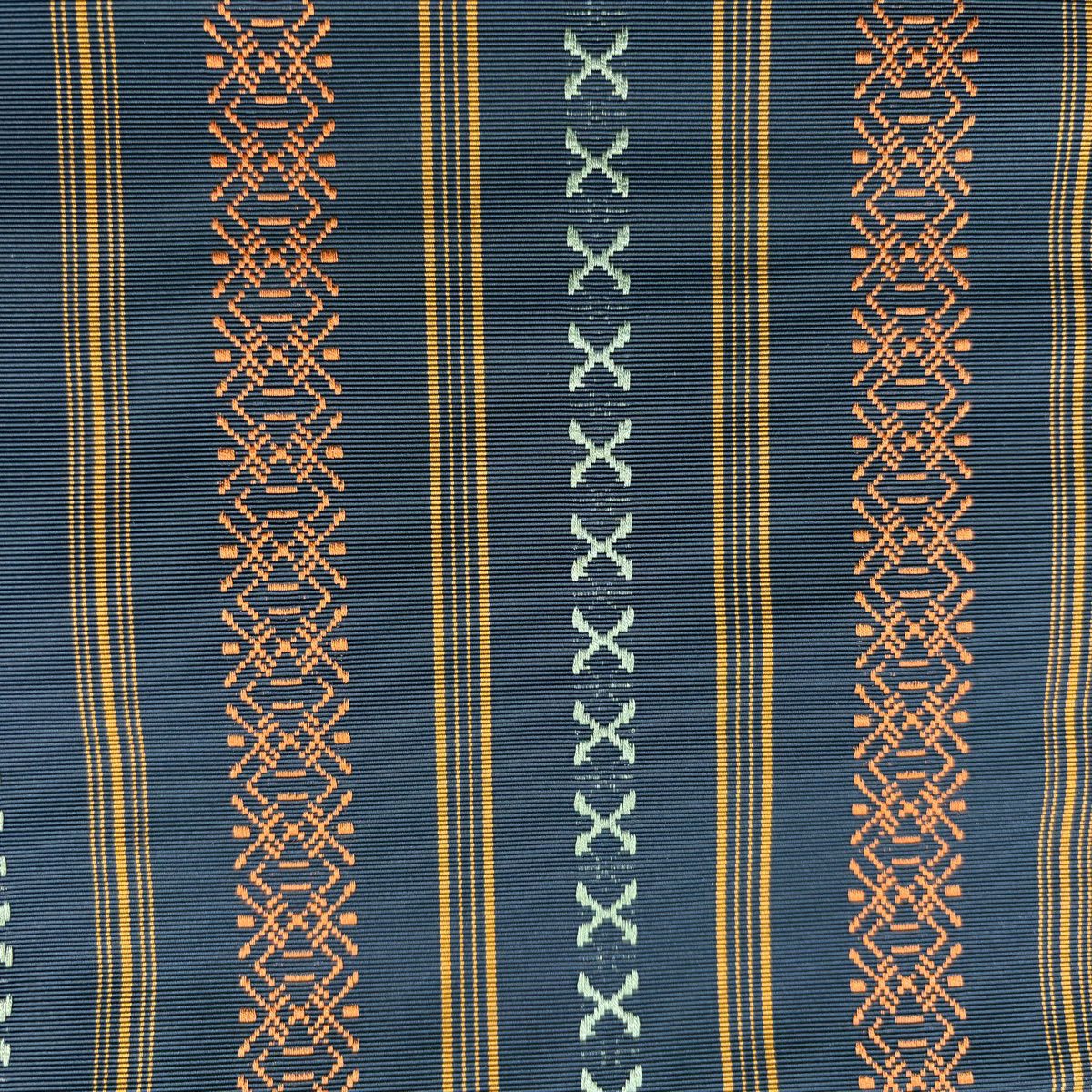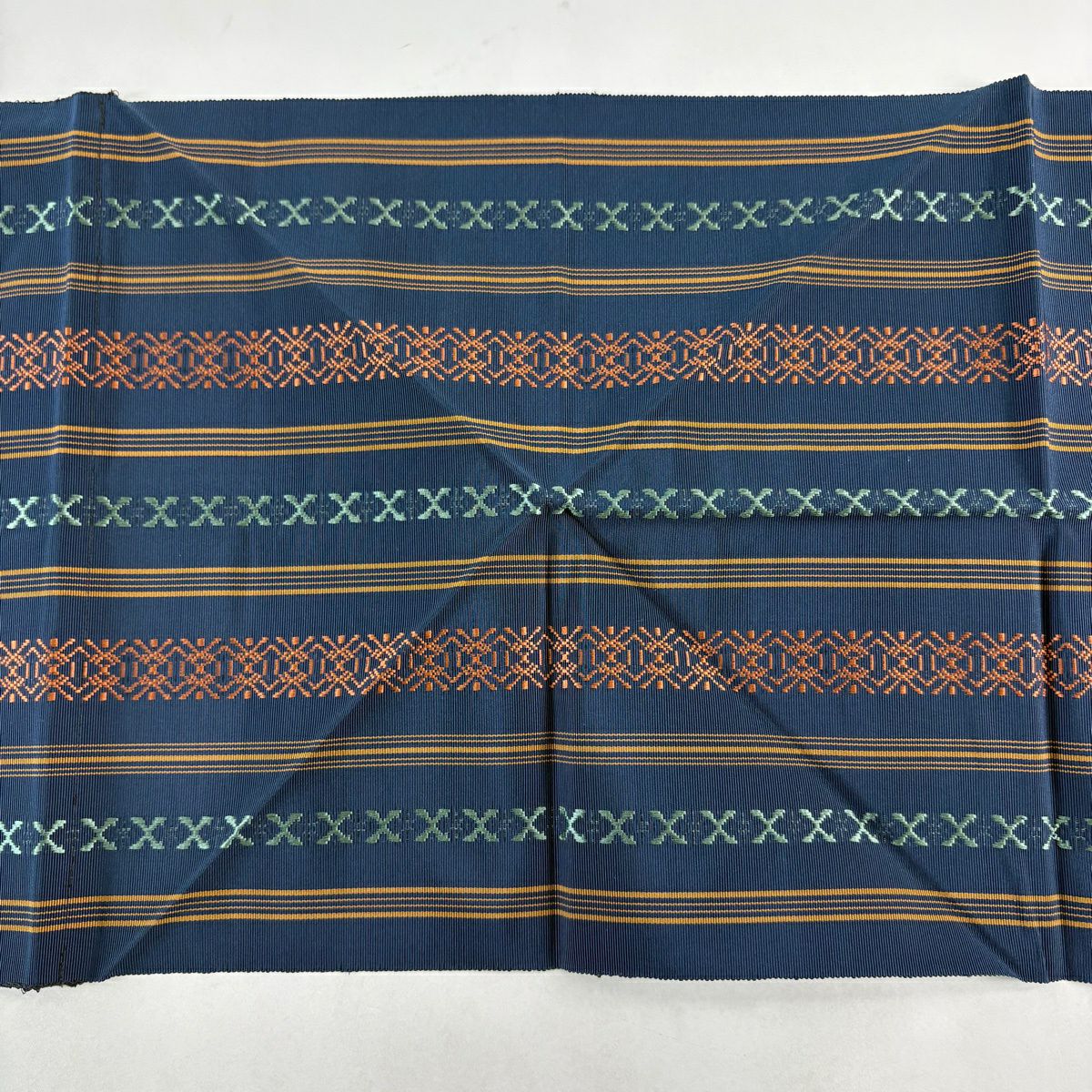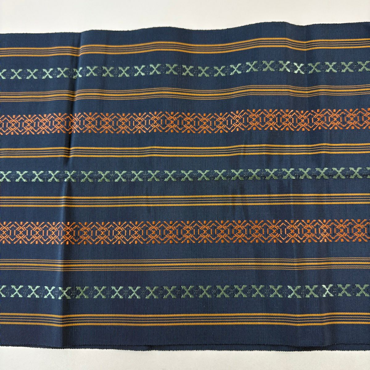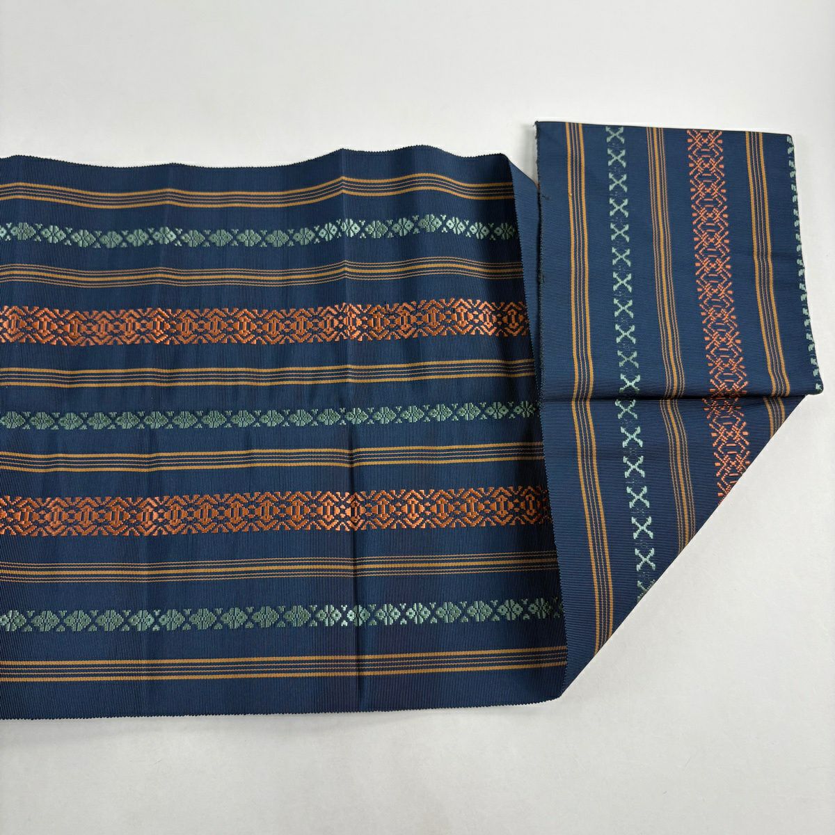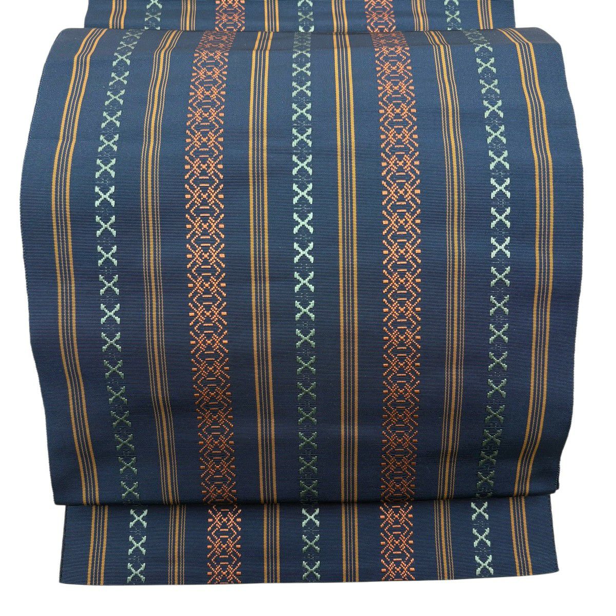 名古屋帯 秀品 松葉仕立て 八寸名古屋帯 トンネル仕立て 縞 幾何学模様 紺色 正絹