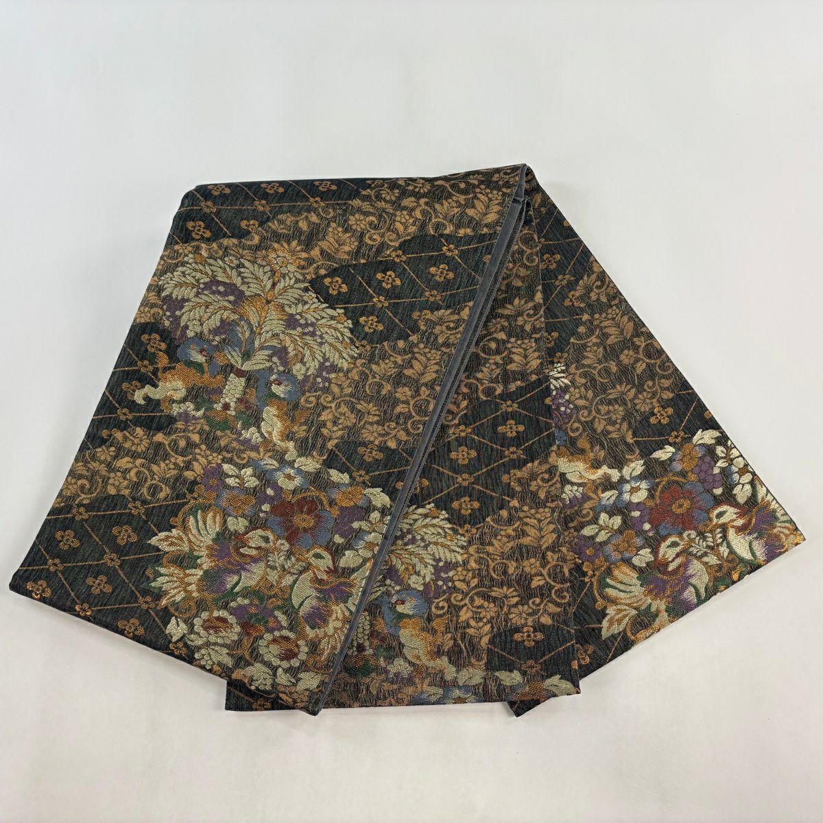 【美品】 袋帯 秀品 樹下双獣文 向かい鳥 箔 金糸 墨色 お太鼓柄 正絹