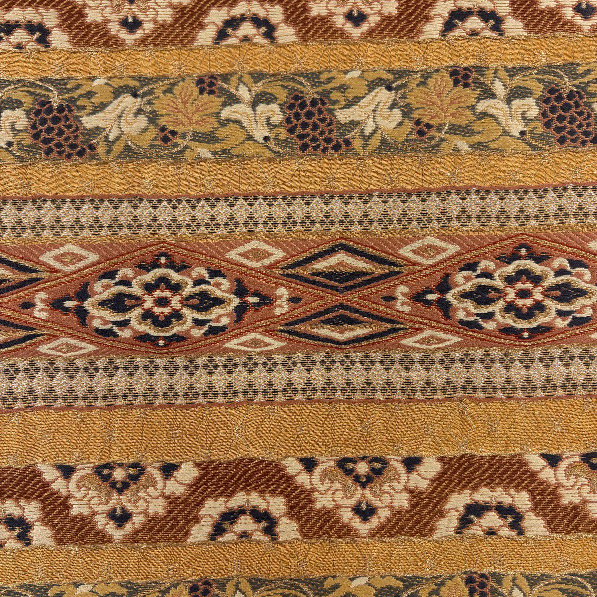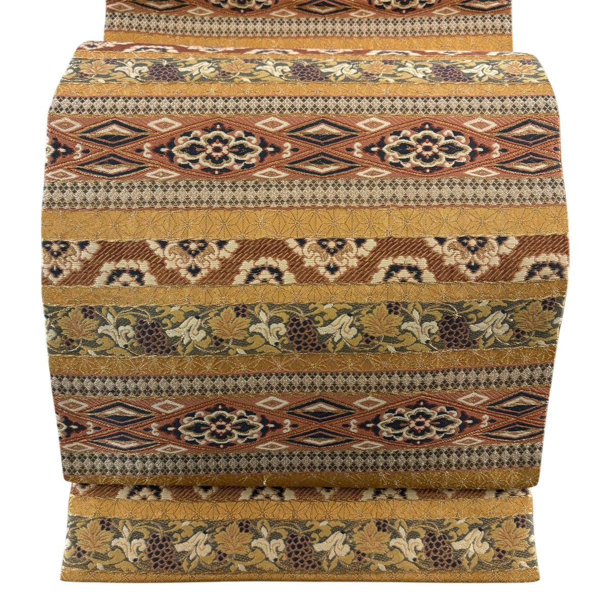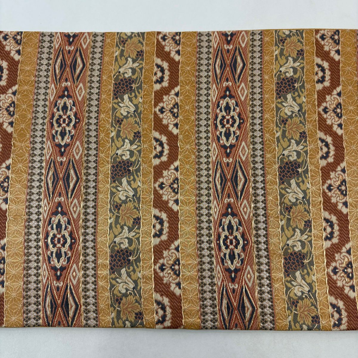 【美品】 袋帯 秀品 葡萄唐草 段縞模様 金糸 銀糸 山吹茶色 六通 正絹