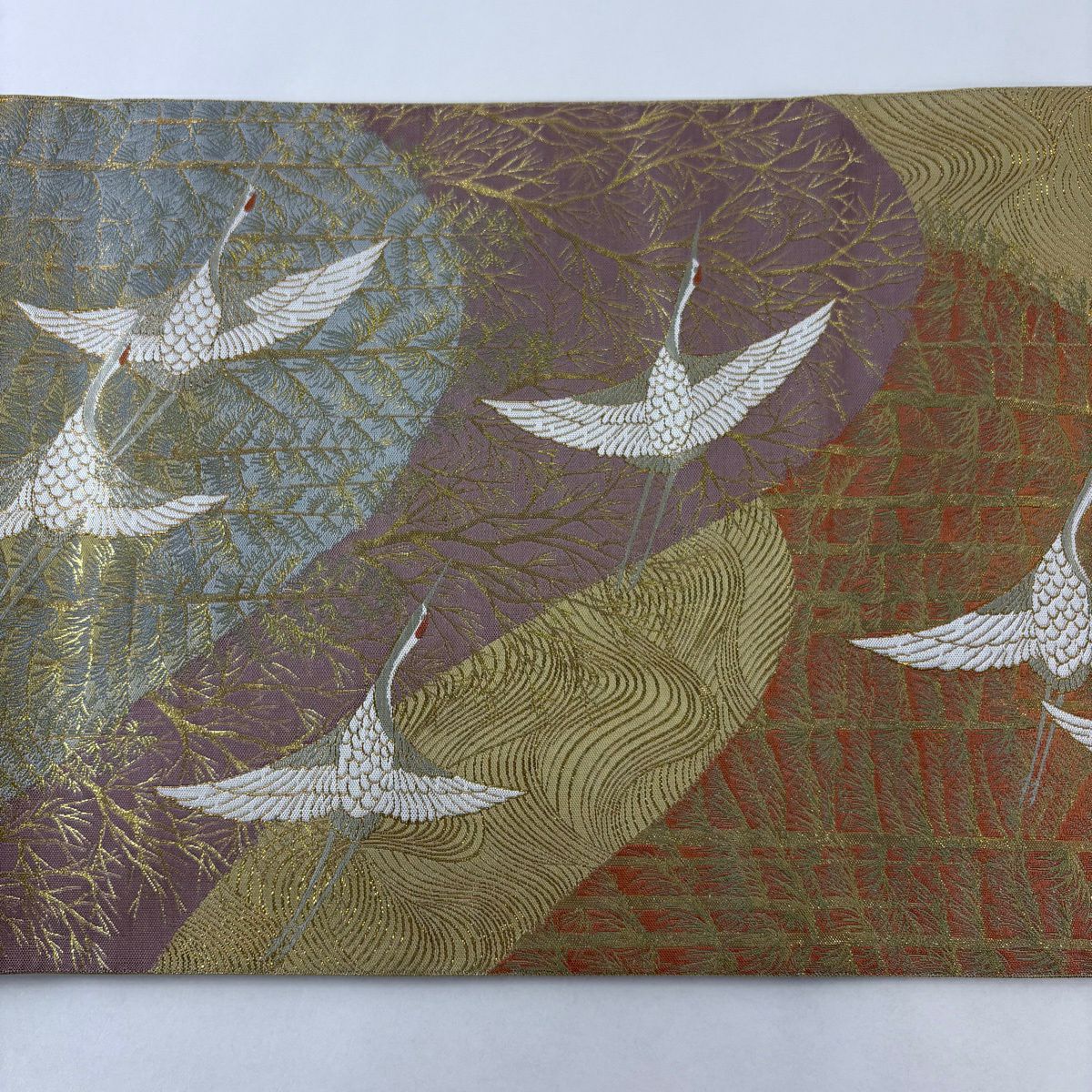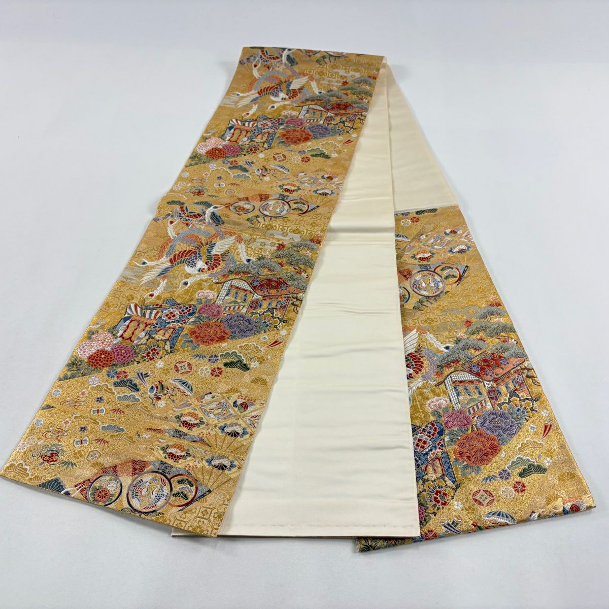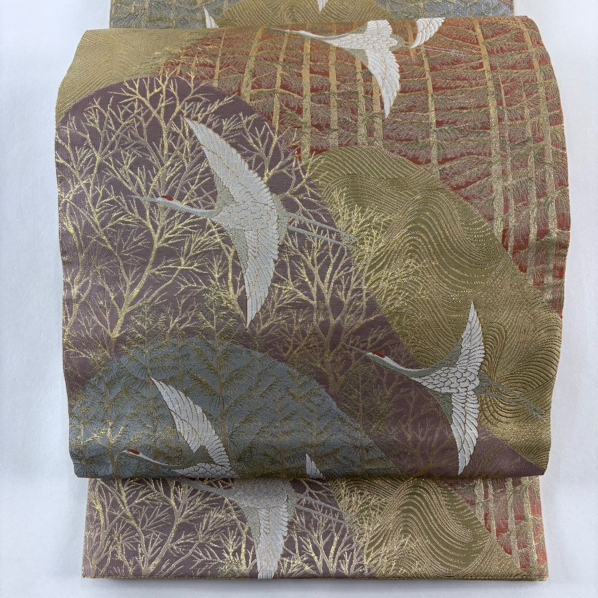 【美品】 袋帯 秀品 落款あり 藤三郎 鶴 山並み 箔 黄土色 六通 正絹